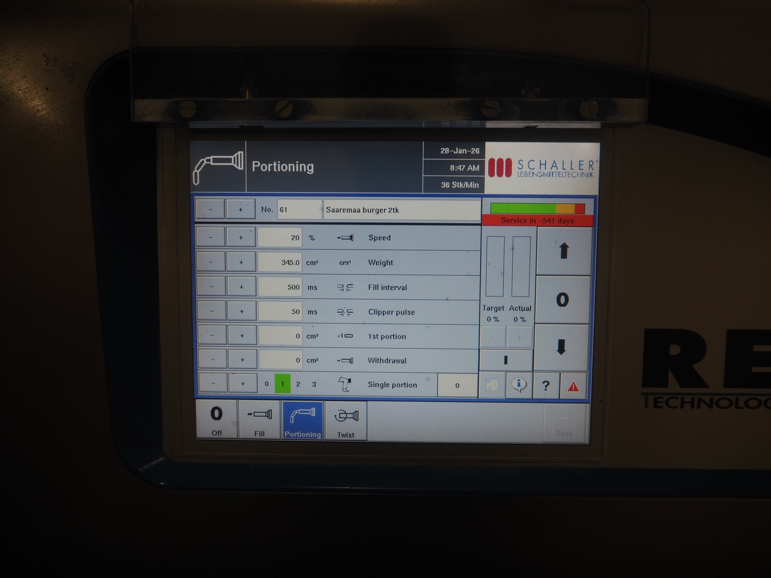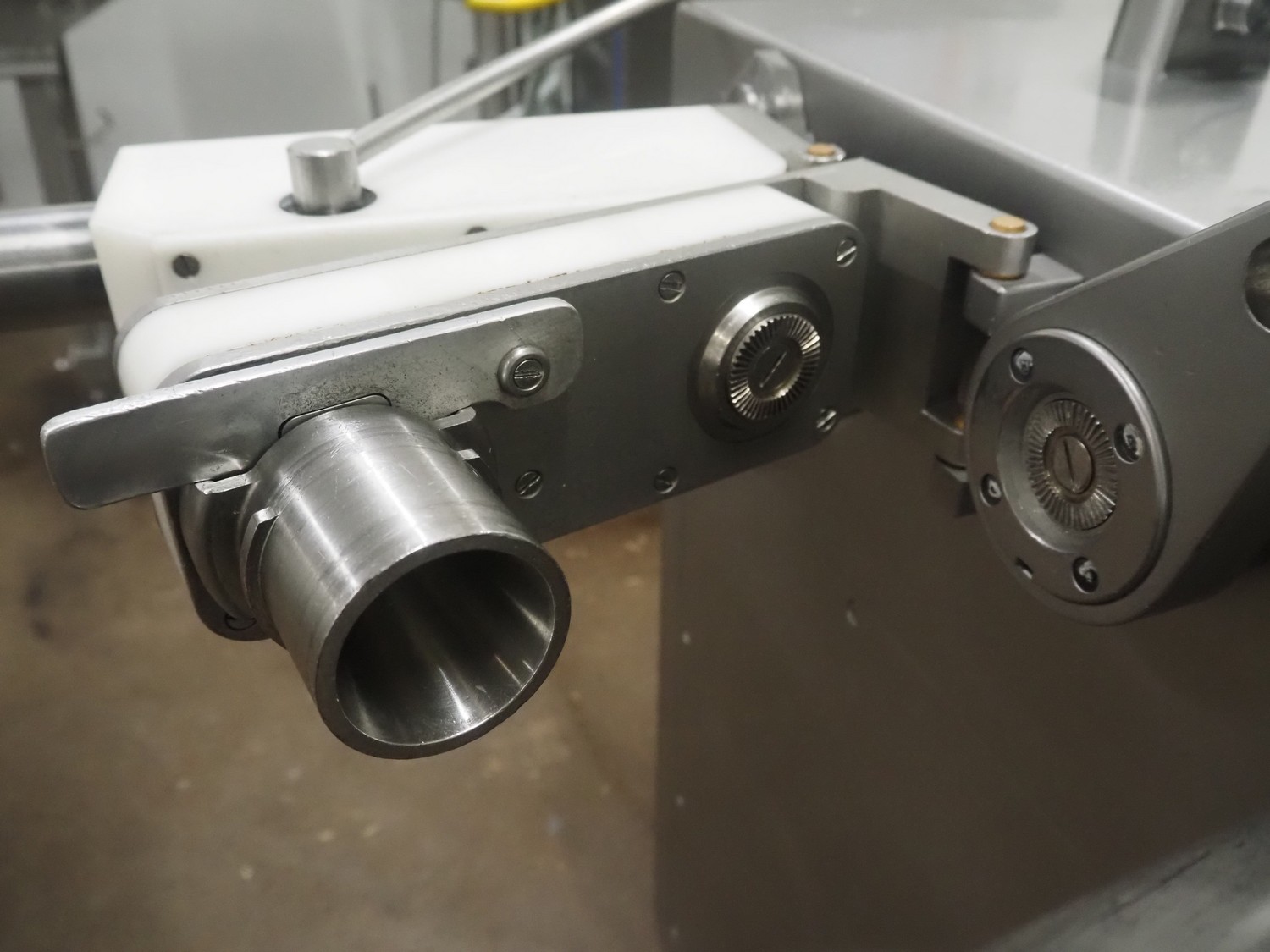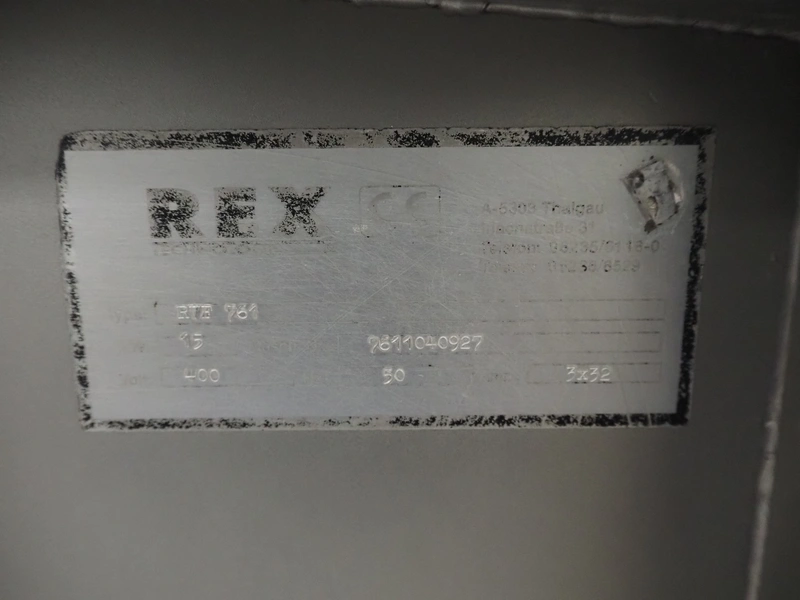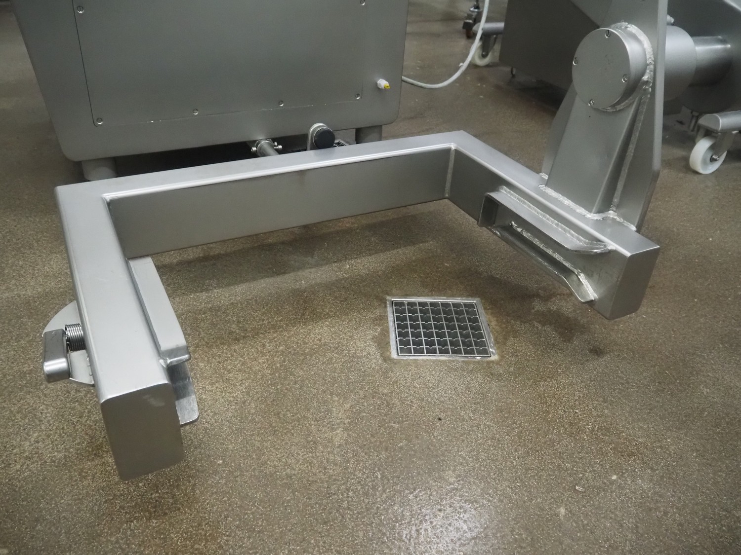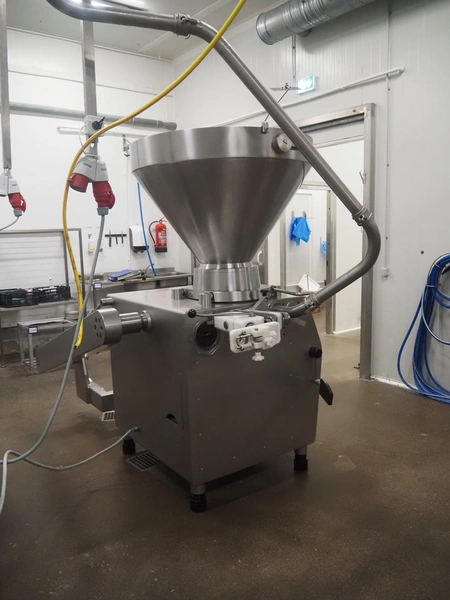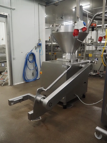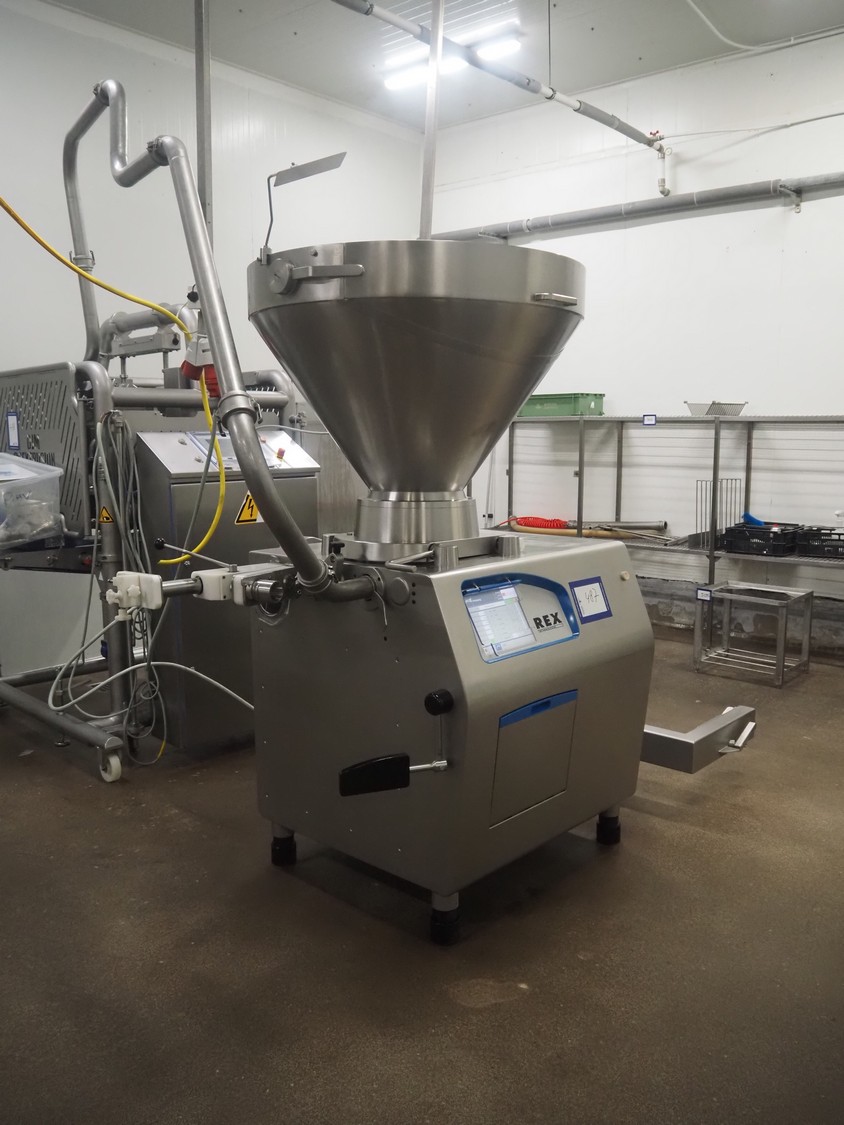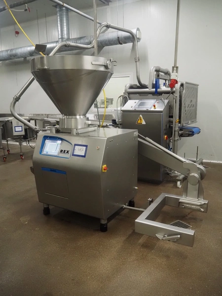 Rex Technologie vacuum filling machine with lifter for meat bins, type: RVF 761, serial number: 7611040927, 400 V, 3 Ph, 50 Hz, 32 A, 15 kW, filling, portioning and linking, with Busch vacuum pump, dimensions: 2300 mm x 1300 mm x 2050 mm, including linking device.