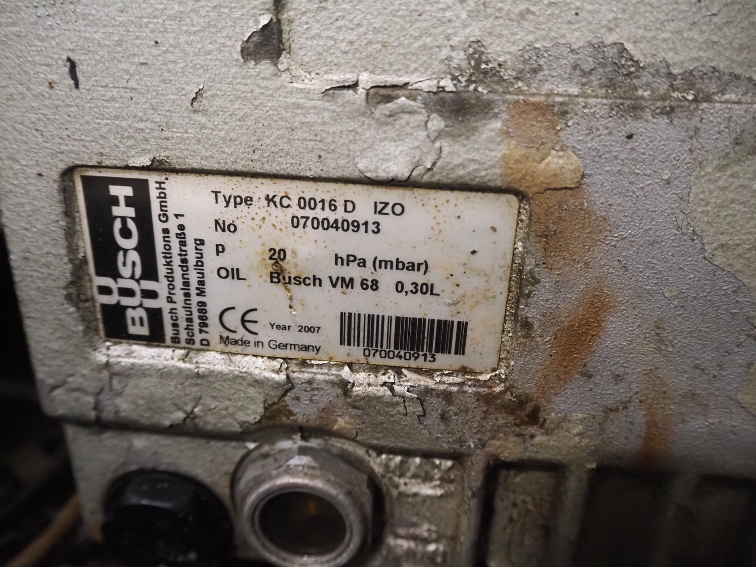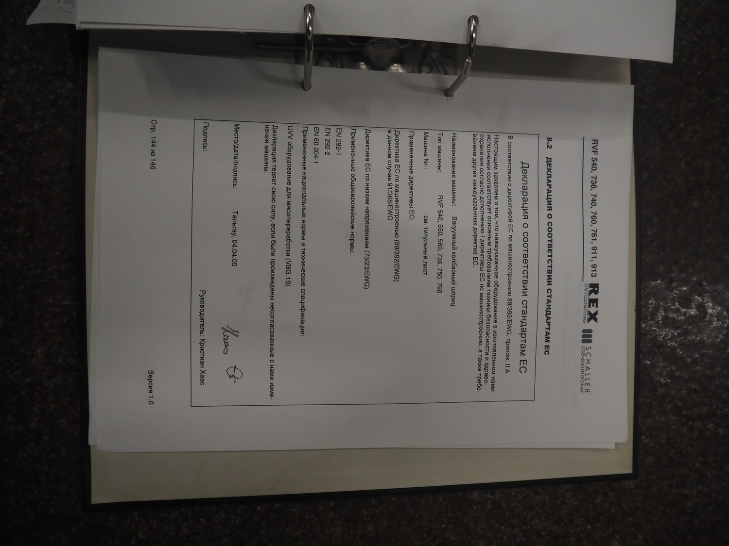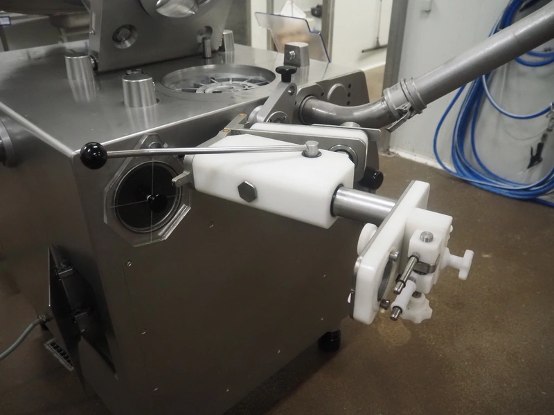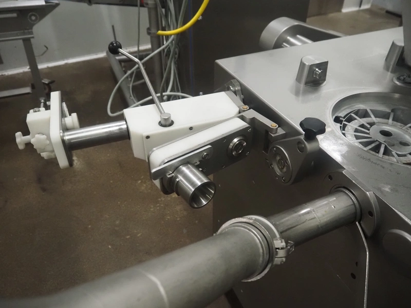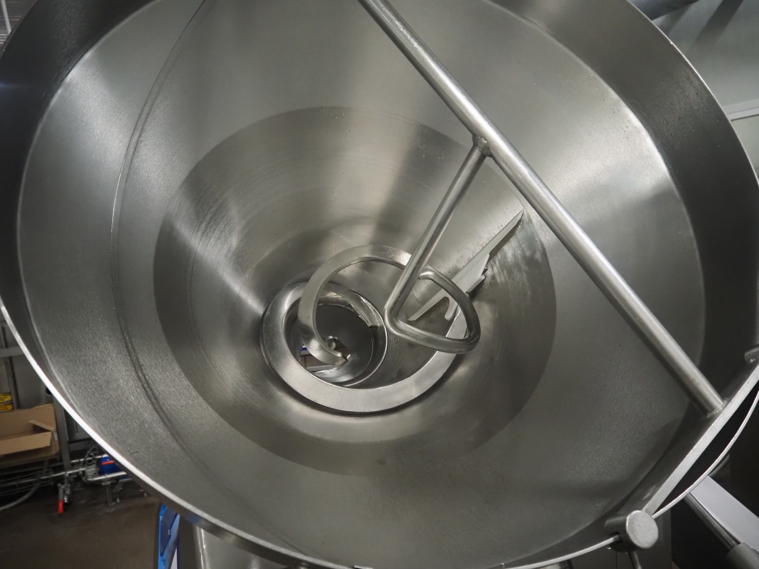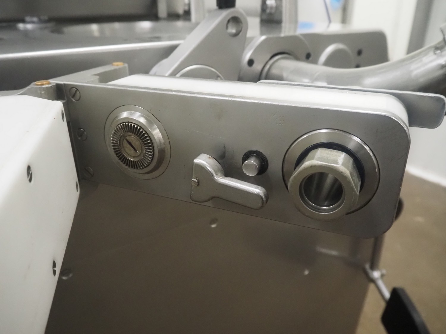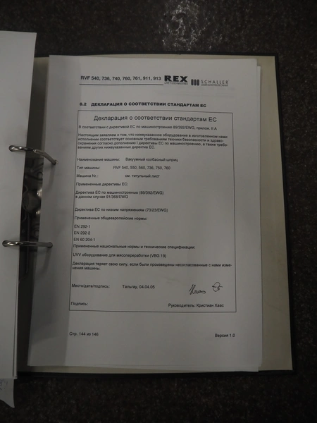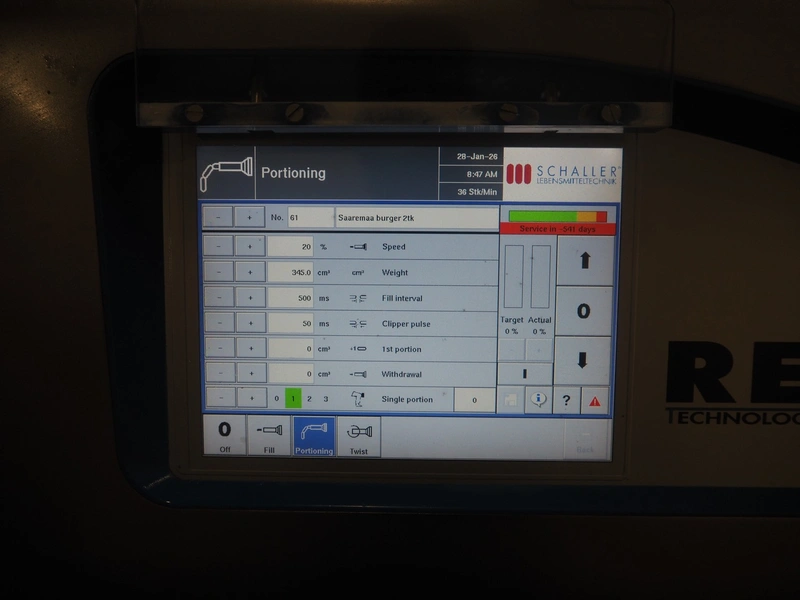 Rex Technologie vacuum filling machine with lifter for meat bins, type: RVF 761, serial number: 7611040927, 400 V, 3 Ph, 50 Hz, 32 A, 15 kW, filling, portioning and linking, with Busch vacuum pump, dimensions: 2300 mm x 1300 mm x 2050 mm, including linking device.