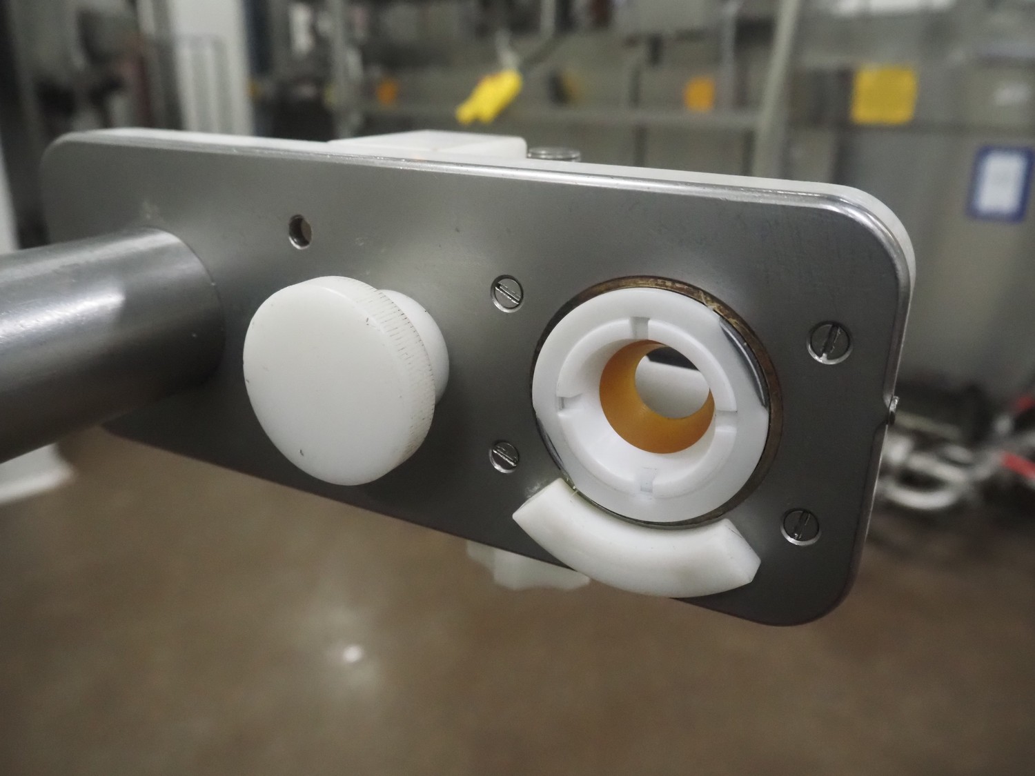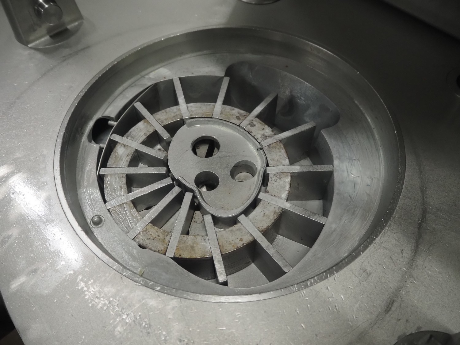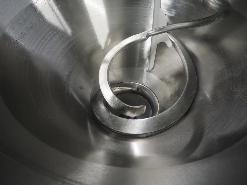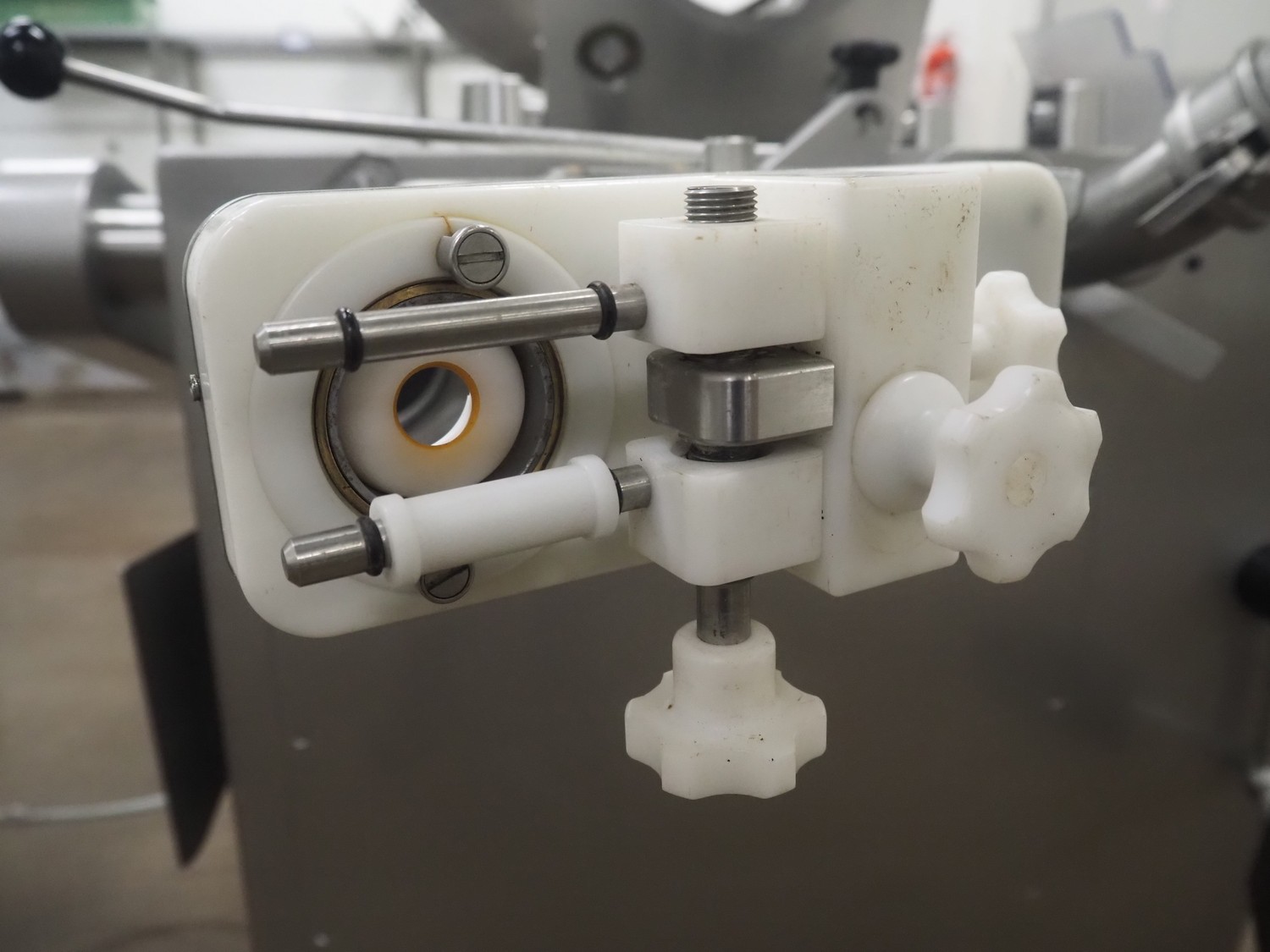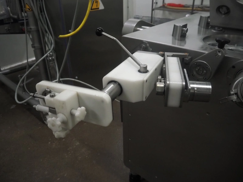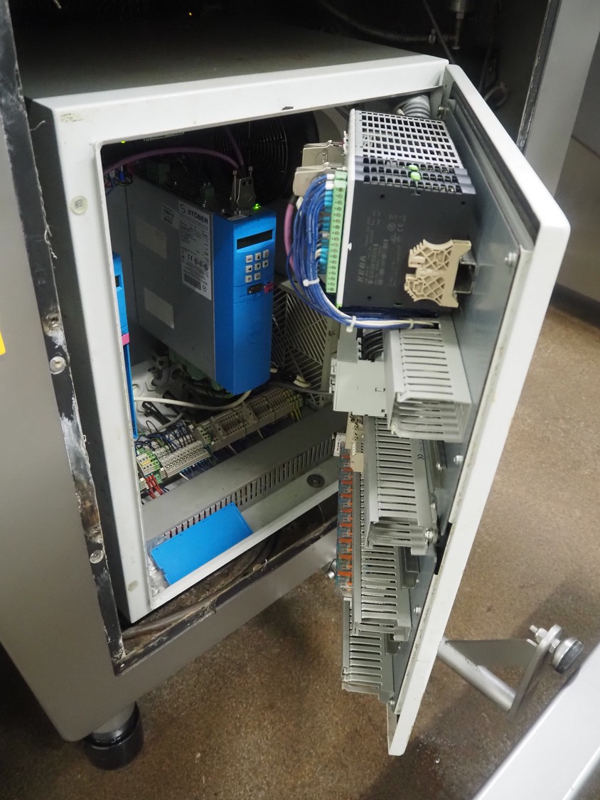 Rex Technologie vacuum filling machine with lifter for meat bins, type: RVF 761, serial number: 7611040927, 400 V, 3 Ph, 50 Hz, 32 A, 15 kW, filling, portioning and linking, with Busch vacuum pump, dimensions: 2300 mm x 1300 mm x 2050 mm, including linking device.