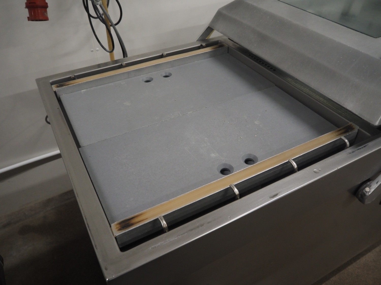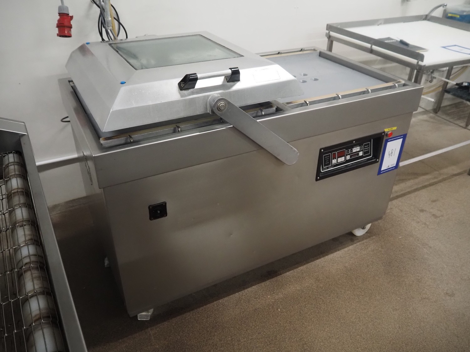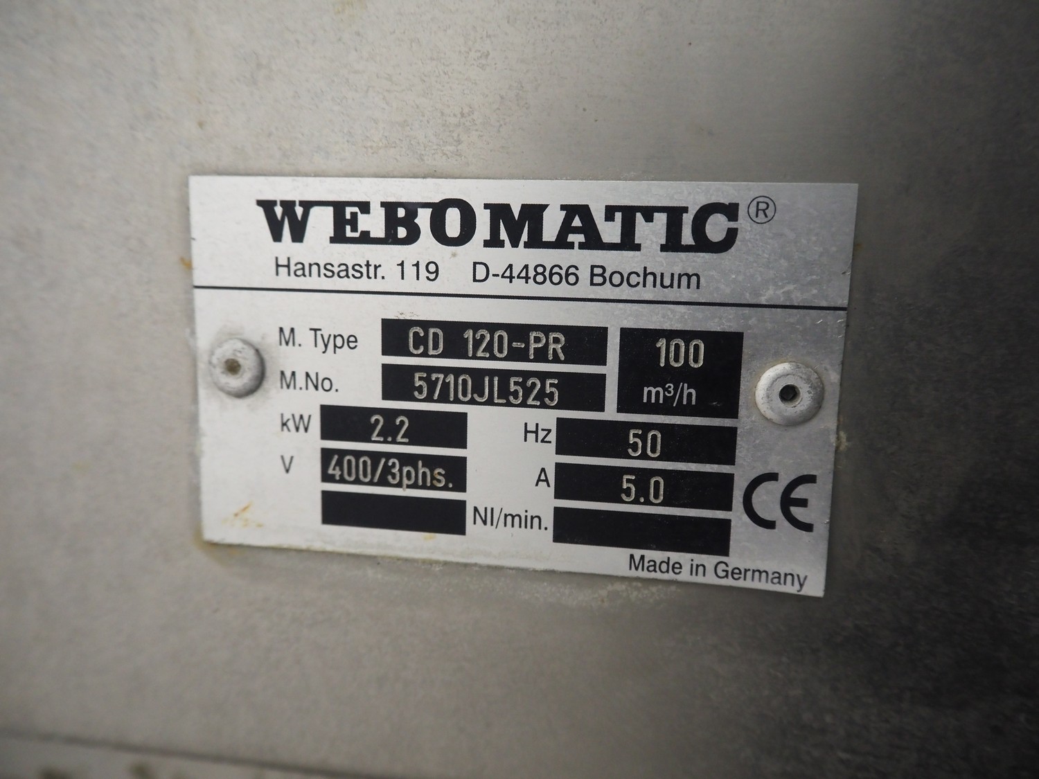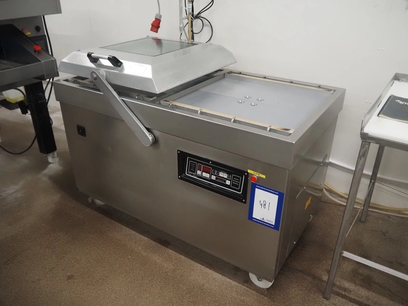 Webomatic mobile double chamber vacuum machine, type: CD 120-PR, machine number: 5710JL525, 400 V, 3 Ph, 50 Hz, 5.0 A, 2.2 kW, seal length: (2x) 640 mm, dimensions chamber: (2x) 650 mm x 570 mm, with Busch vacuum pump, total dimensions: 1420 mm x 840 mm x 1060 mm.