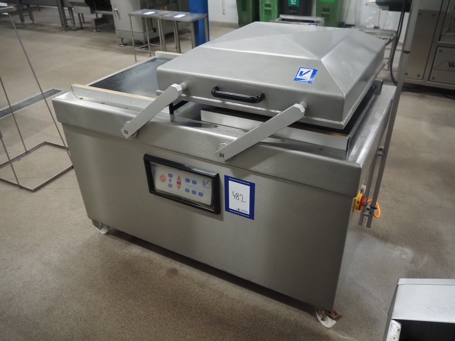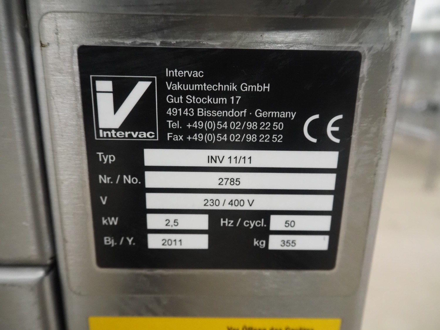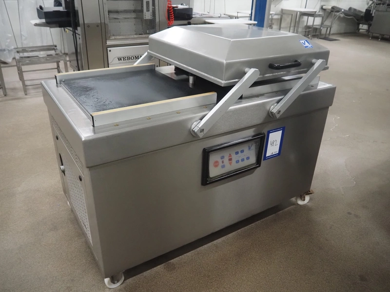 Intervac Vakuumtechnik GmbH mobile double chamber vacuum machine, type: INV 11/11, number: 2785, year of construction: 2011, 230/400 V, 50 Hz, 2.5 kW, weight: 355 kg, seal length: (2x) 620 mm, dimensions chamber: (2x) 600 mm x 670 mm, total dimensions: 1550 mm x 970 mm x 1220 mm.