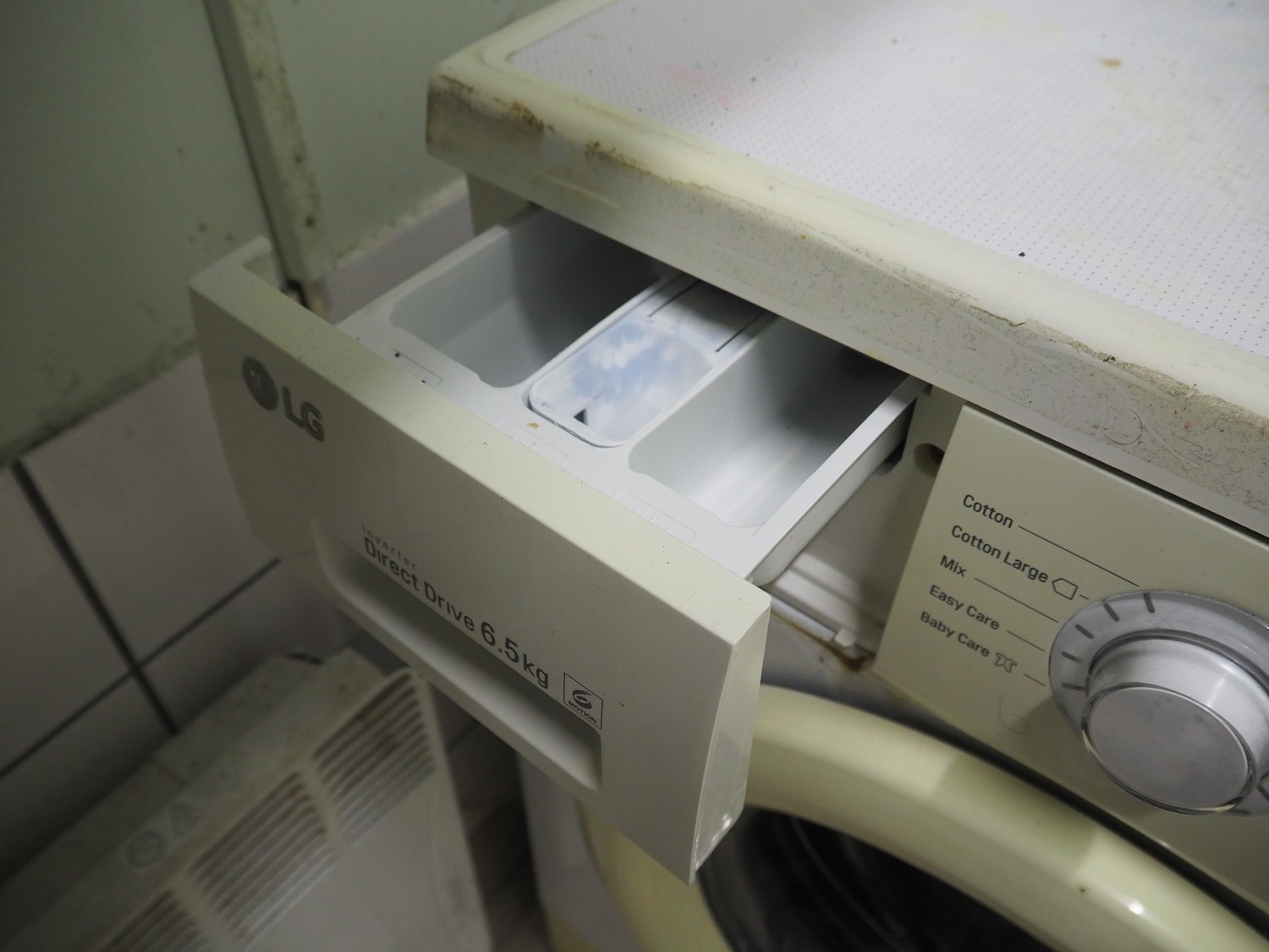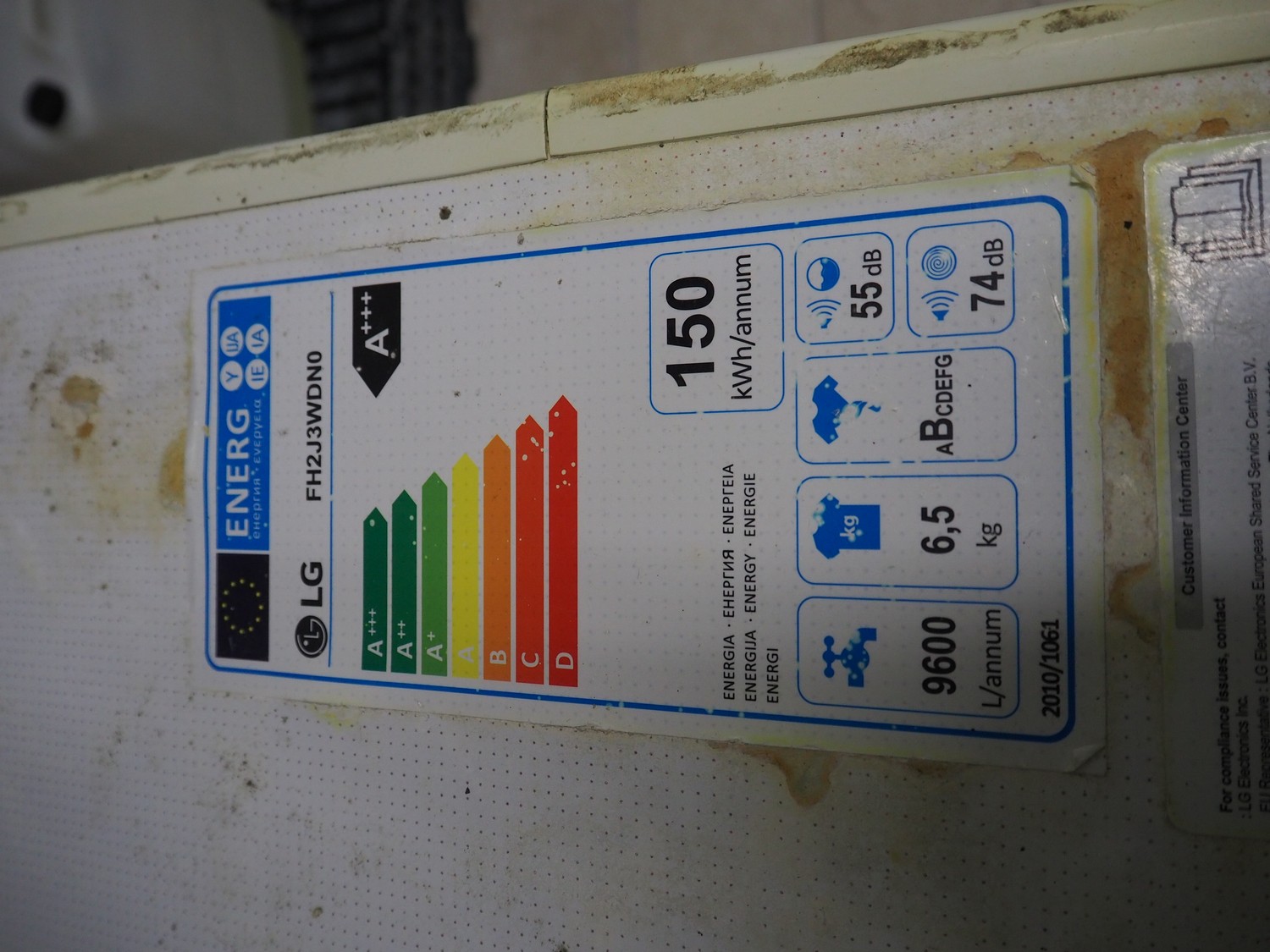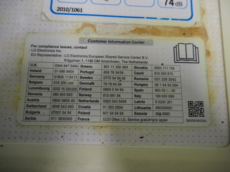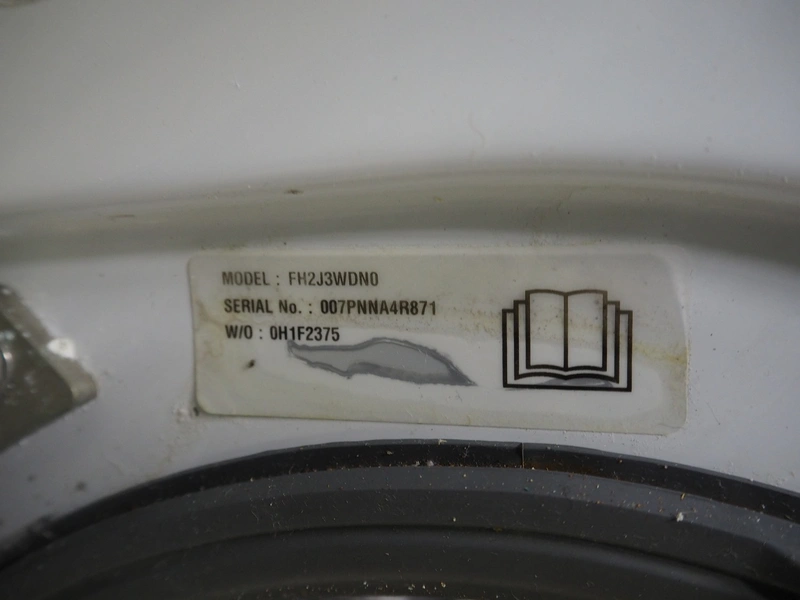 LG washing machine, model: FH2J3WDN0, serial number: 007PNNA4R871, dimensions: 600 mm x 450 mm x 850 mm.