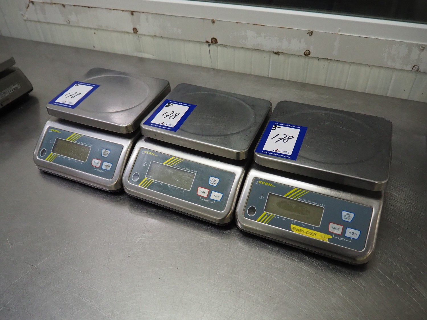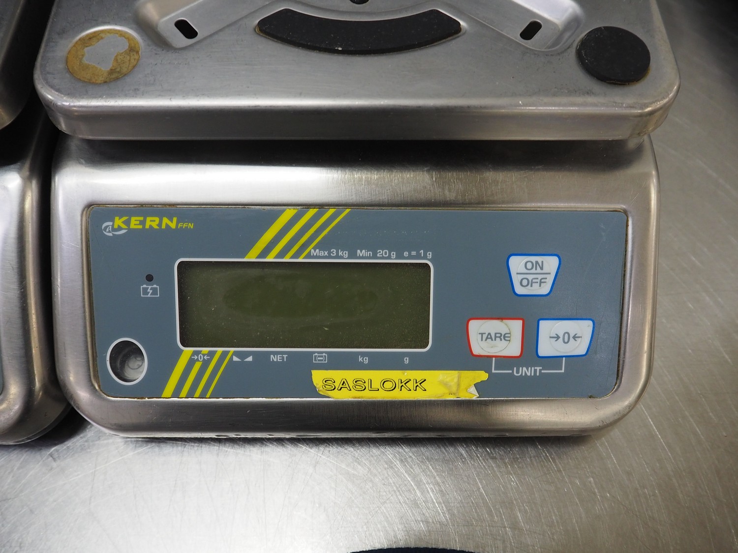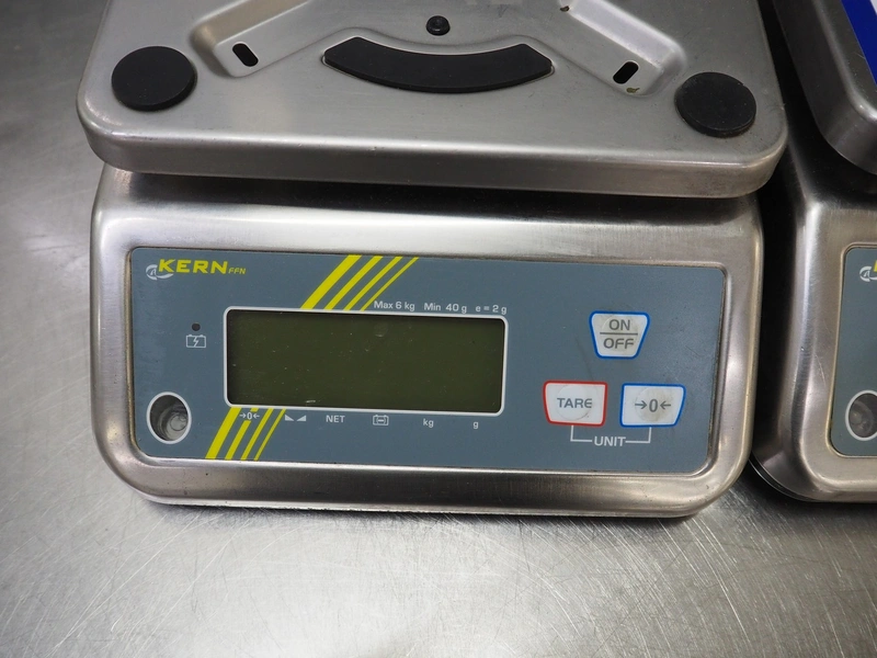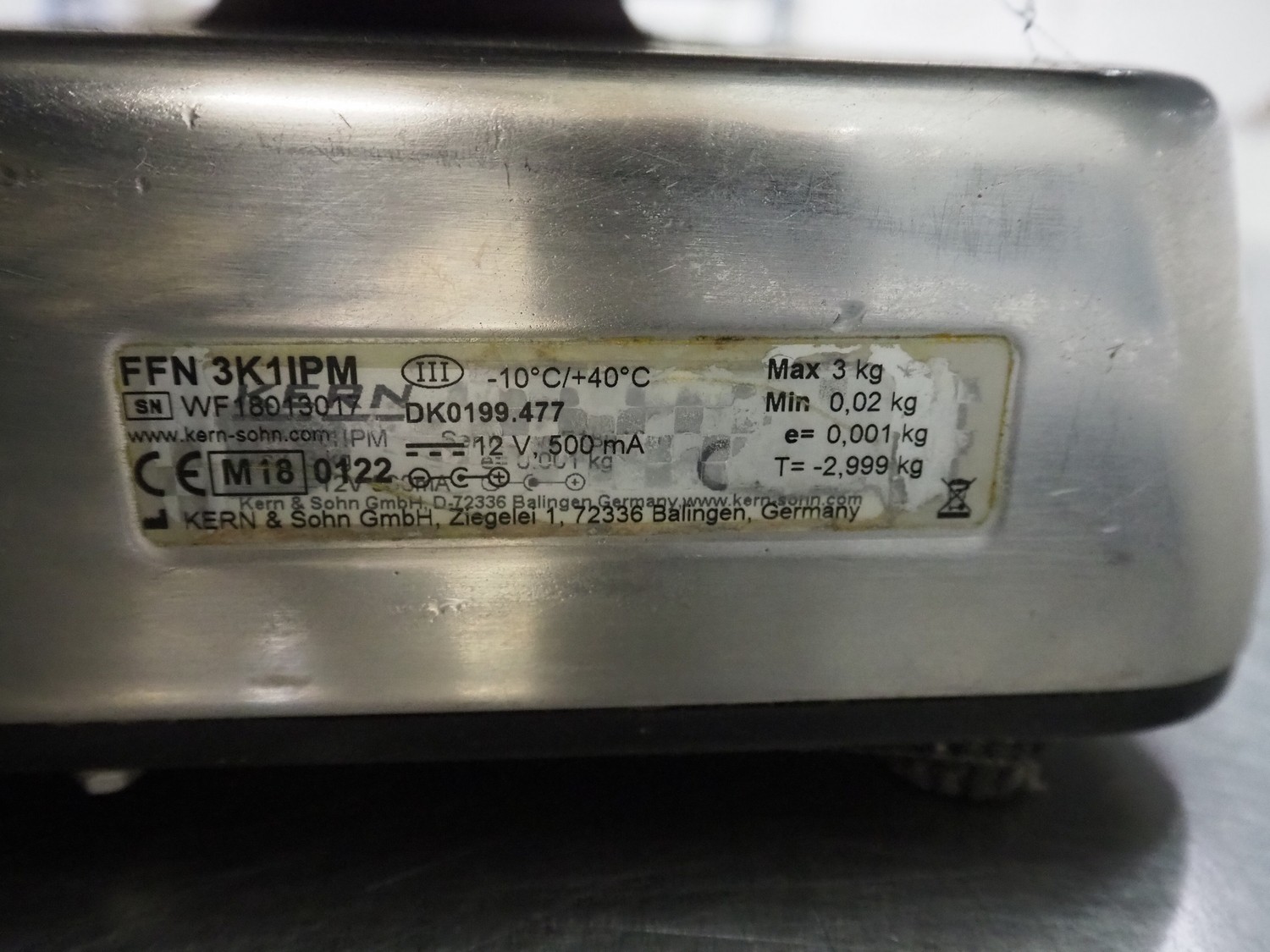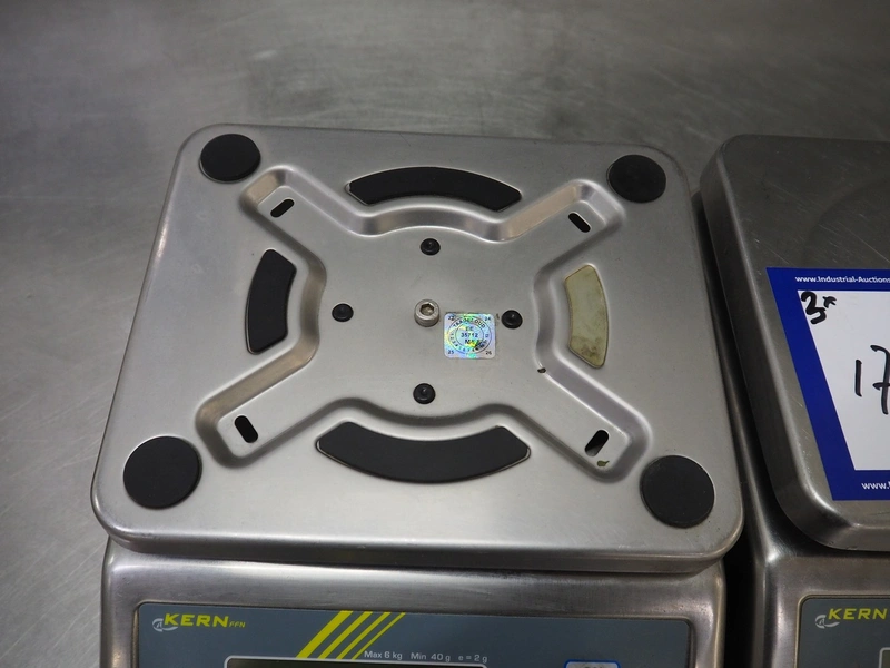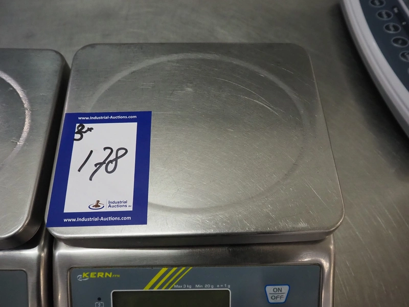 3 Kern & Sohn GmbH weighing scales, model: FFN 3K1IPM, serial number: WF18013017 / WF18012976 / WF18030196, 12 V, 500 mA, maximum weight: 3 kg, minimum weight: 0.02 kg, e = 0.001 kg, T = -2.999 kg, dimensions scale: 230 mm x 190 mm, total dimensions: (3x) 300 mm x 240 mm x 130 mm.