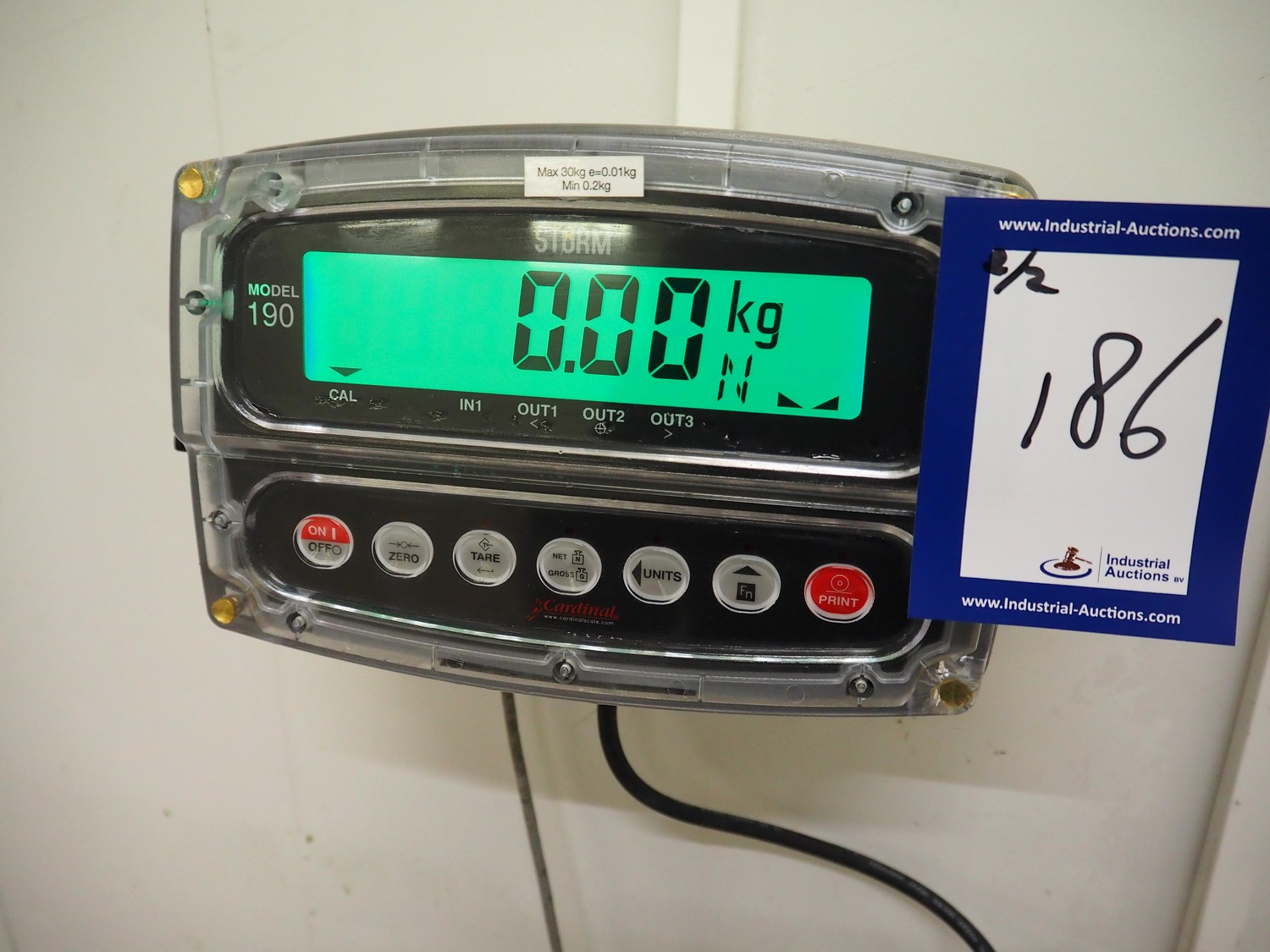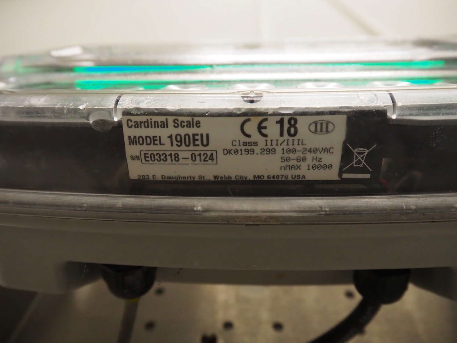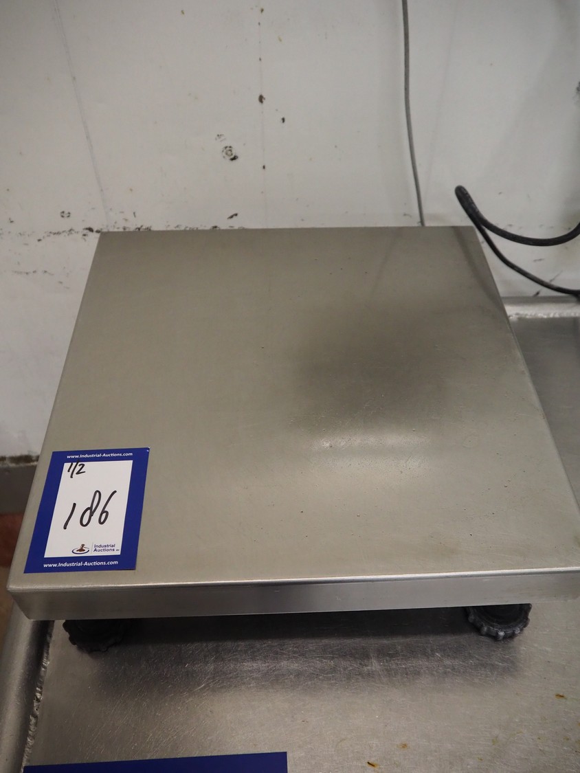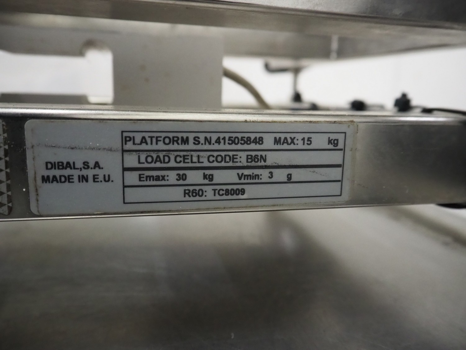 Dibal, S.A. weighing scale with Cardinal Scale indicator, model Dibal, S.A.: R60, serial number: 41505848, maximum weight: 15 kg, dimensions scale: 400 mm x 400 mm x 130 mm, model Cardinal: 190EU, serial number: E03318-0124, 100-240 VAC, 50-60 Hz, dimensions indicator: 270 mm x 140 mm x 160 mm.