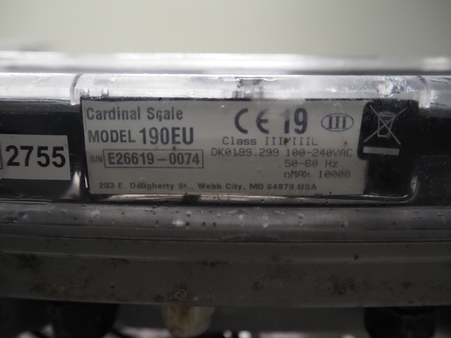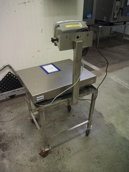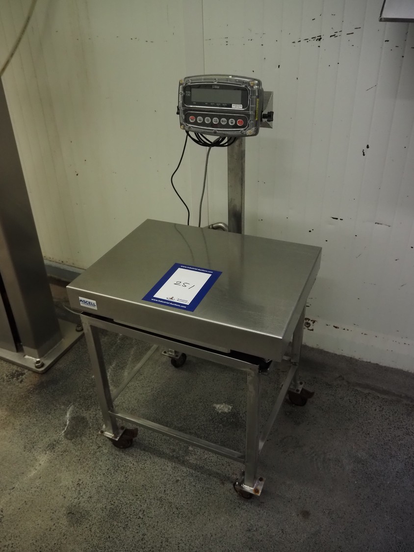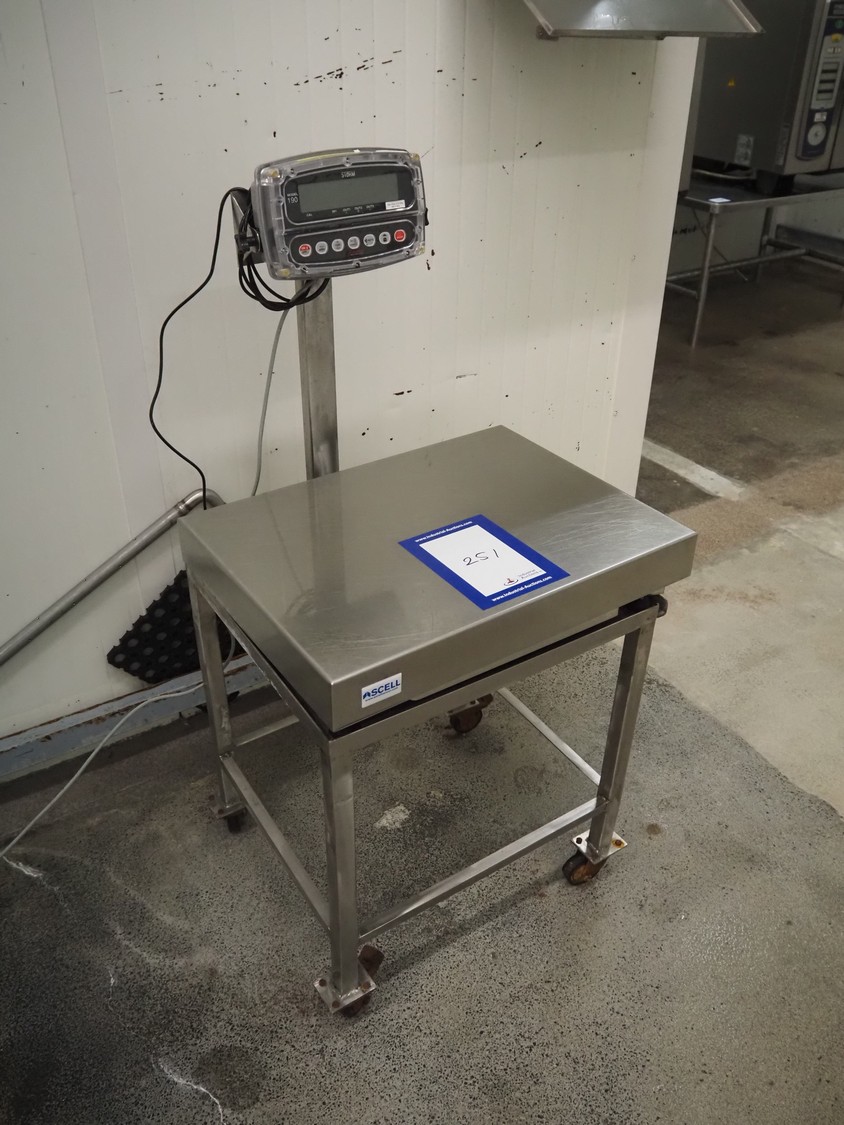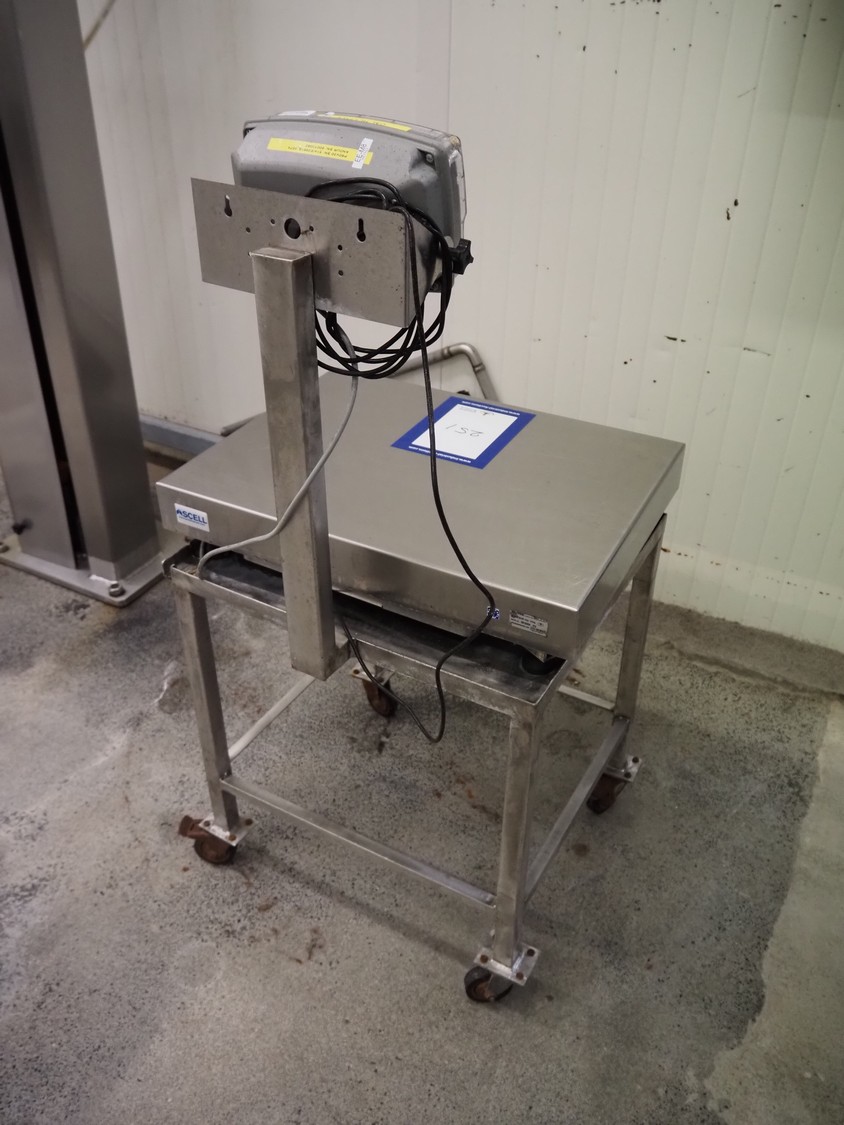 Ascell mobile s/s weighing scale, model: MI45, serial number: 0010254, capacity: 60 kg with Cardinal Scale indicator, model: 190EU, serial number: E26619-0074, 100-240 VAC, 50-60 Hz, dimensions scale: 600 mm x 450 mm, total dimensions: 600 mm x 550 mm x 1200 mm.