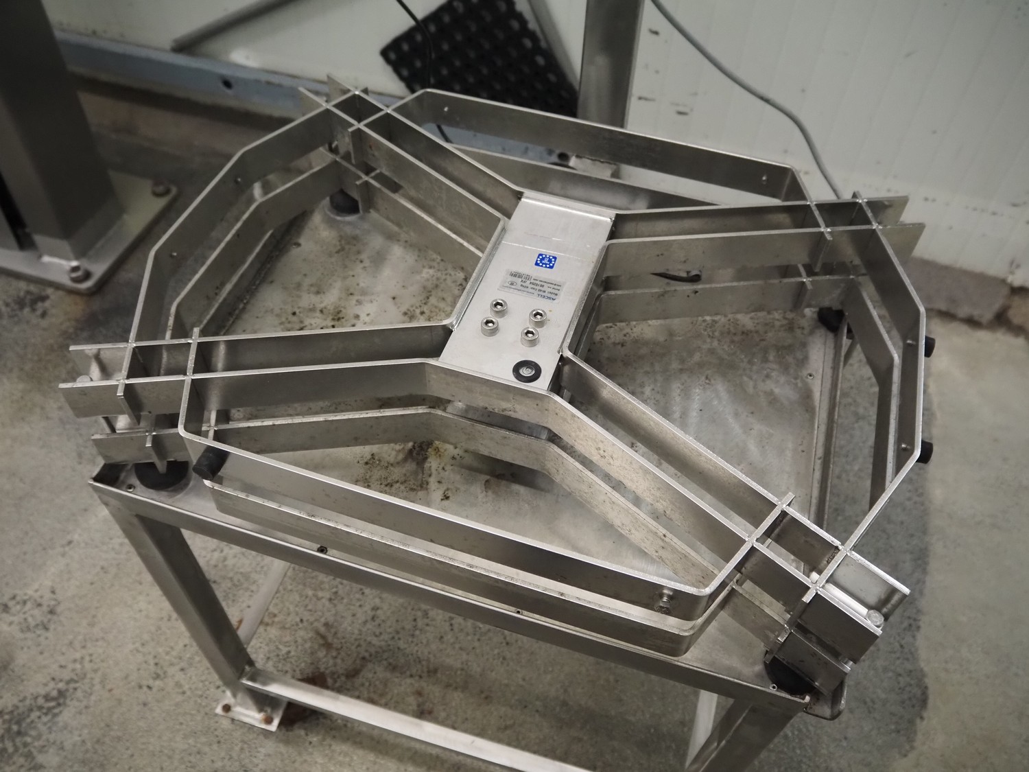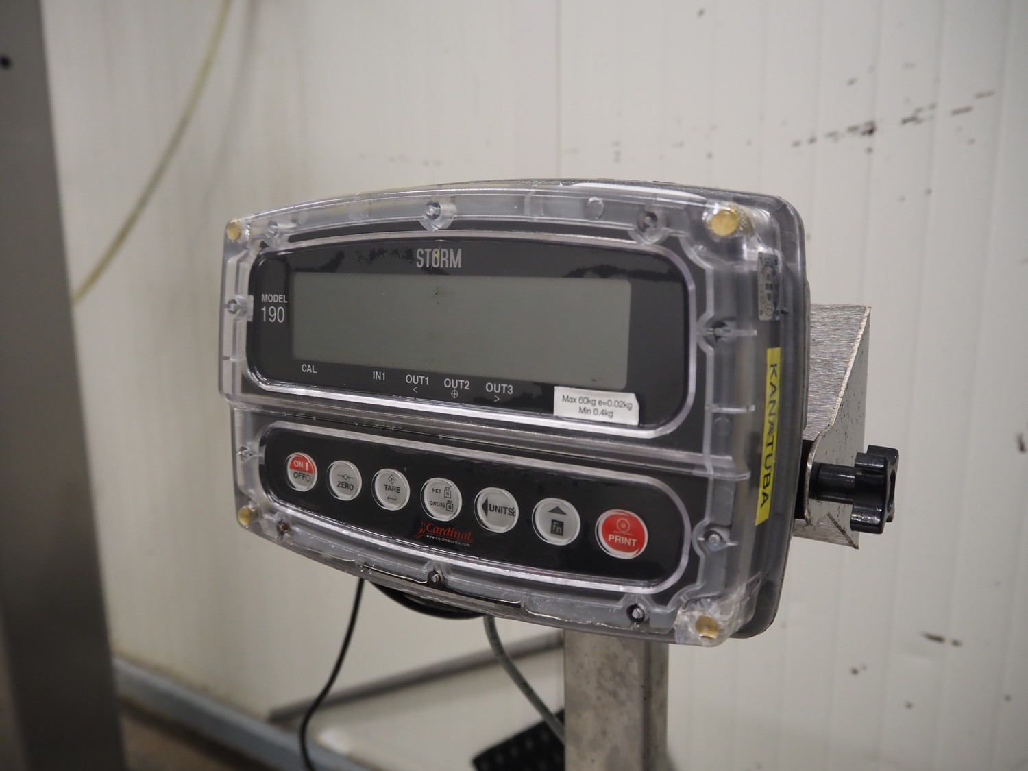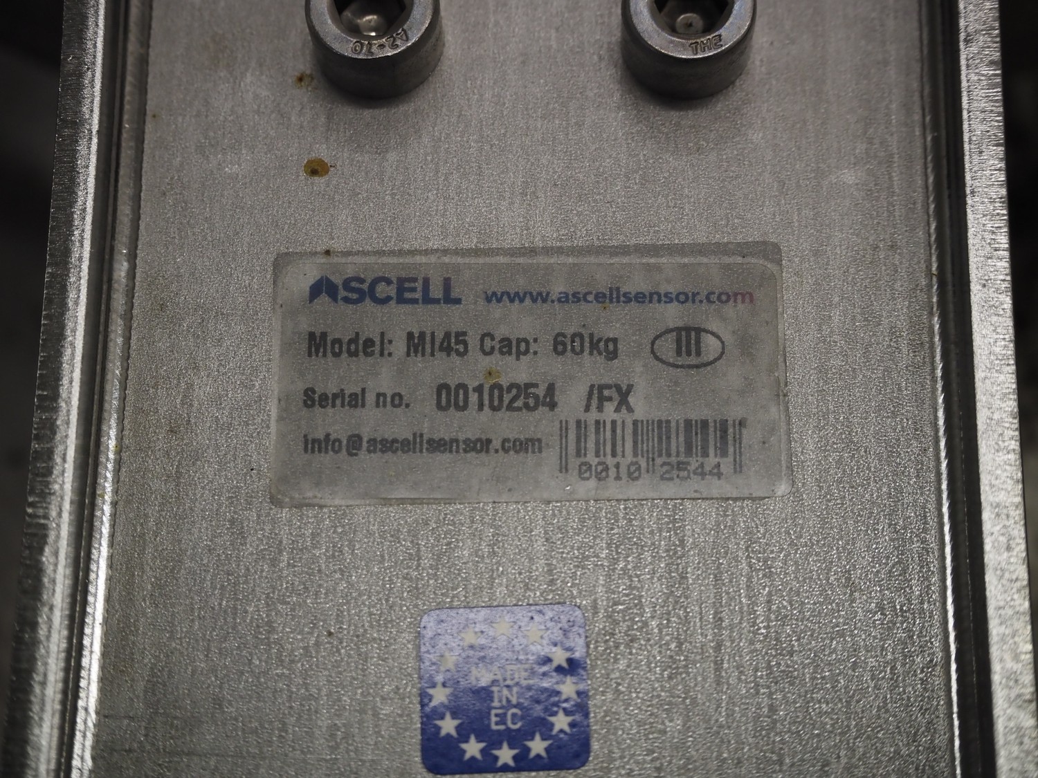 Ascell mobile s/s weighing scale, model: MI45, serial number: 0010254, capacity: 60 kg with Cardinal Scale indicator, model: 190EU, serial number: E26619-0074, 100-240 VAC, 50-60 Hz, dimensions scale: 600 mm x 450 mm, total dimensions: 600 mm x 550 mm x 1200 mm.