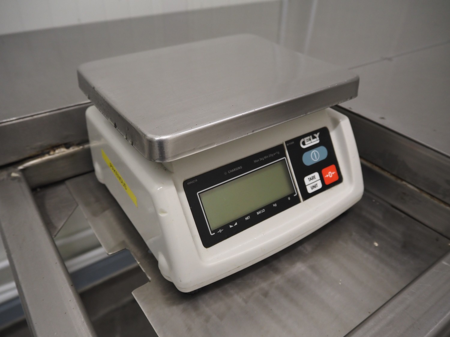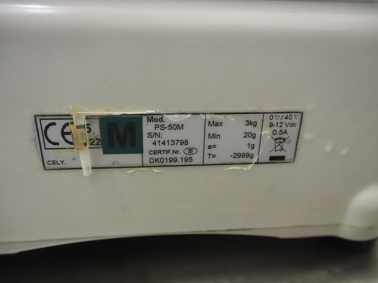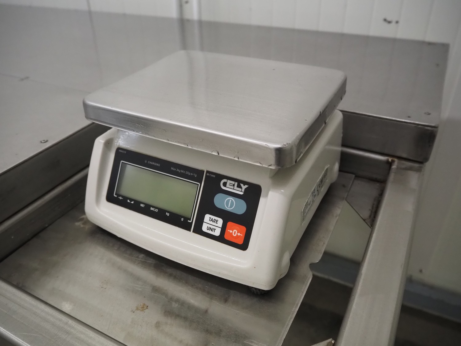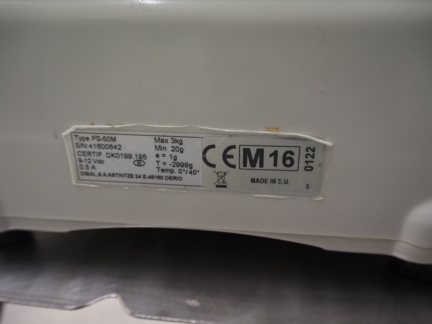S/s table with 2 Dibal, S.A. weighing scales, type scales: PS-50M, serial number: 41600642 / 41413798, maximum weight: 3 kg, minimum weight: 20 gram, e = 1 gram, T = -2999 gram, dimensions scales: 230 mm x 190 mm, total dimensions Dibal, S.A.: (2x) 240 mm x 230 mm x 150 mm, dimensions table: 1610 mm x 800 mm x 920 mm.