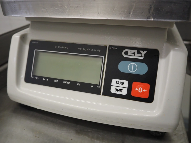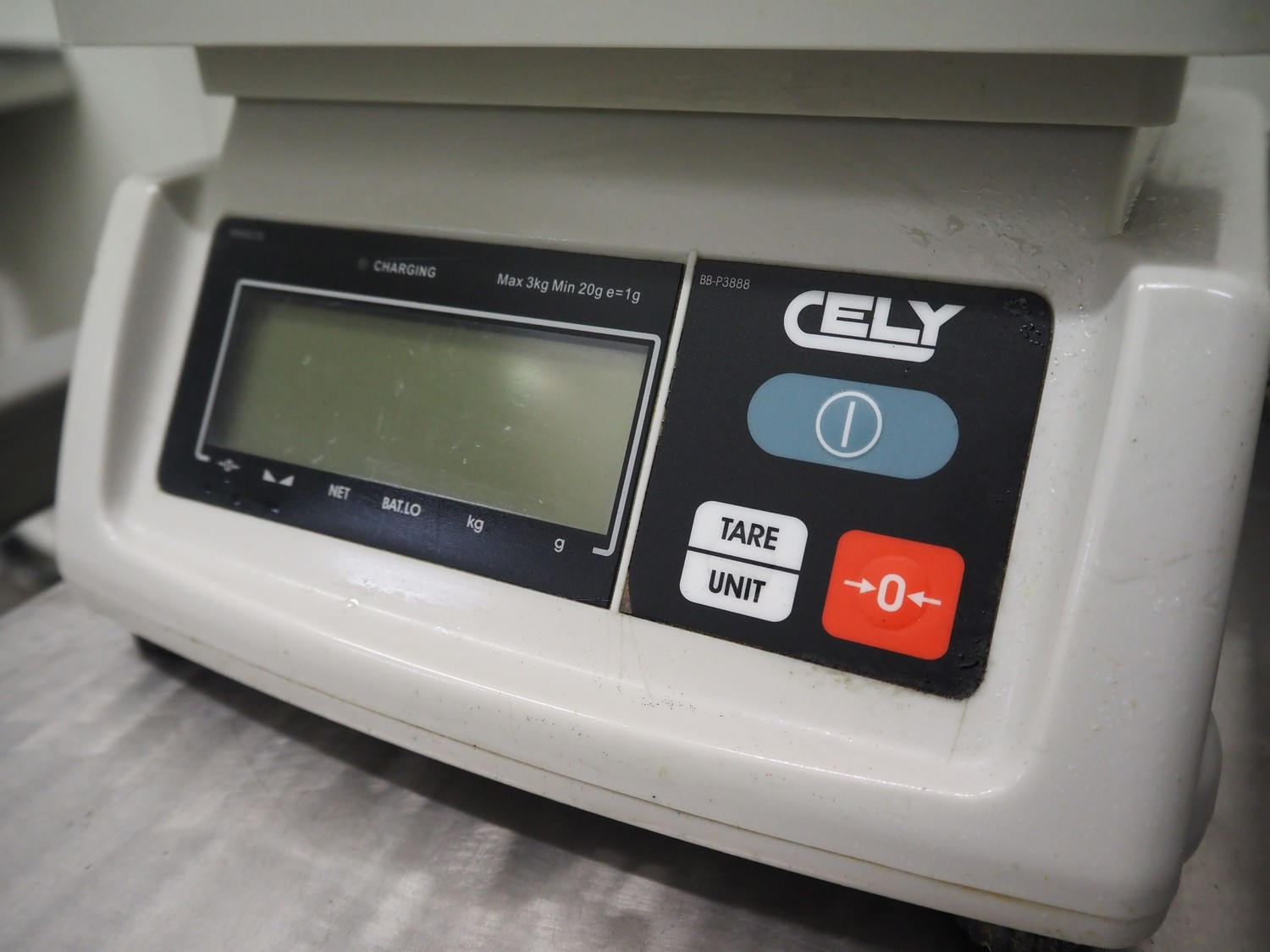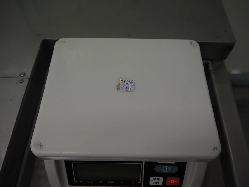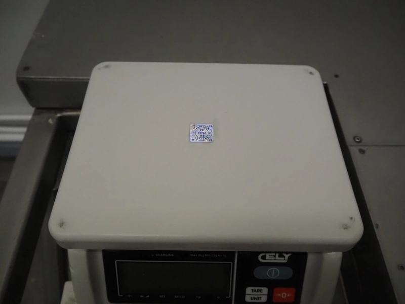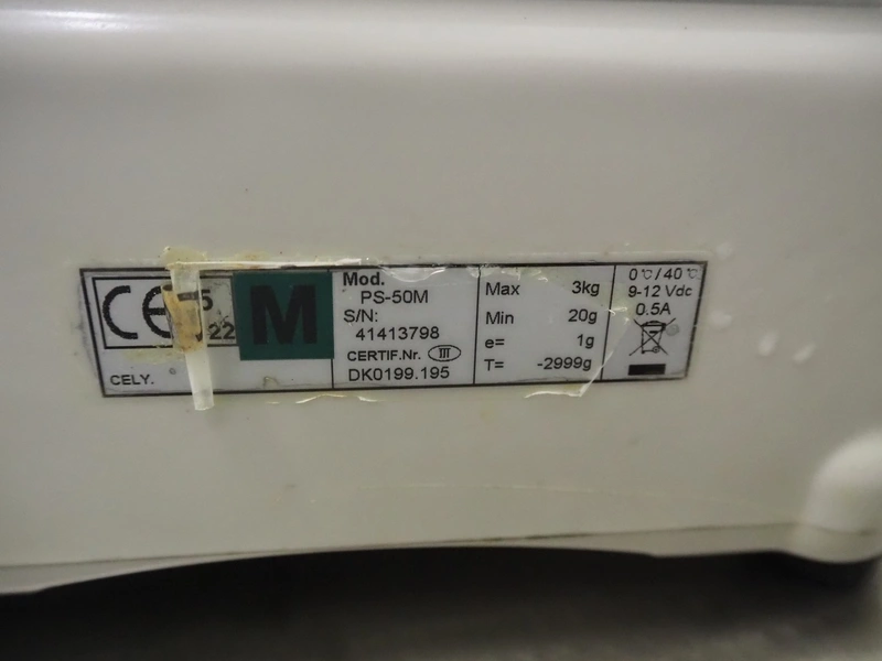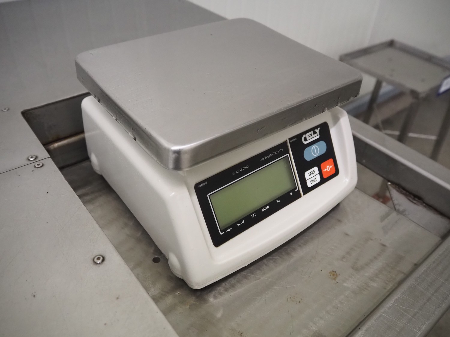 S/s table with 2 Dibal, S.A. weighing scales, type scales: PS-50M, serial number: 41600642 / 41413798, maximum weight: 3 kg, minimum weight: 20 gram, e = 1 gram, T = -2999 gram, dimensions scales: 230 mm x 190 mm, total dimensions Dibal, S.A.: (2x) 240 mm x 230 mm x 150 mm, dimensions table: 1610 mm x 800 mm x 920 mm.