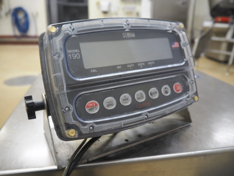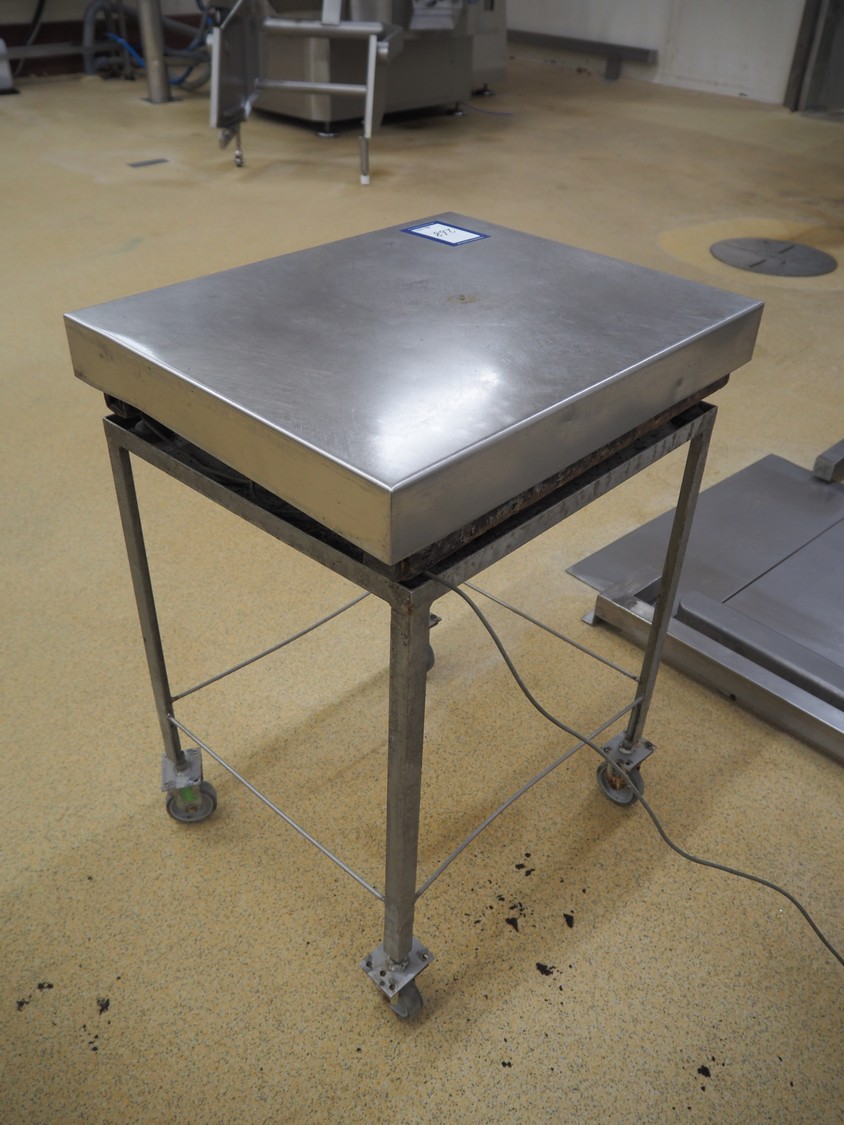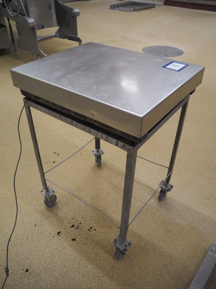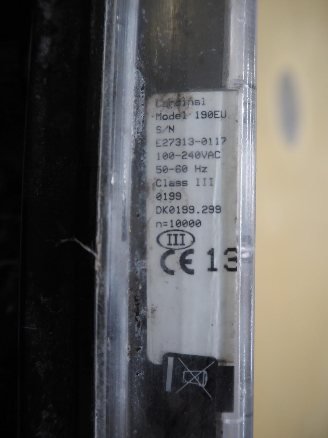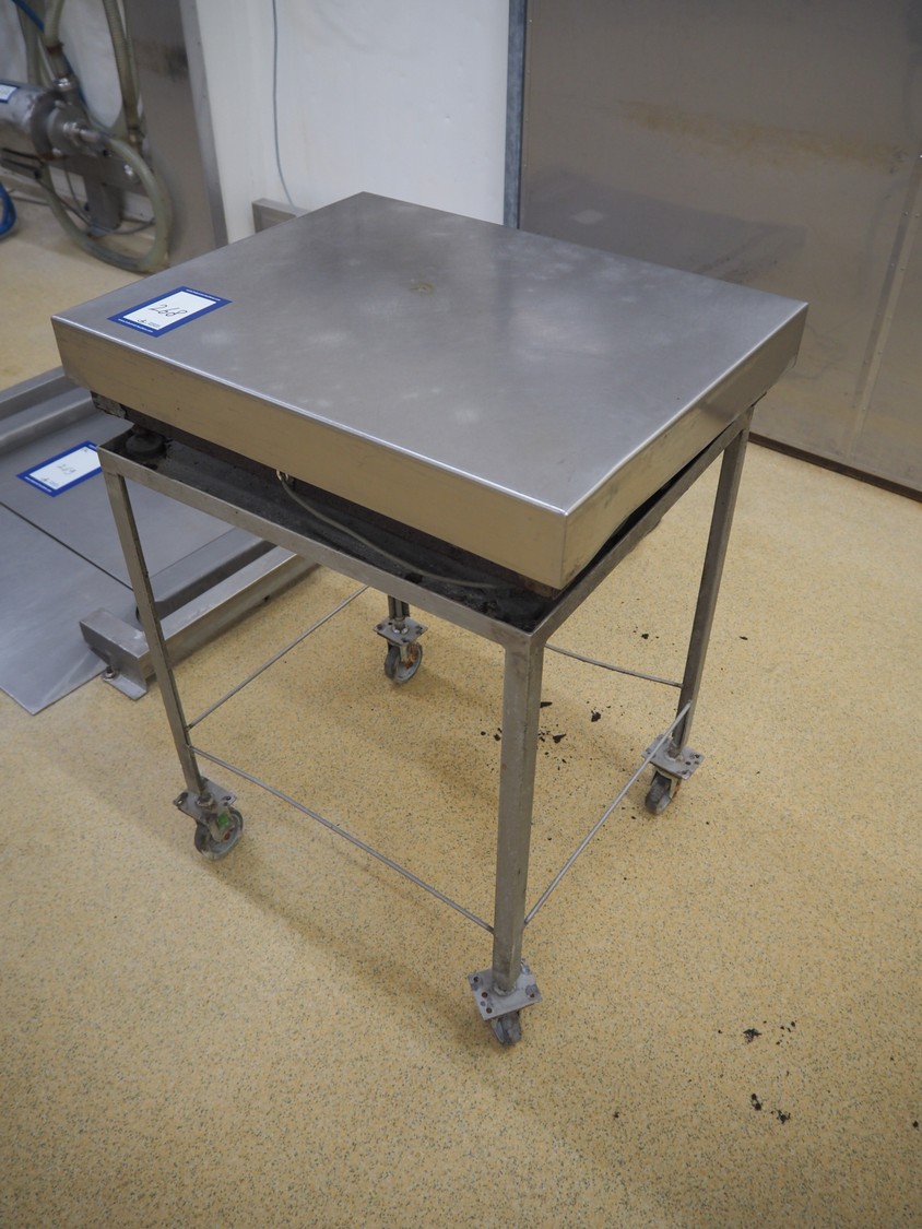 S/s weighing scale, dimensions scale: 600 mm x 490 mm x 150 mm, total dimensions: 540 mm x 480 mm x 690 mm, with Cardinal Scale indicator, model: 190EU, serial number: E27313-0117, 100-240 VAC, 50-60 Hz, dimensions indicator: 290 mm x 120 mm x 200 mm.