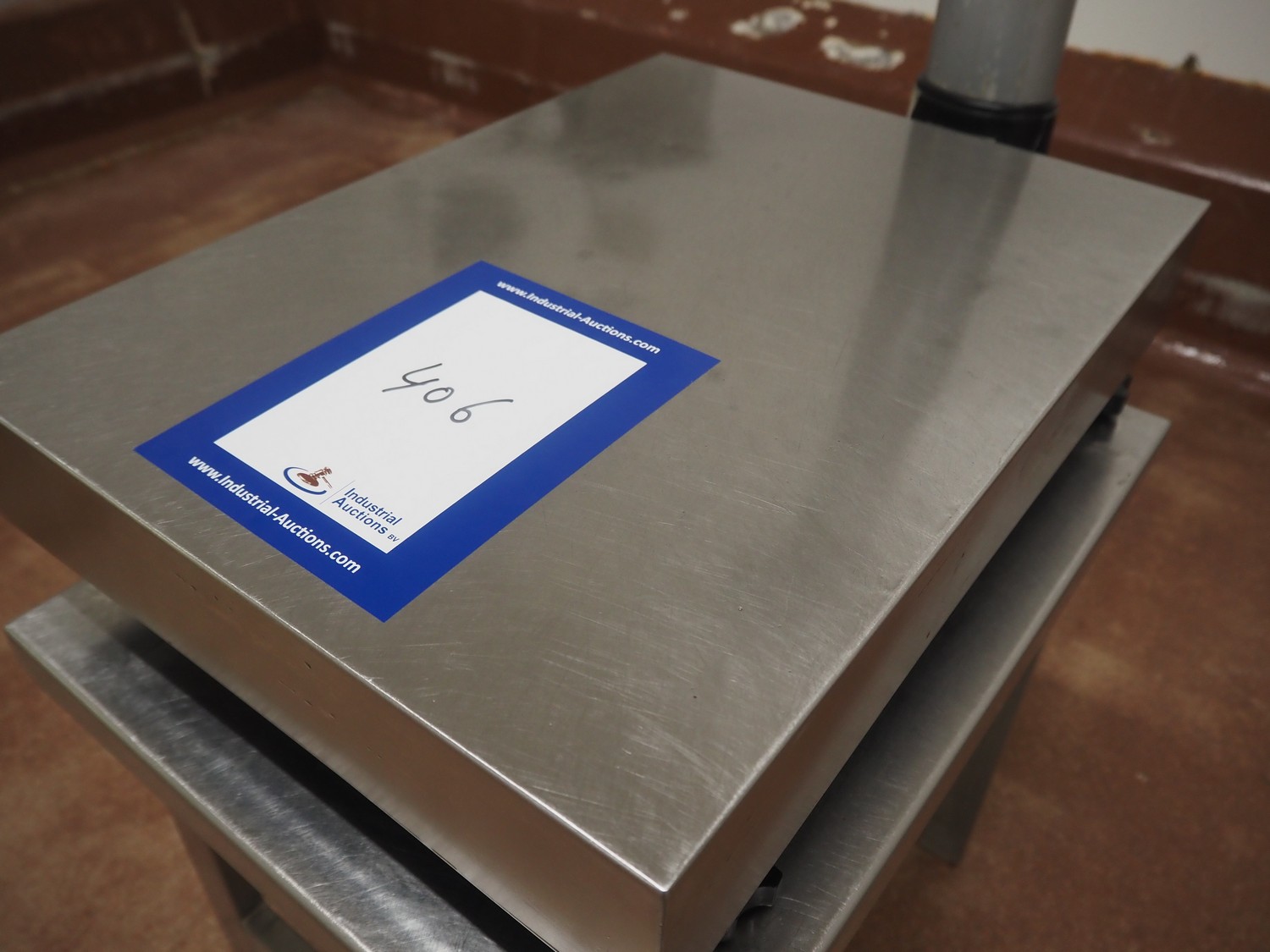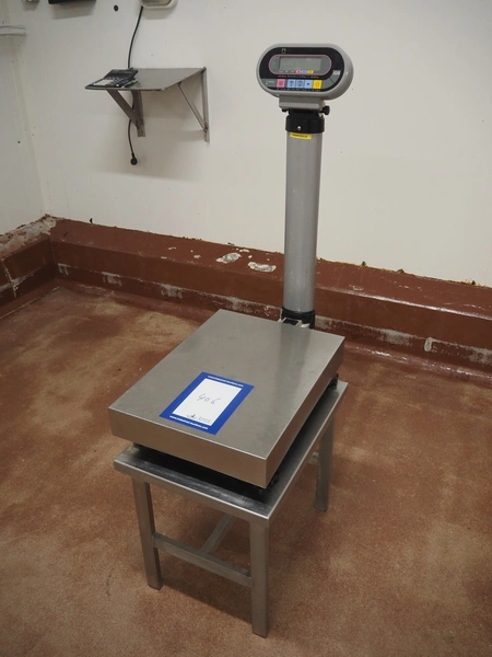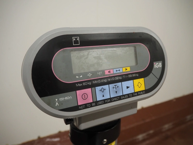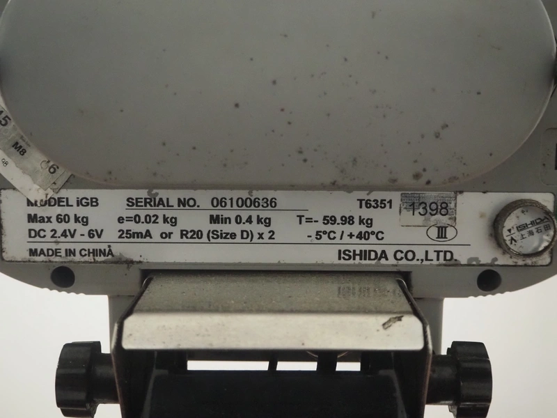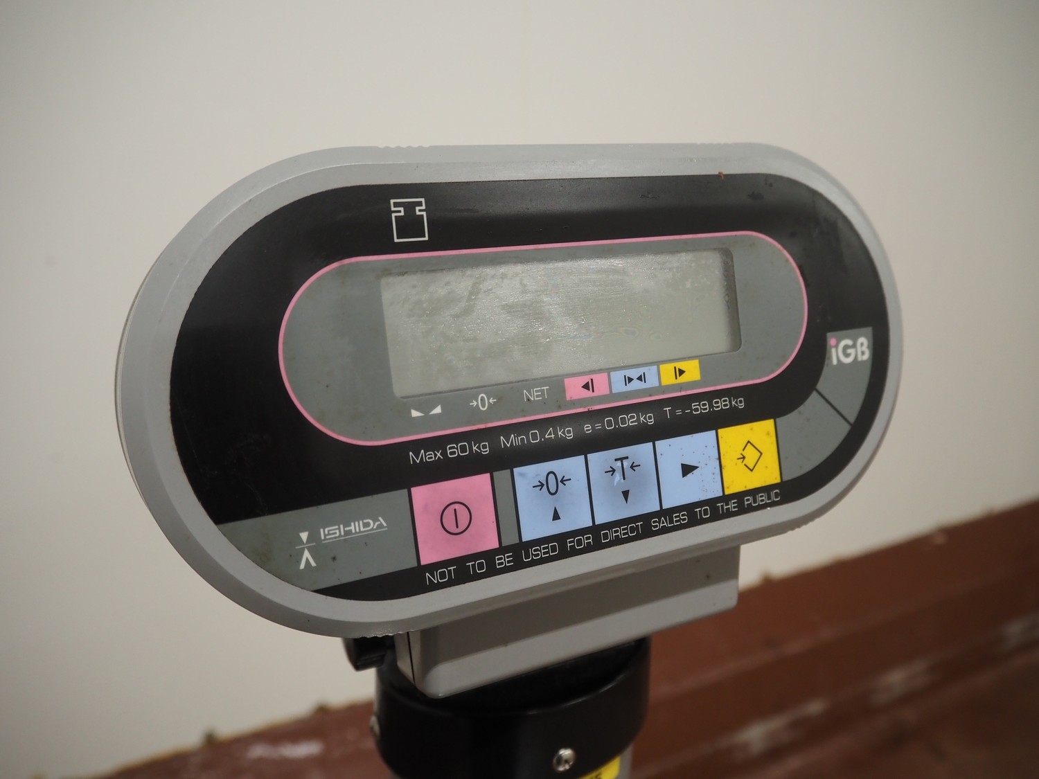 Ishida Co., LTD weighing scale on s/s frame, model: iGB, serial number: 06100636, max: 60 kg, min: 0.4 kg, e=0.02 kg, T=-59.98 kg, dimensions scale: 550 mm x 400 mm, total dimensions: 740 mm x 400 mm x 1350 mm.