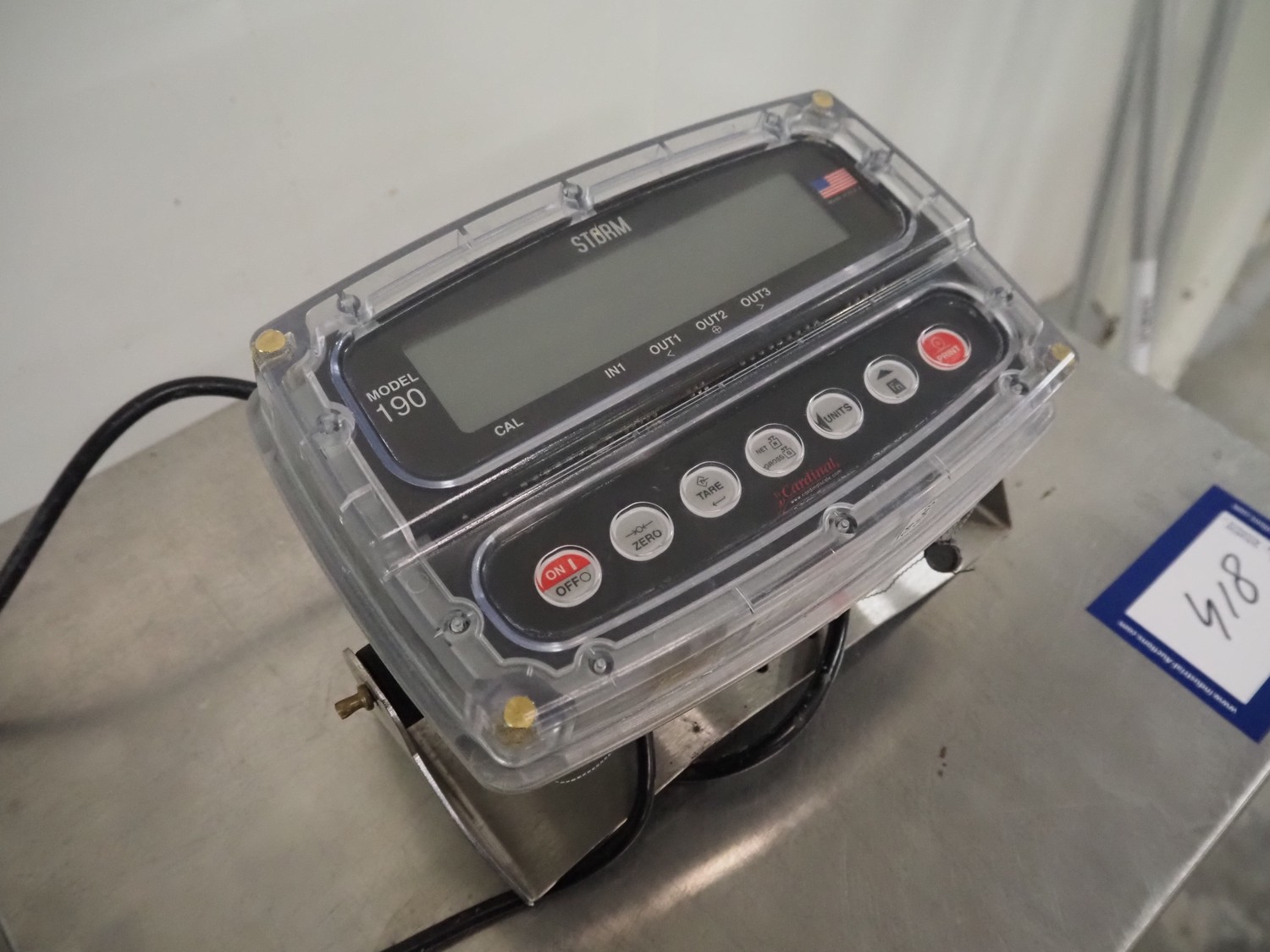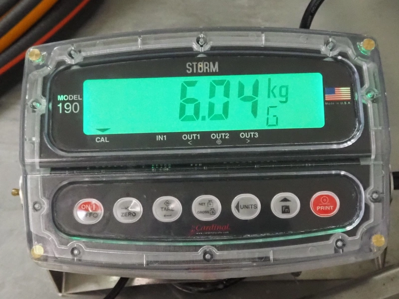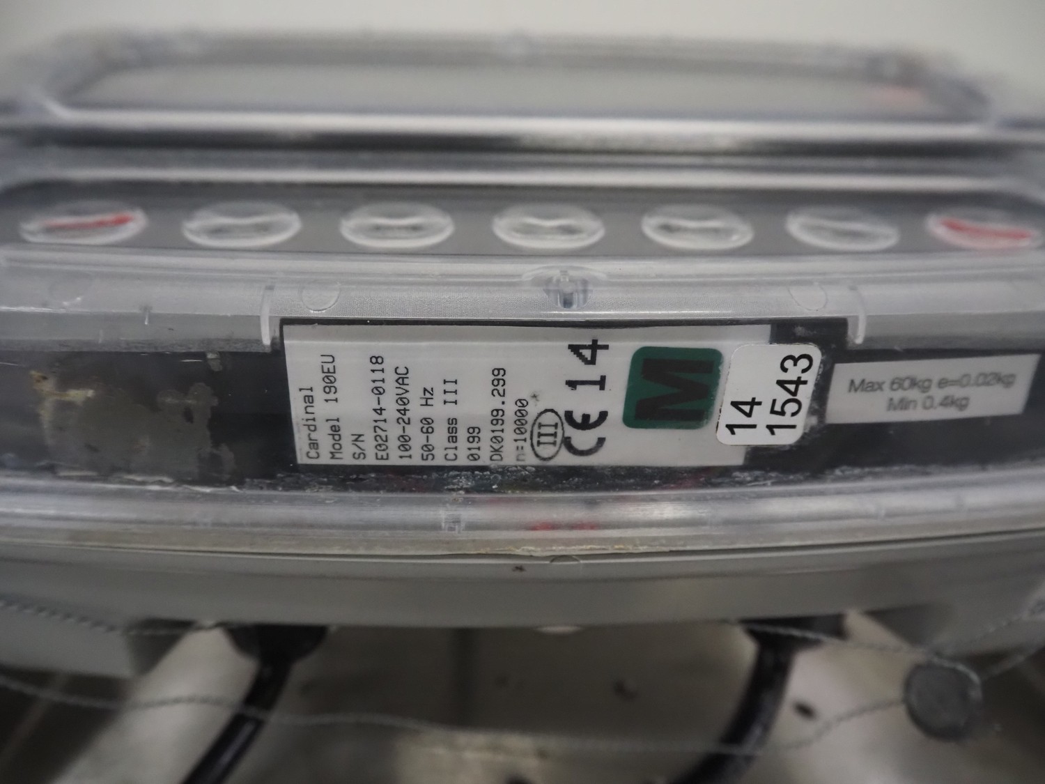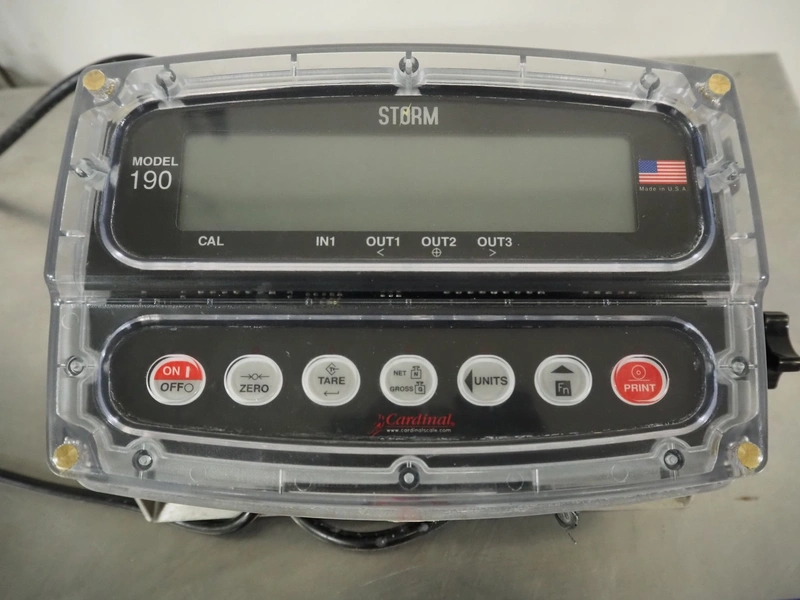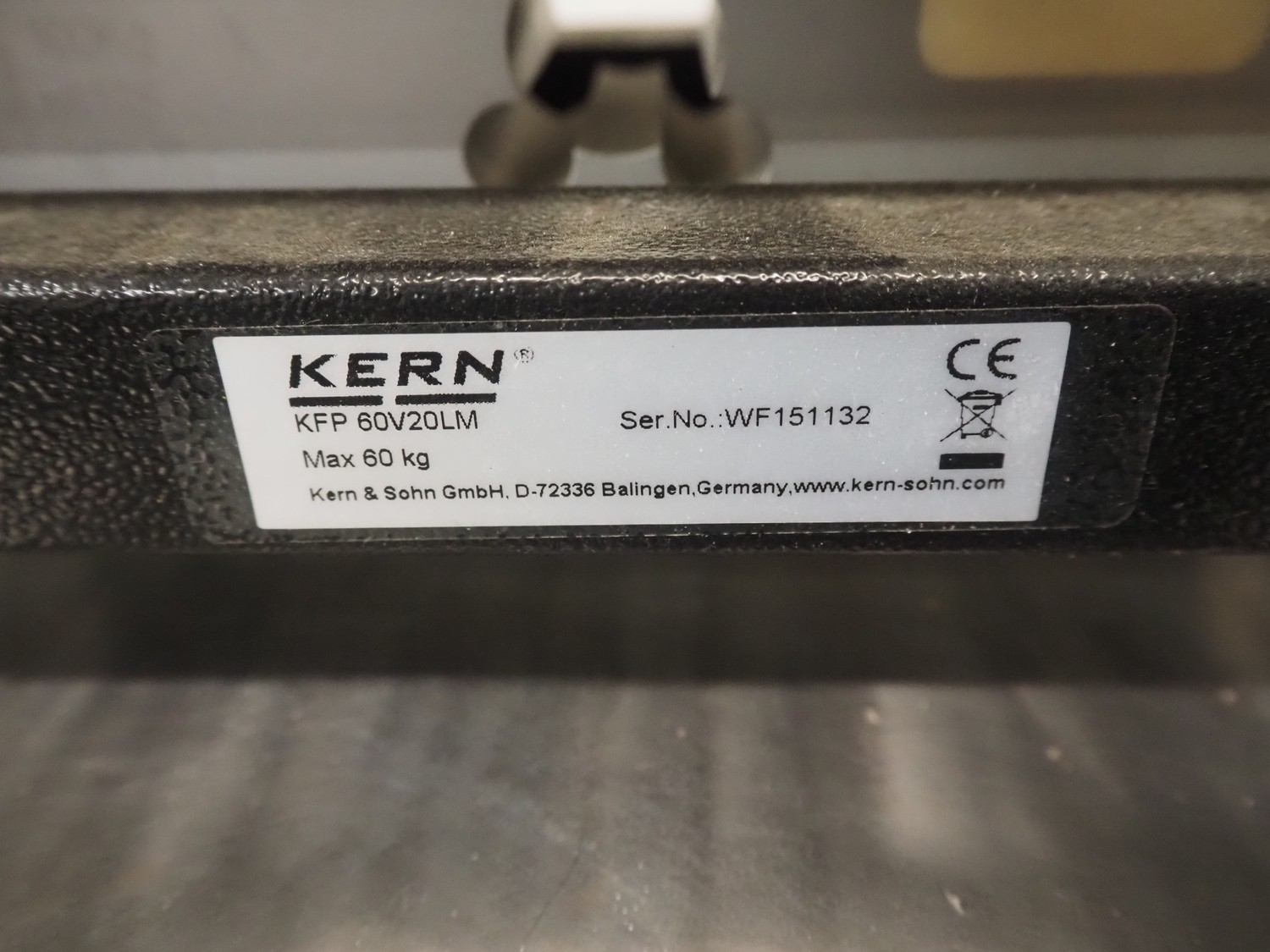 Kern & Sohn GmbH weighing scale, model: KFP 60V20LM, serial number: WF151132, maximum weight: 60 kg, dimensions scale: 500 mm x 400 mm, dimensions total dimensions: 530 mm x 400 mm x 850 mm, with Cardinal Scale indicator, model: 190EU, serial number: E02714-0118, dimensions: 270 mm x 140 mm x 160 mm.