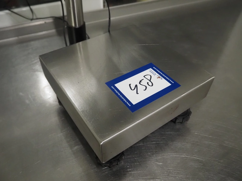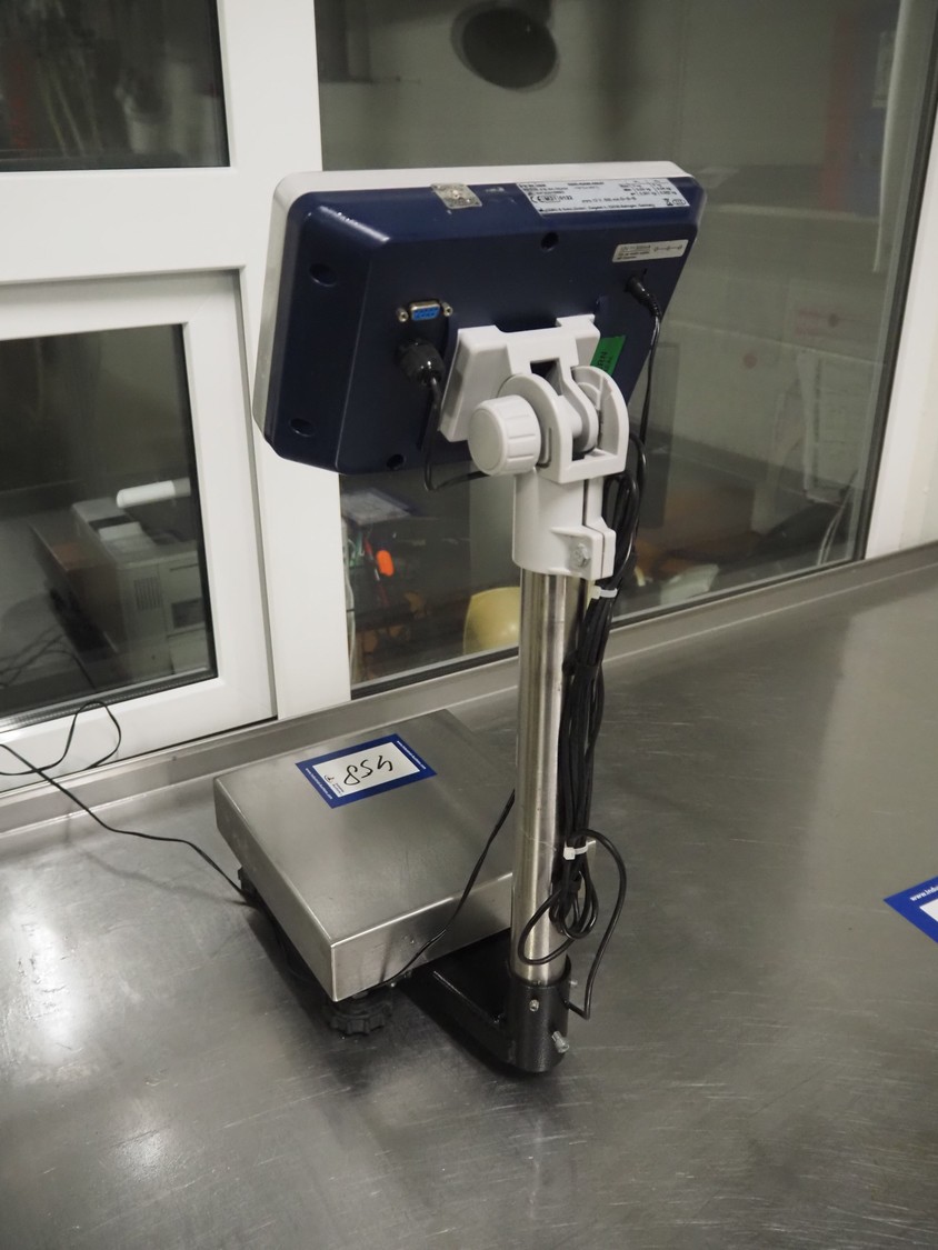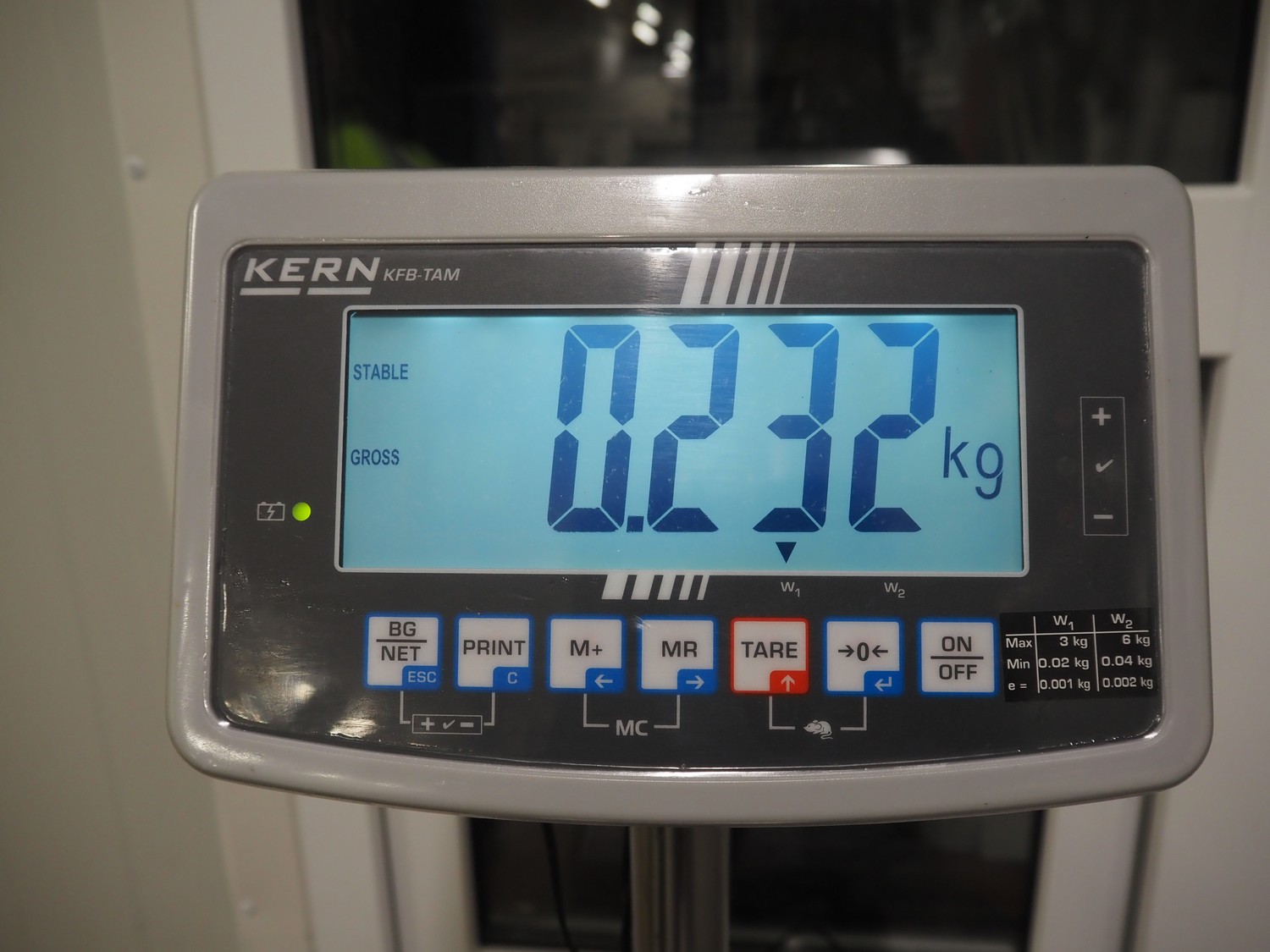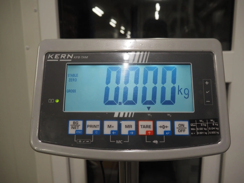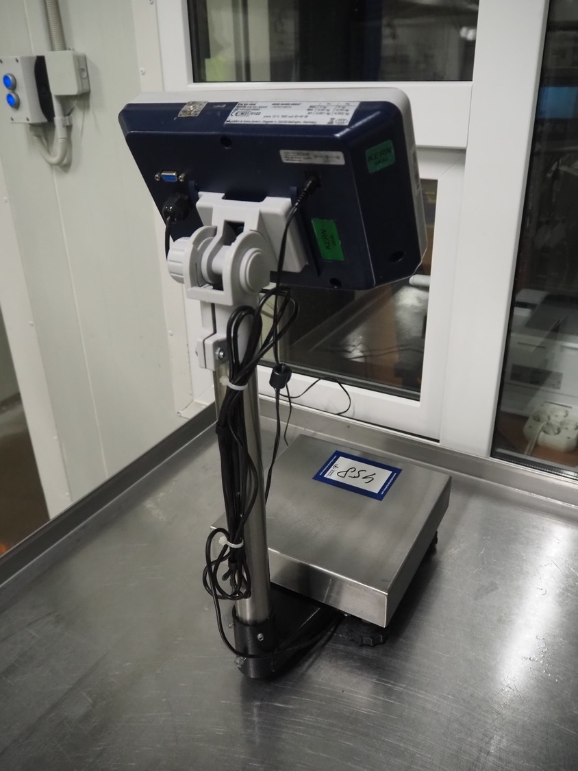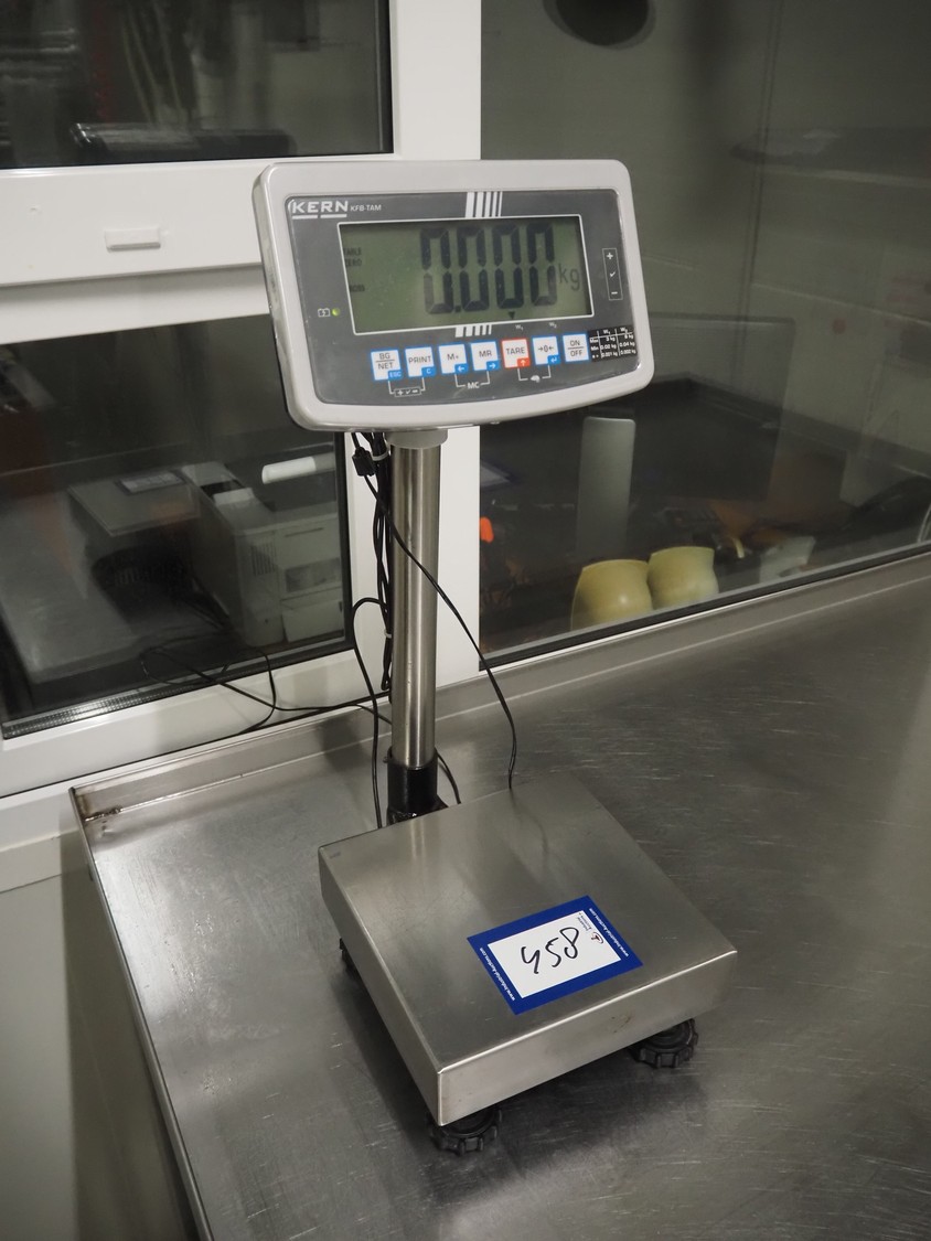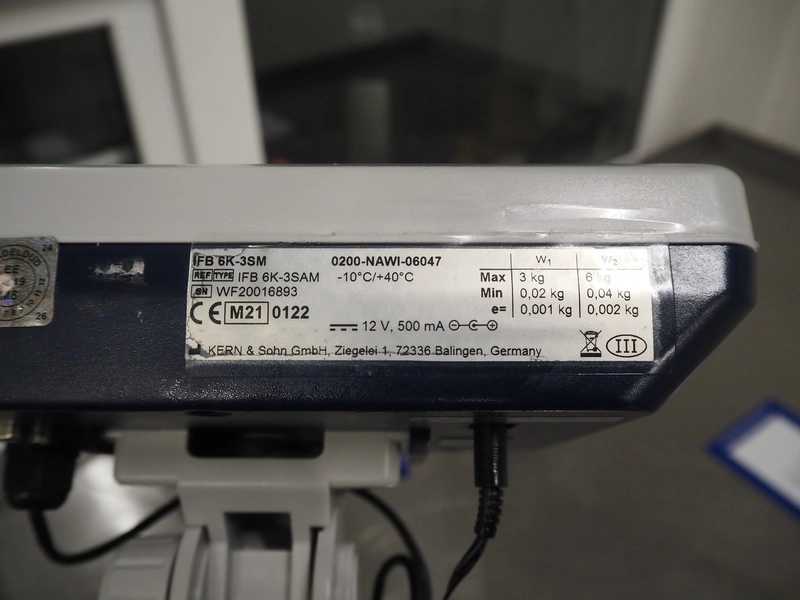 Kern & Sohn GmbH weighing scale, model: FB 6K-3SM, serial number: WF20016893, maximum weight: 3/6 kg, minimum weight: 0.02/0.04 kg, e=0.001/0.002 kg, dimensions scale: 230 mm x 230 mm, total dimensions: 330 mm x 230 mm x 600 mm.