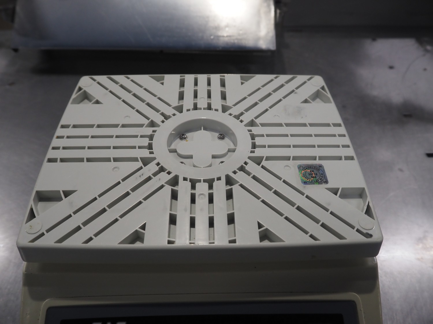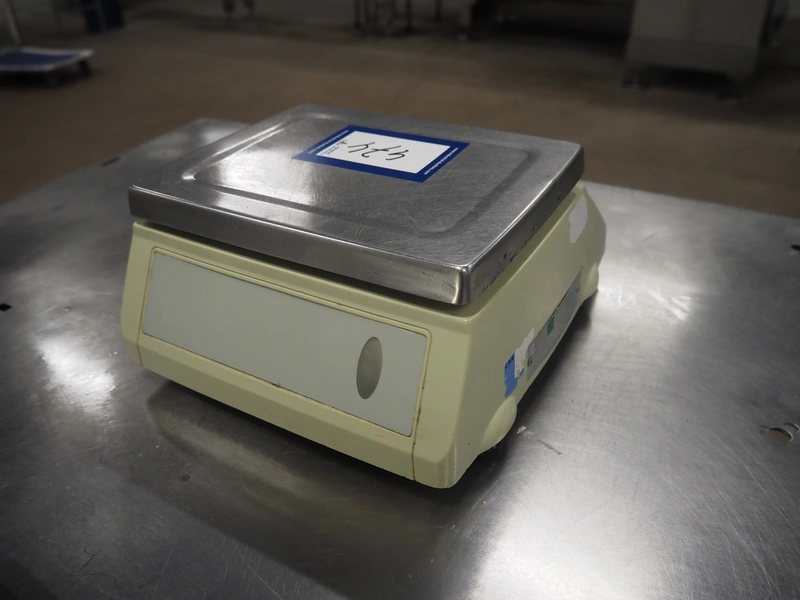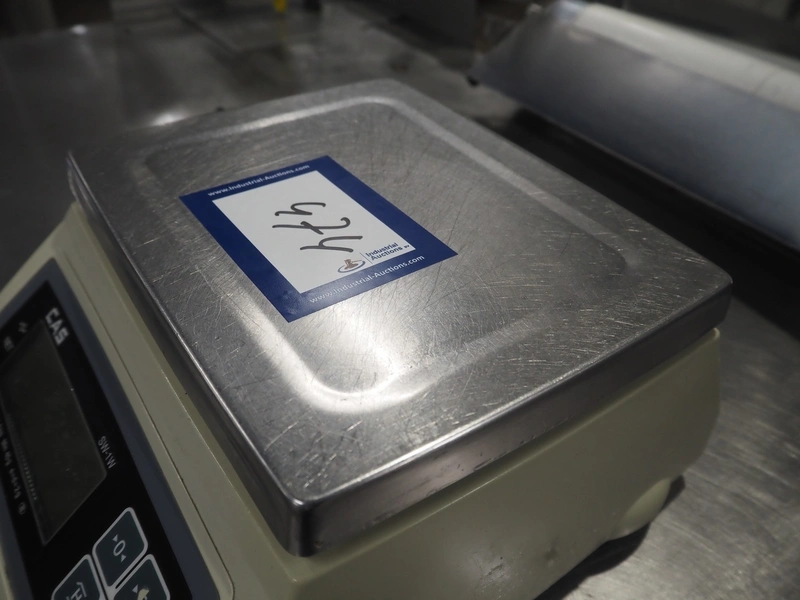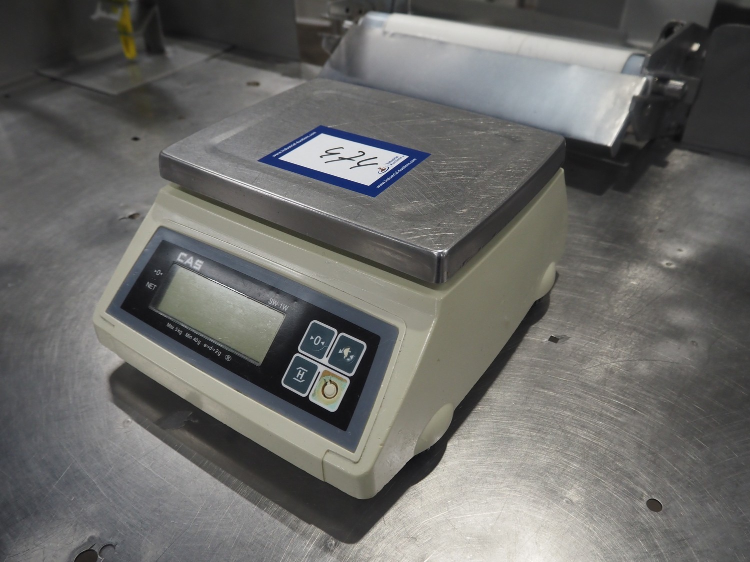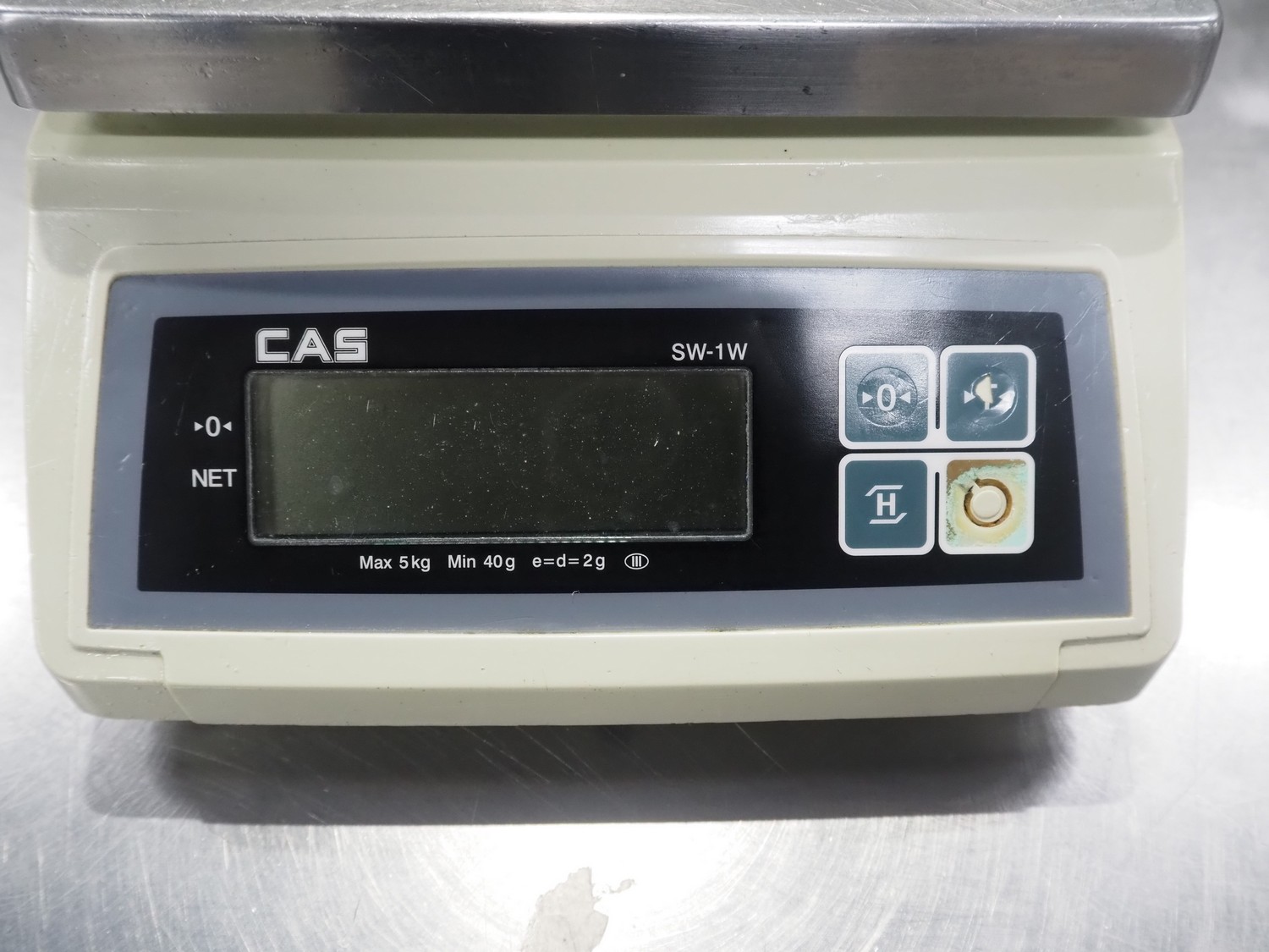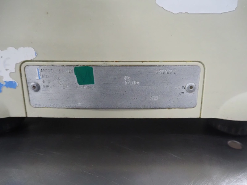 CAS Corporation weighing scale, model: SW-1W, serial number: 080151252, maximum weight: 5 kg, minimum weight: 40 gram, e=d= 2 gram, T = -5.000 kg, dimensions scale: 250 mm x 200 mm, total dimensions: 300 mm x 280 mm x 130 mm.