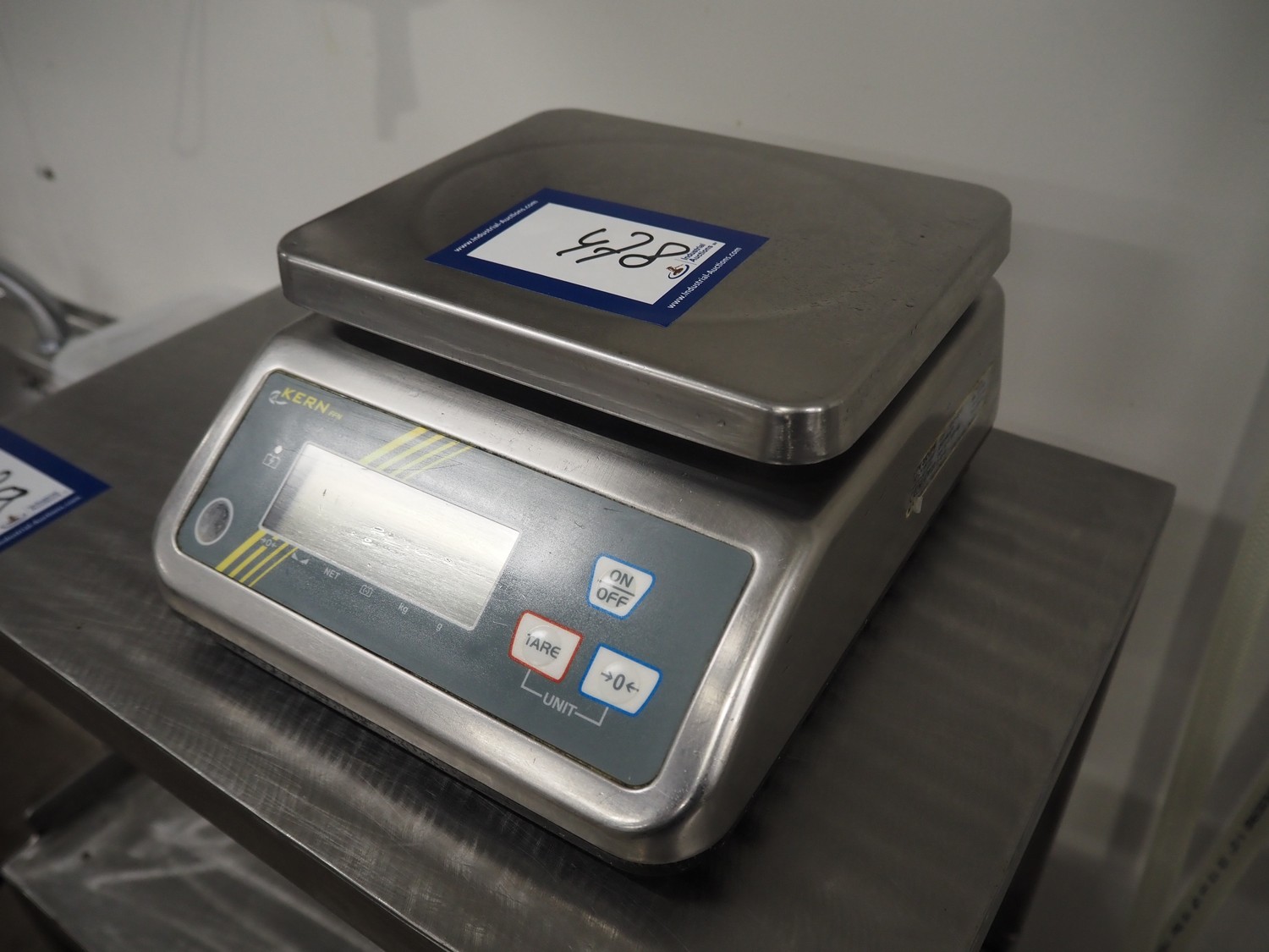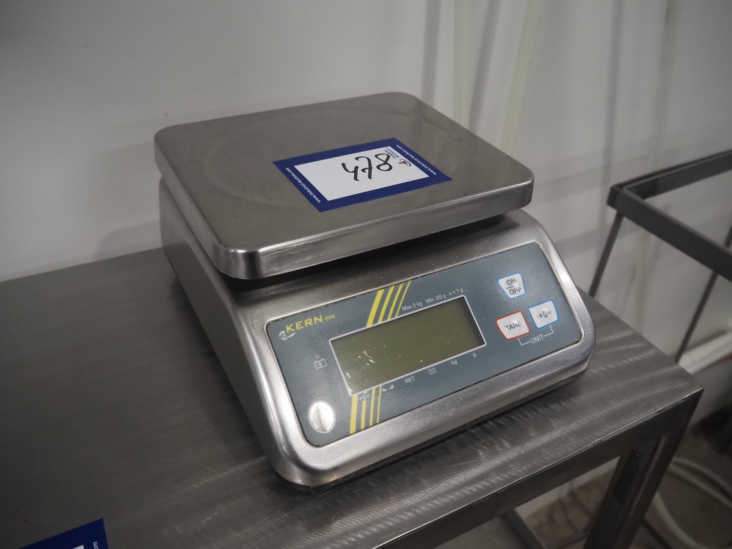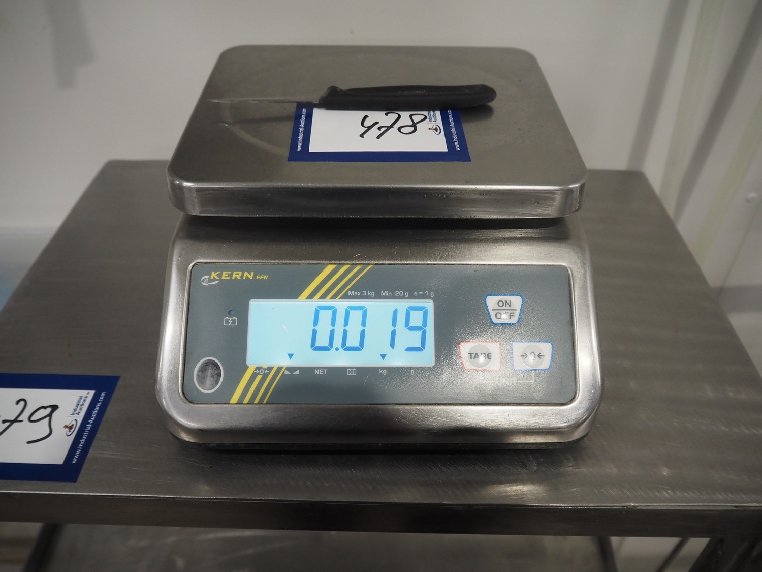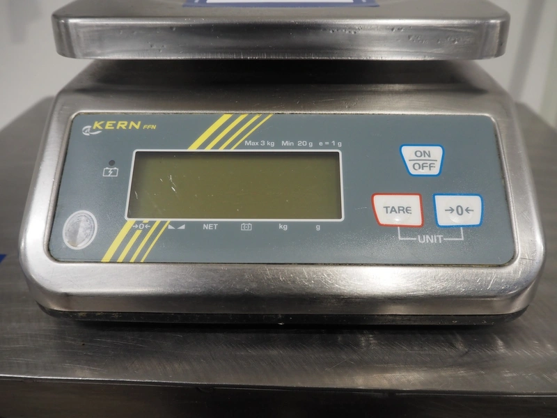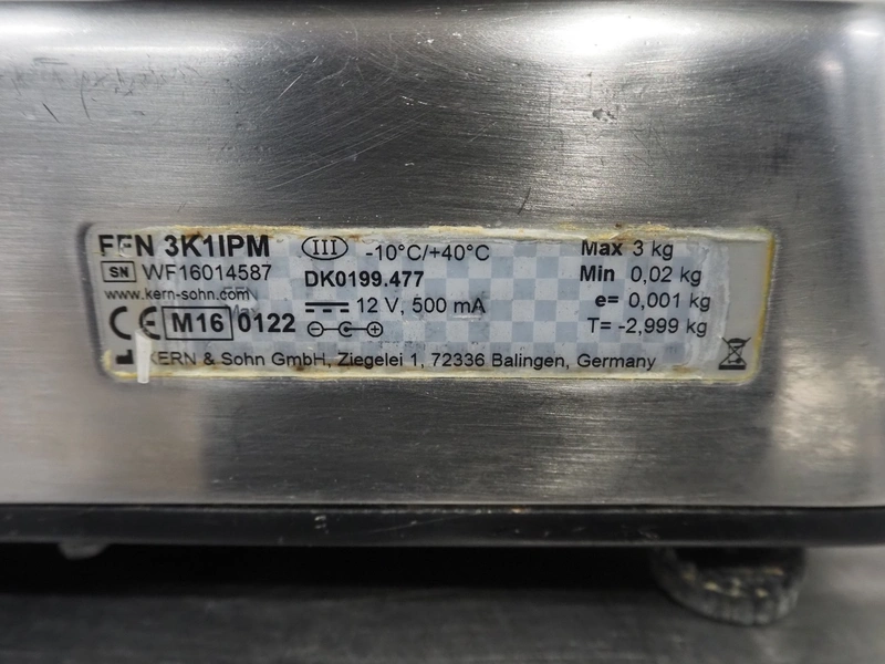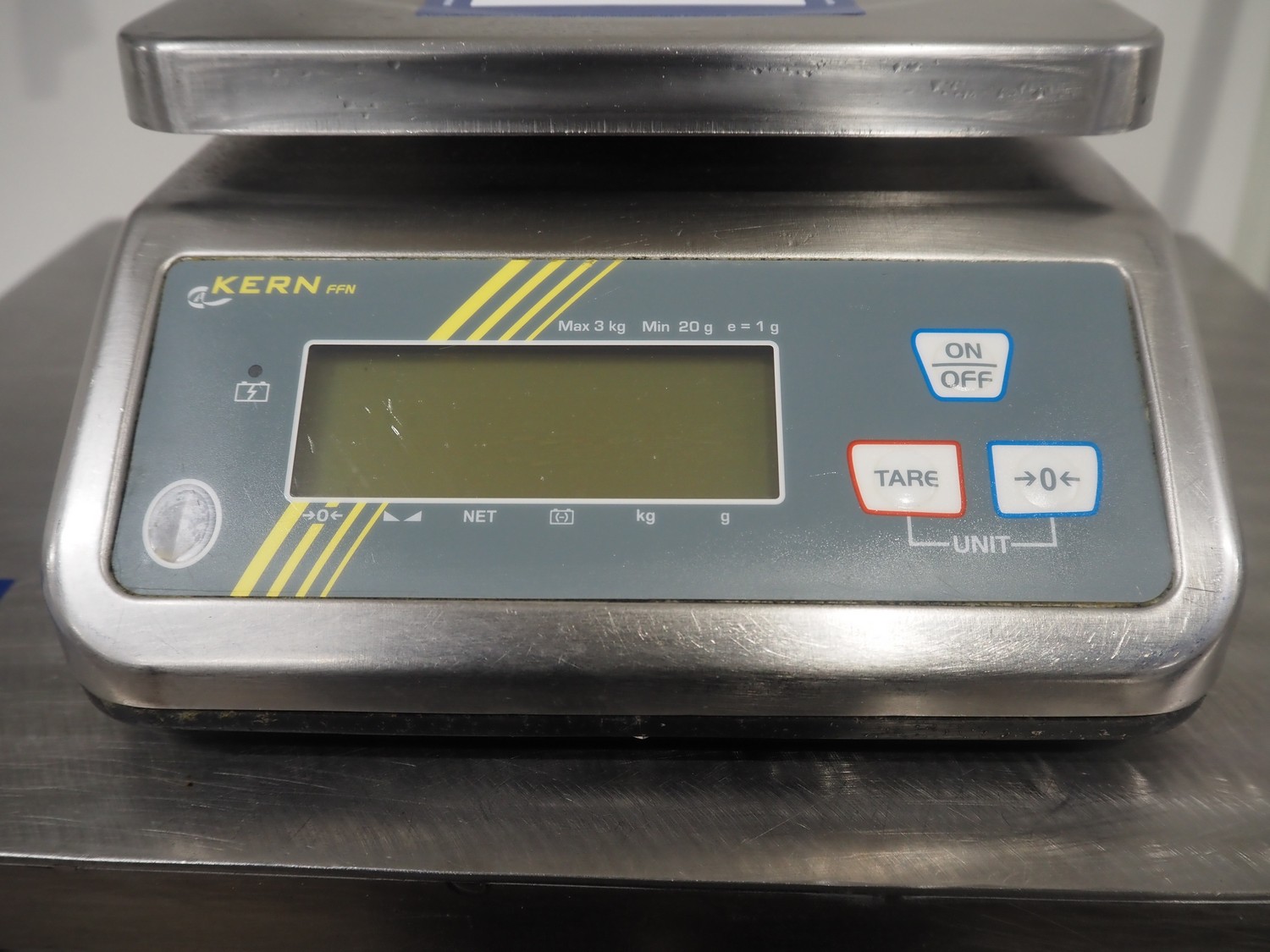 Kern & Sohn GmbH weighing scale, model: FFN 3K1IPM, serial number: WF16014587, maximum weight: 3 kg, minimum weight: 0.02 kg, e=0.001 kg, T= -2.999 kg, dimensions scale: 230 mm x 190 mm, total dimensions: 300 mm x 240 mm x 130 mm.