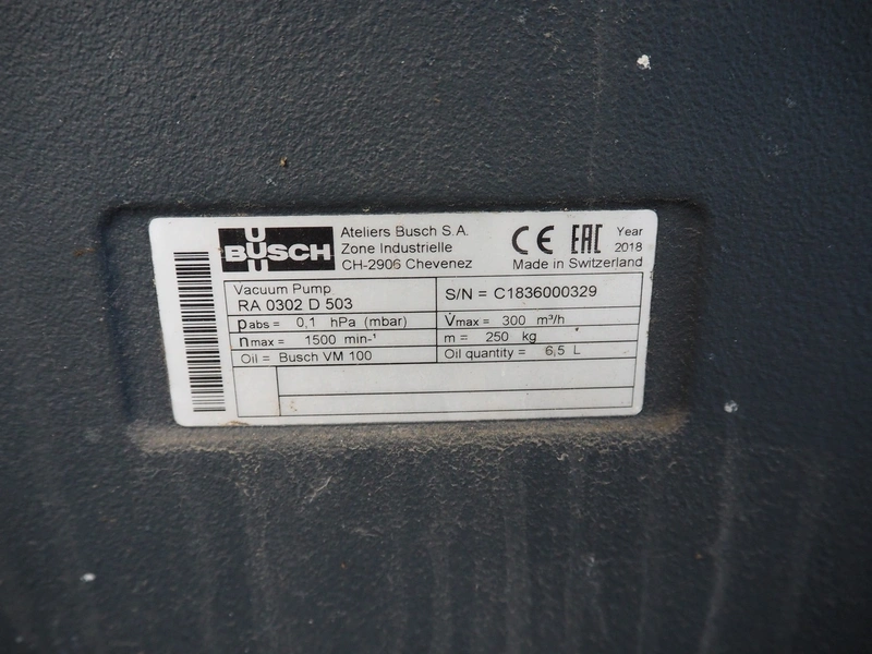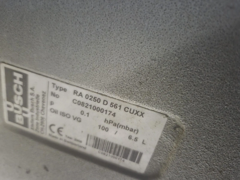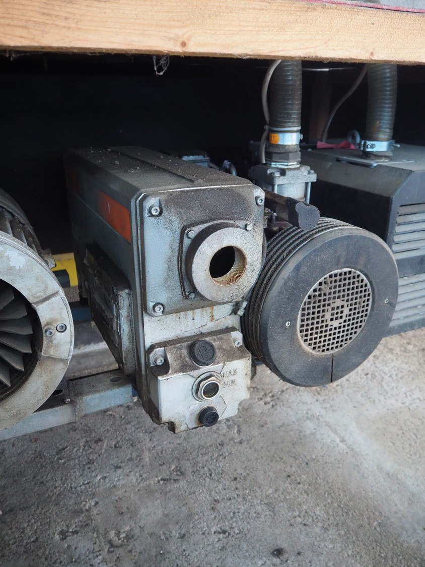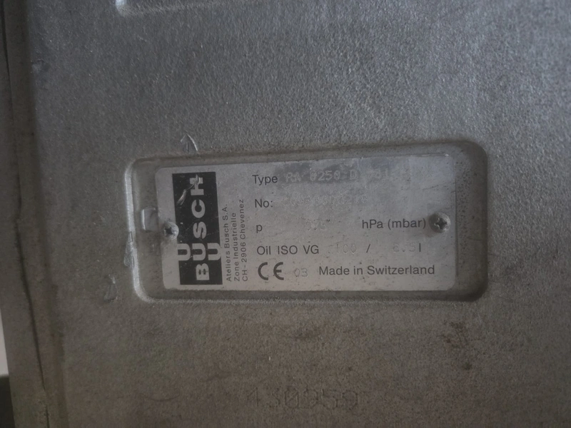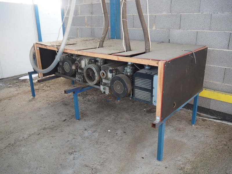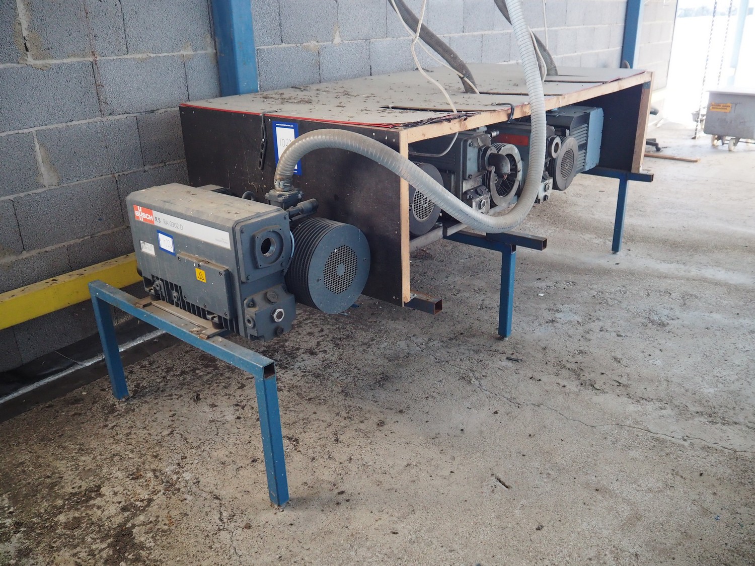 Steel rack with 4 Busch vacuum pumps, types: RA 0302 D 503 / (2x) RA 0250 D 561 DUXX / RA 0160 D 561 GQXX and 1 Gardner Denver vacuum pump, total dimensions: 3200 mm x 1500 mm x 1220 mm.