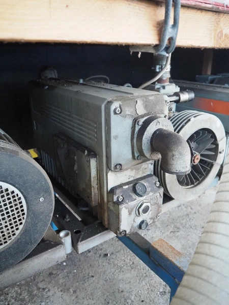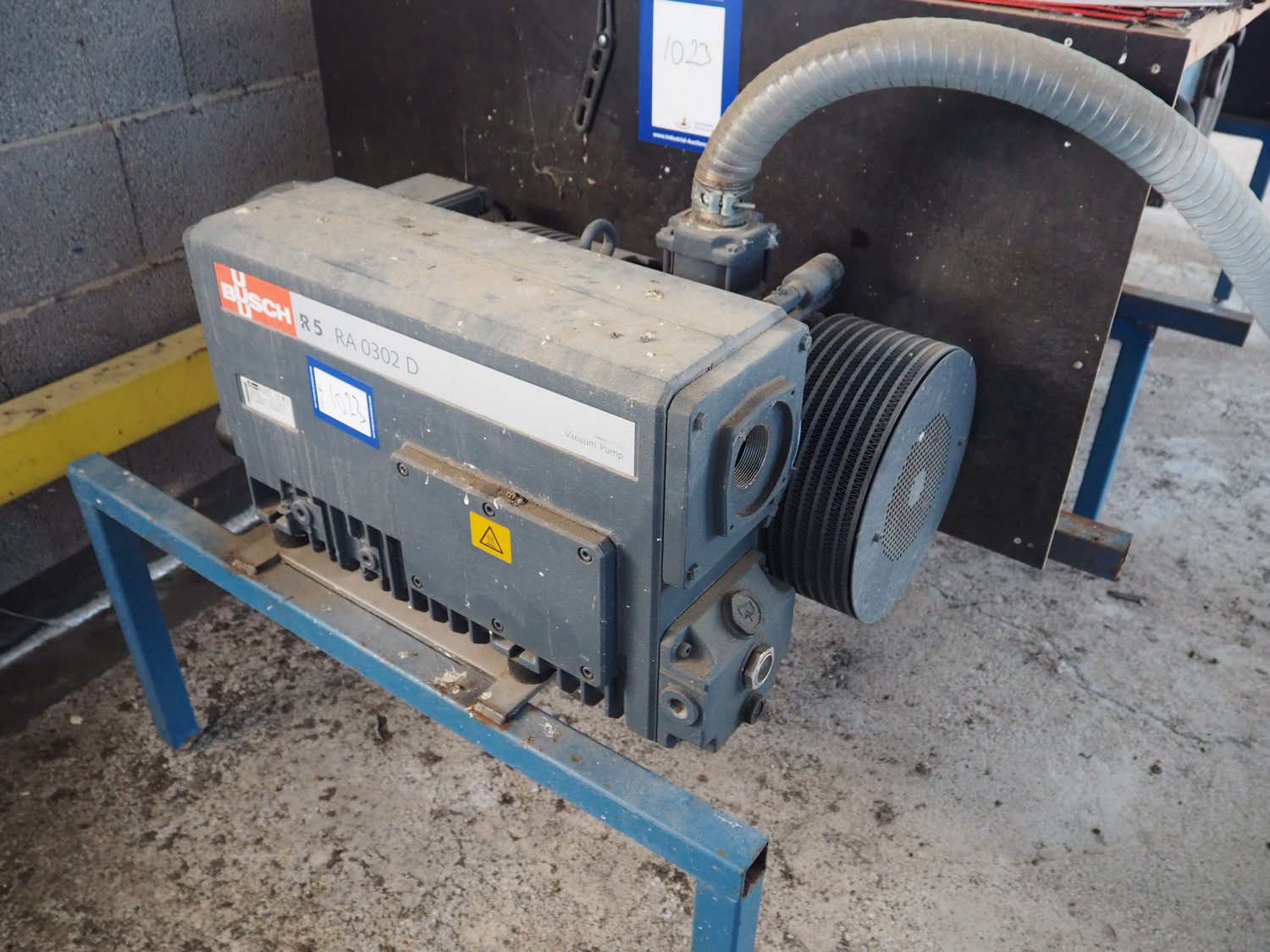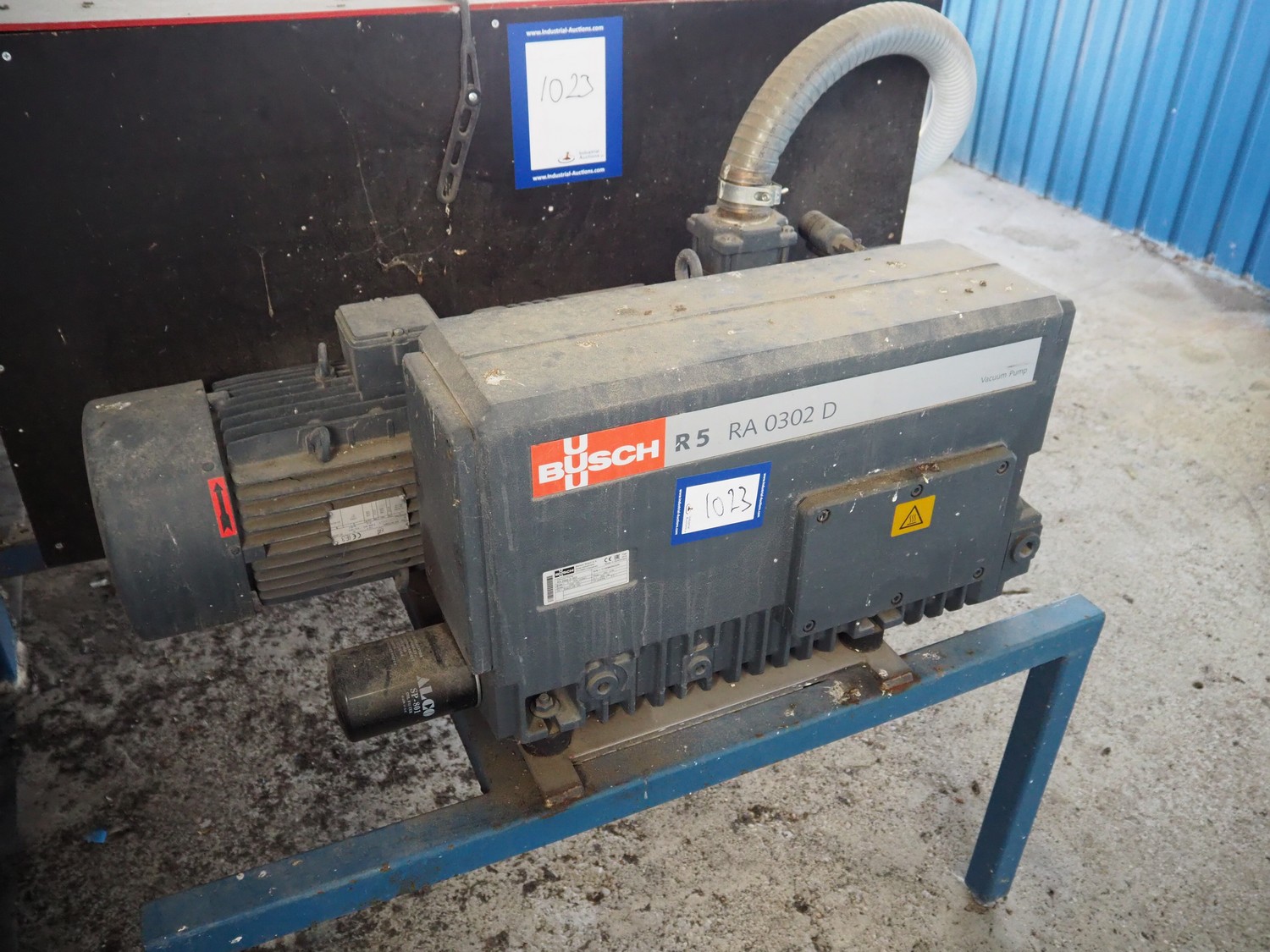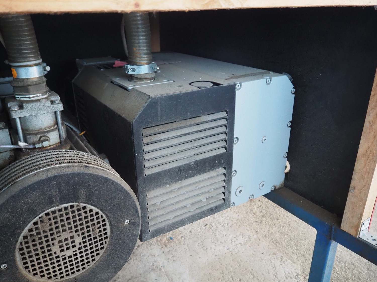 Steel rack with 4 Busch vacuum pumps, types: RA 0302 D 503 / (2x) RA 0250 D 561 DUXX / RA 0160 D 561 GQXX and 1 Gardner Denver vacuum pump, total dimensions: 3200 mm x 1500 mm x 1220 mm.