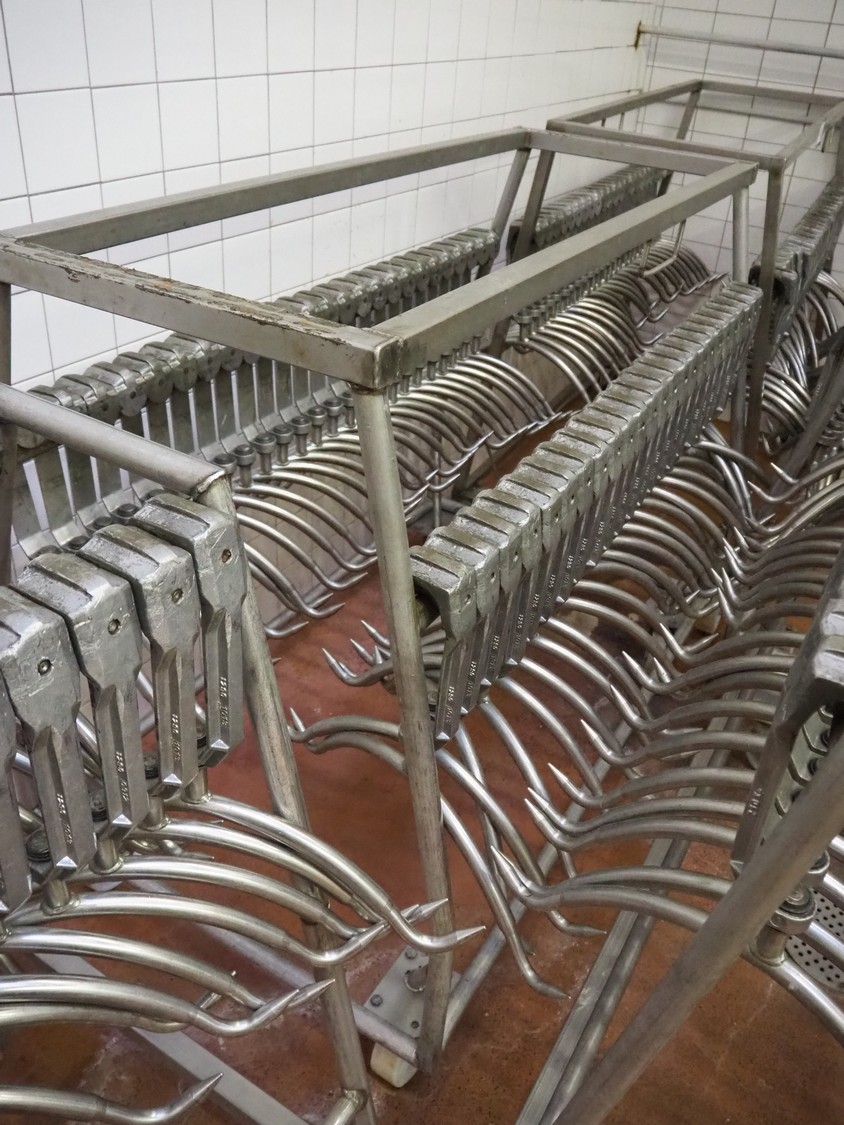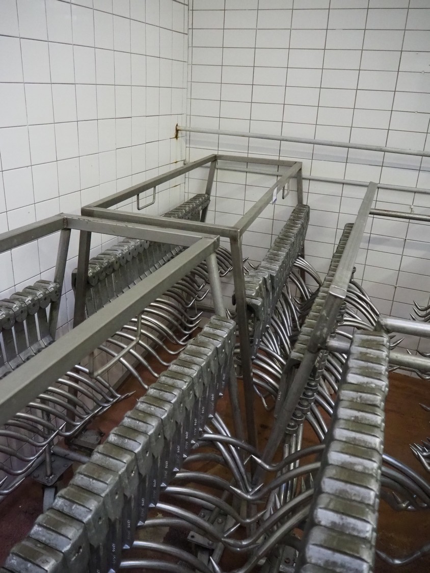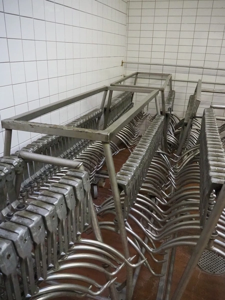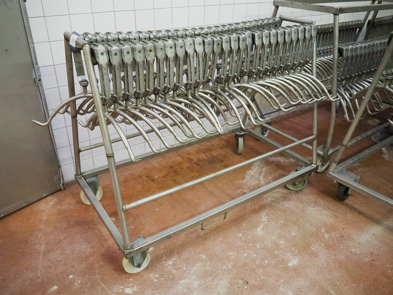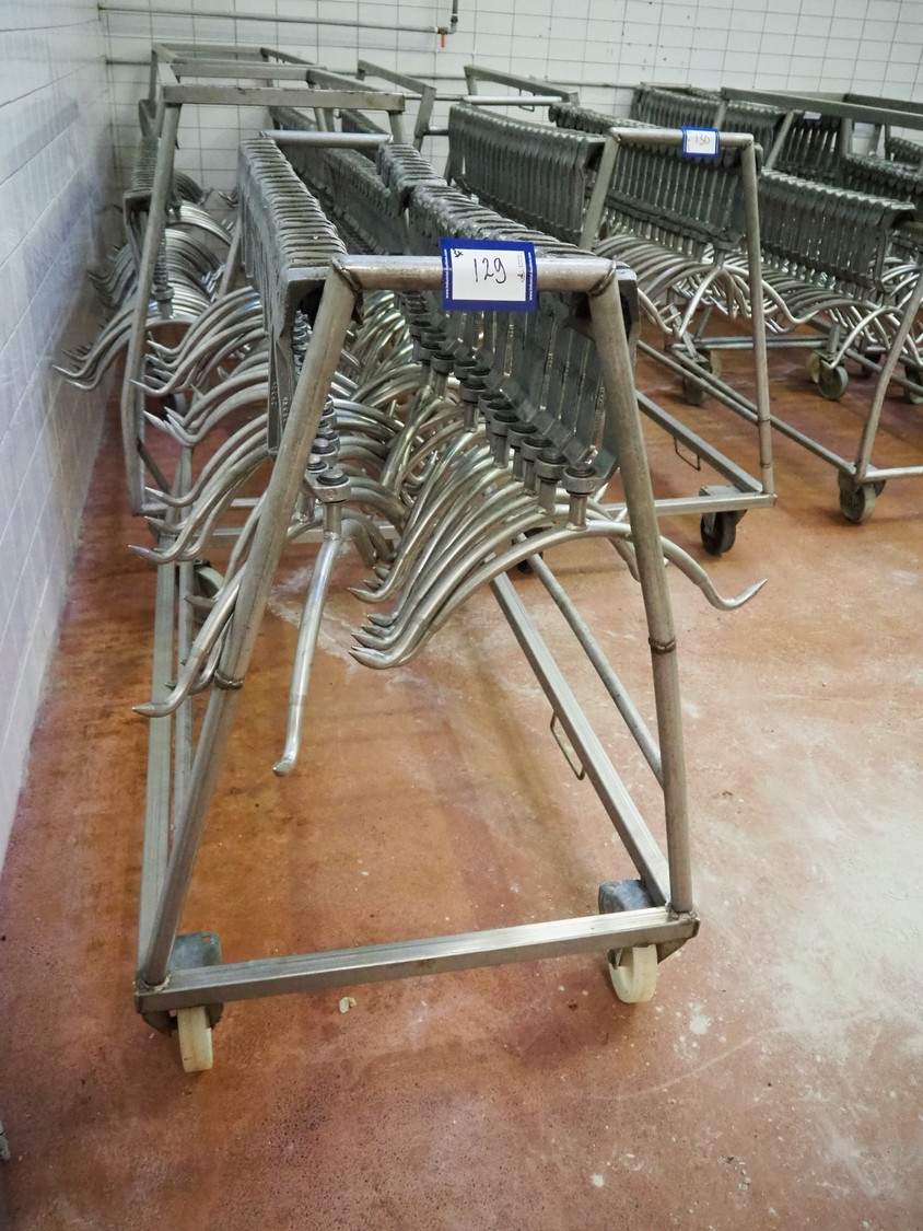 3 s/s trolleys with 154 s/s spreading hooks, dimensions trolleys: 1500 mm x 860 mm x 1210 mm and (2x) 1530 mm x 860 mm x 1280 mm.