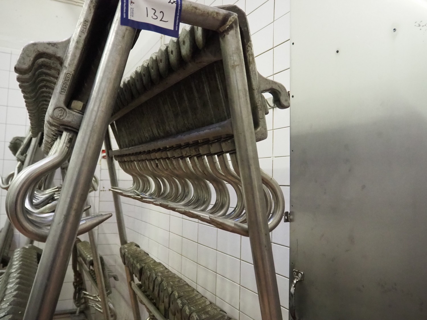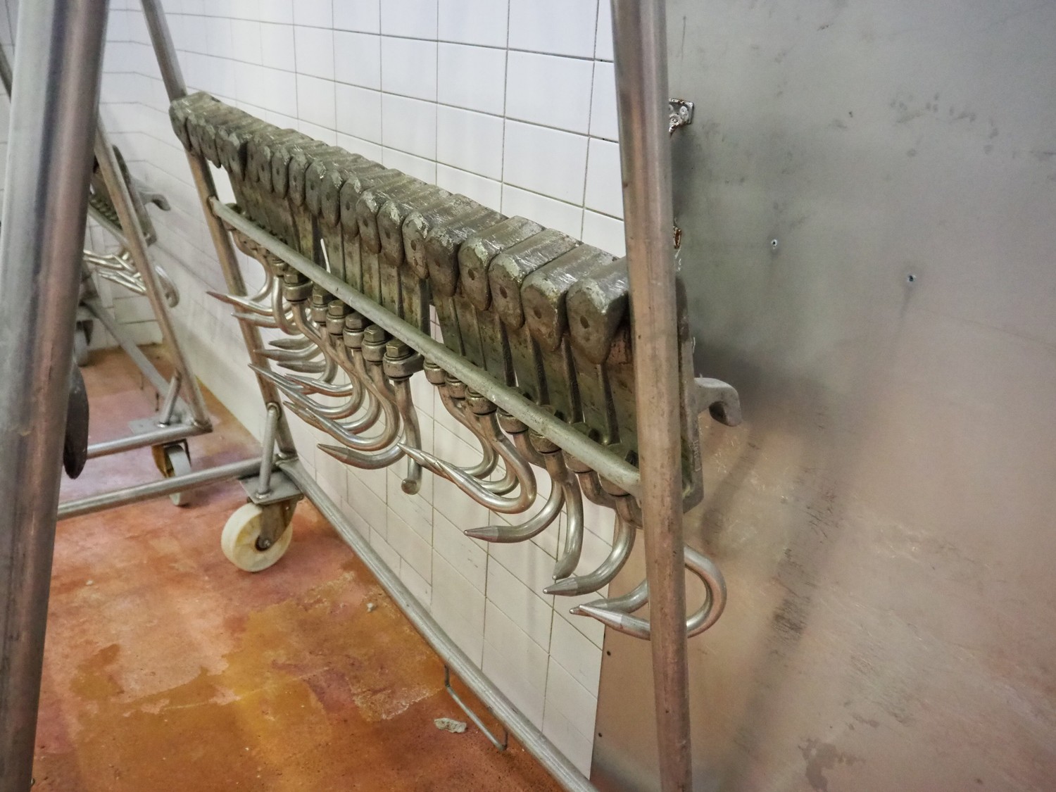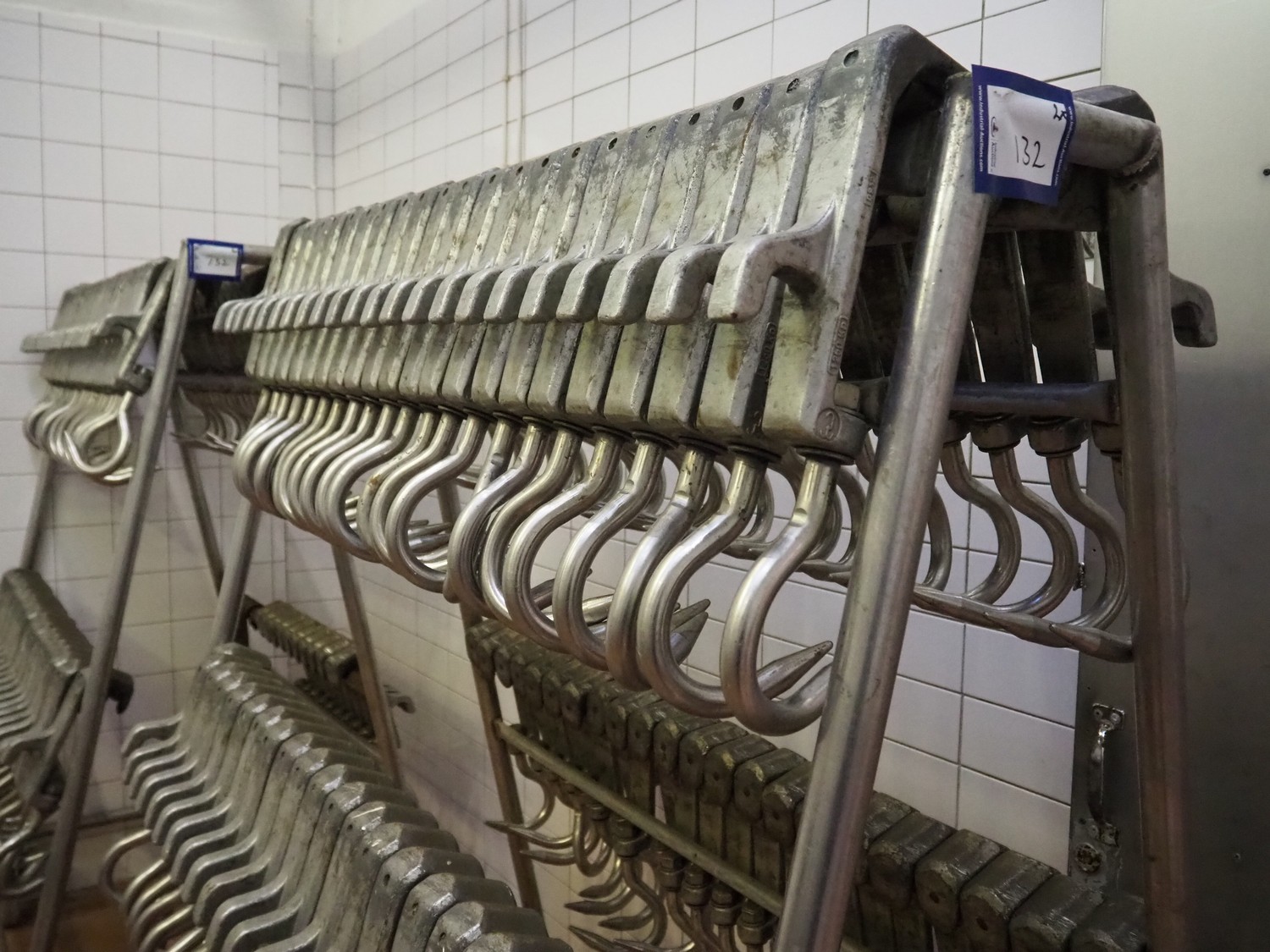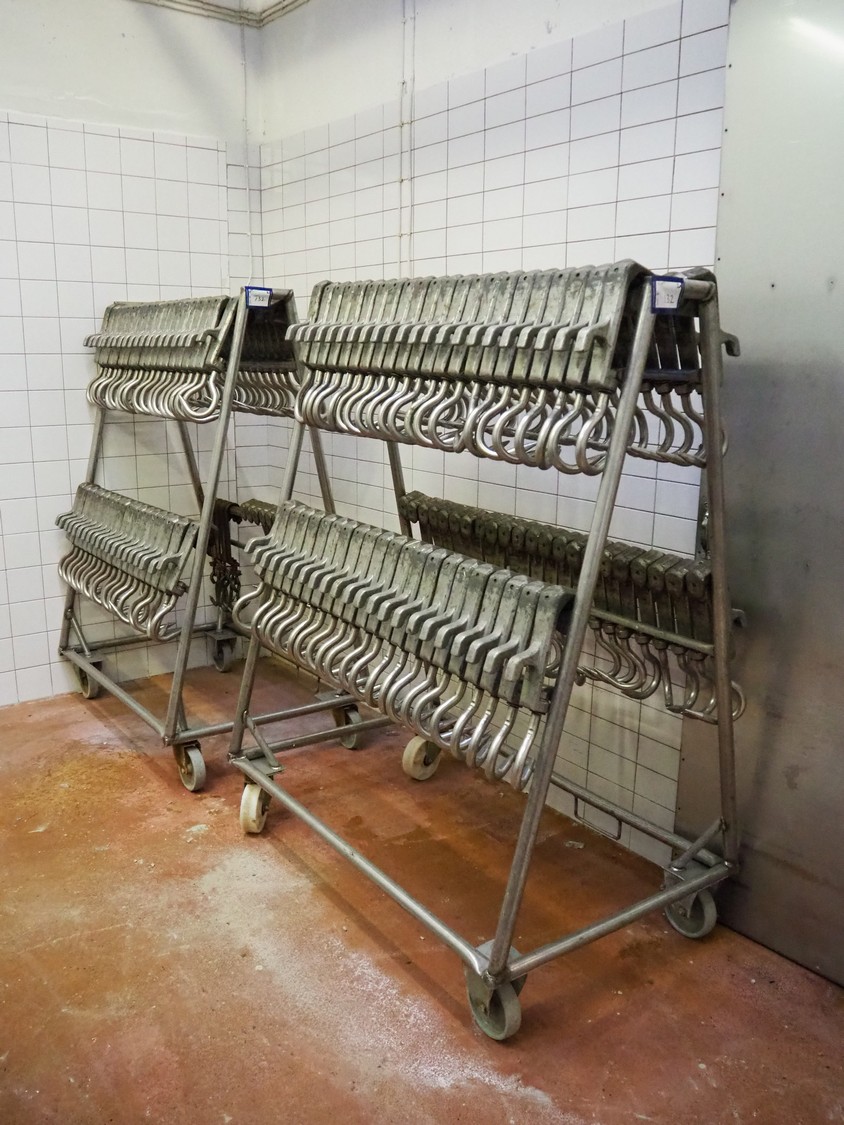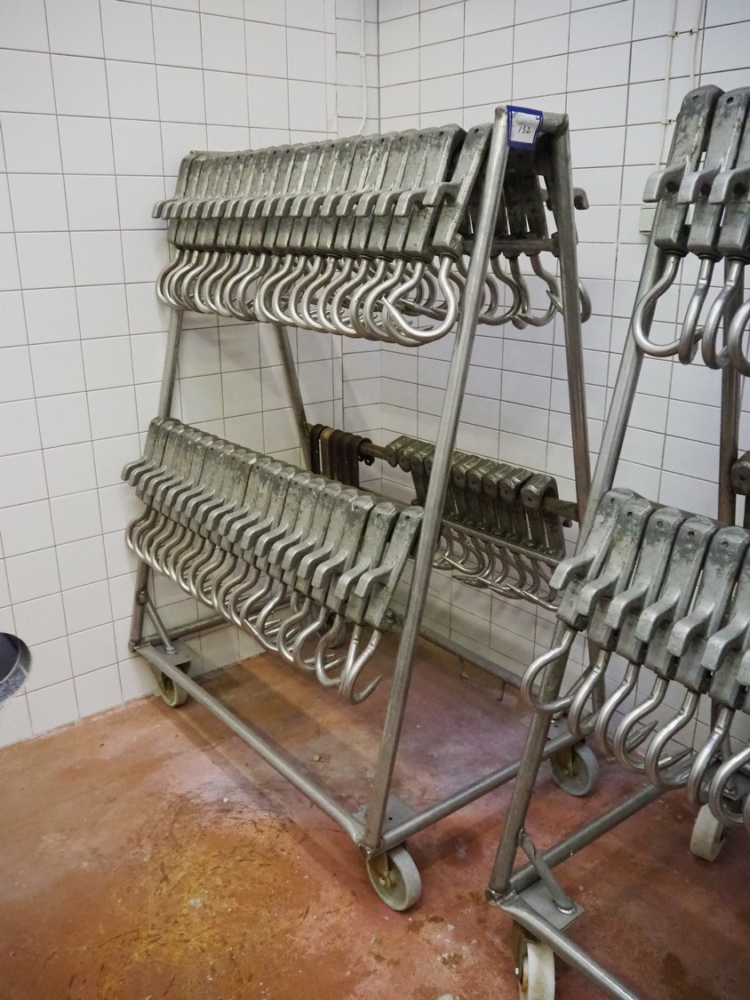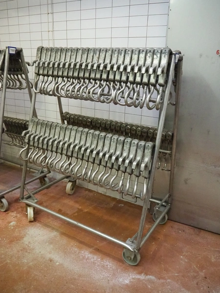 2 s/s trolleys with 150 s/s meat hooks for cattle, dimensions trolleys: (2x) 1370 mm x 860 mm x 1710 mm.