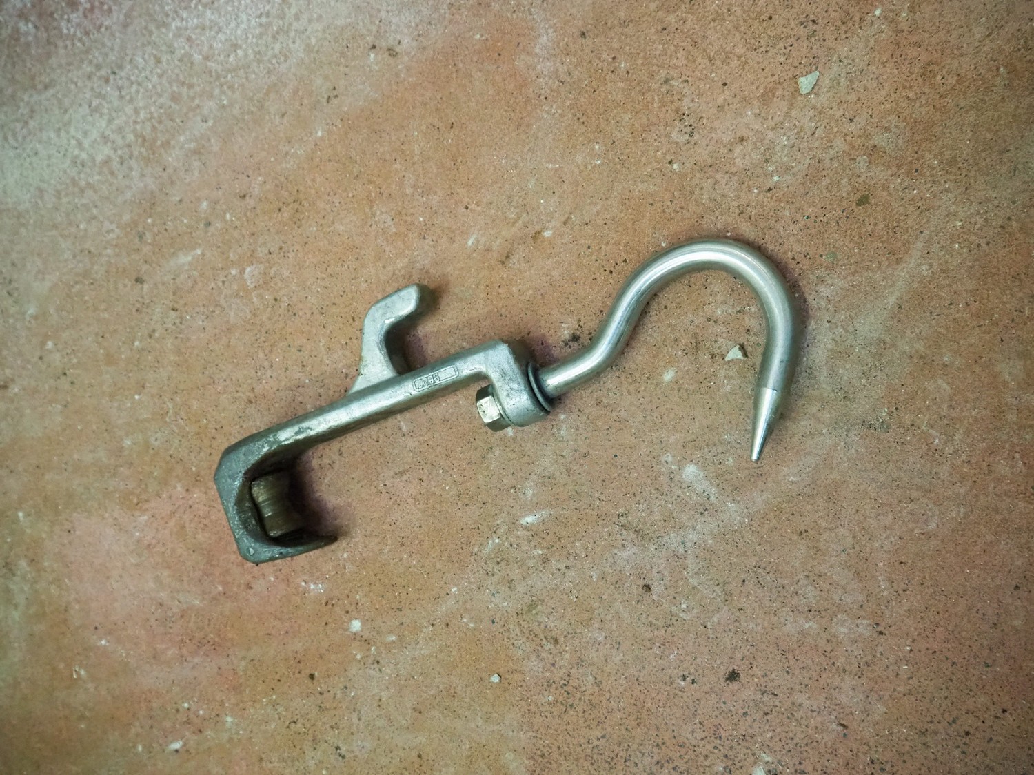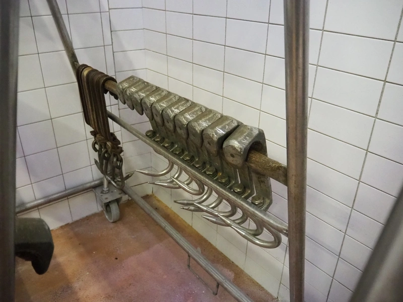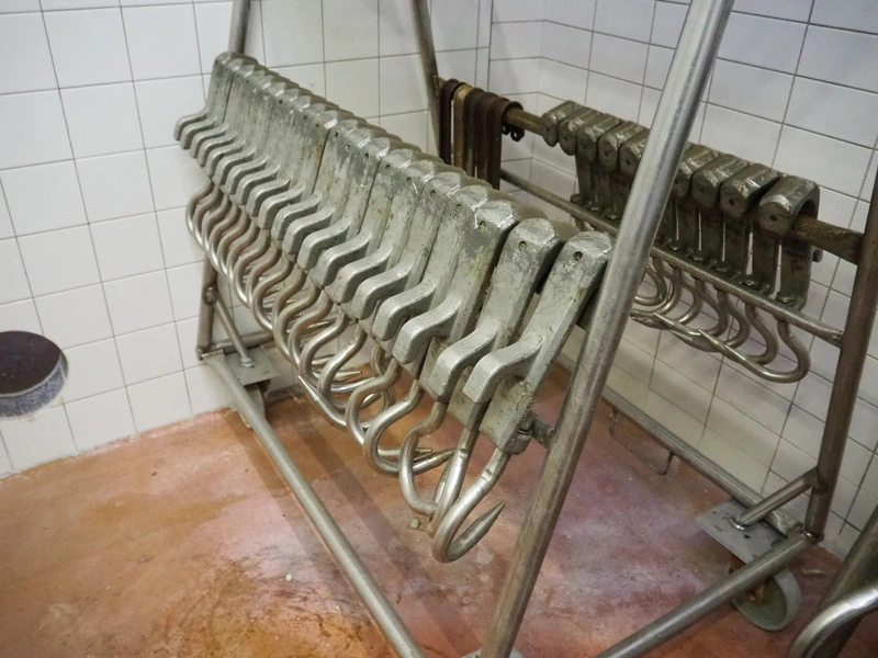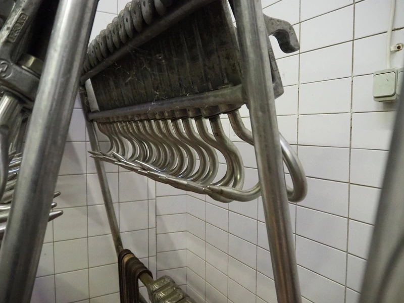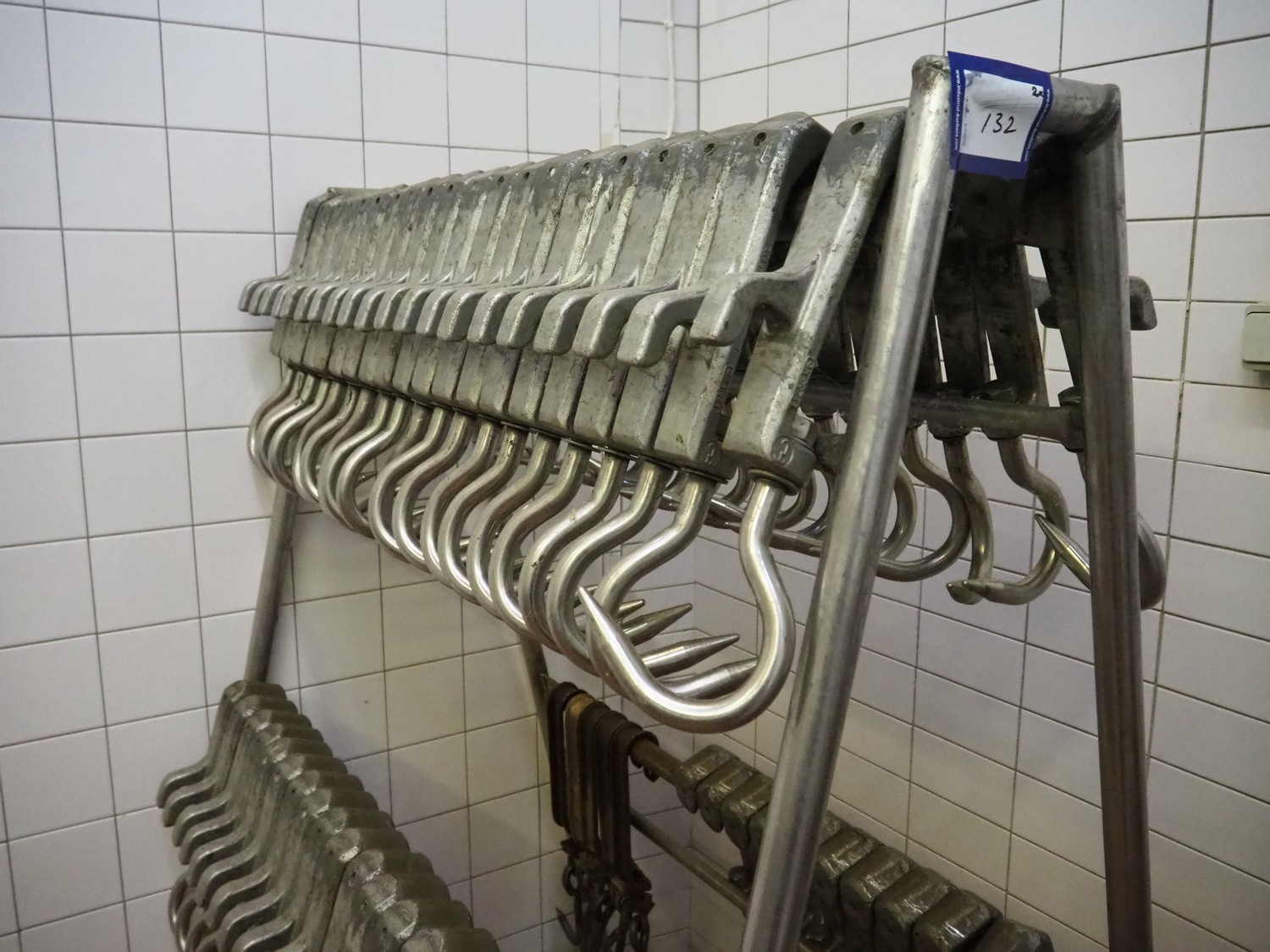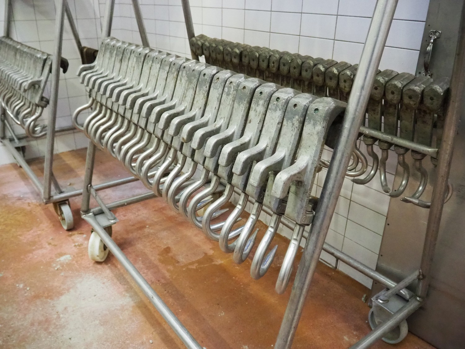 2 s/s trolleys with 150 s/s meat hooks for cattle, dimensions trolleys: (2x) 1370 mm x 860 mm x 1710 mm.