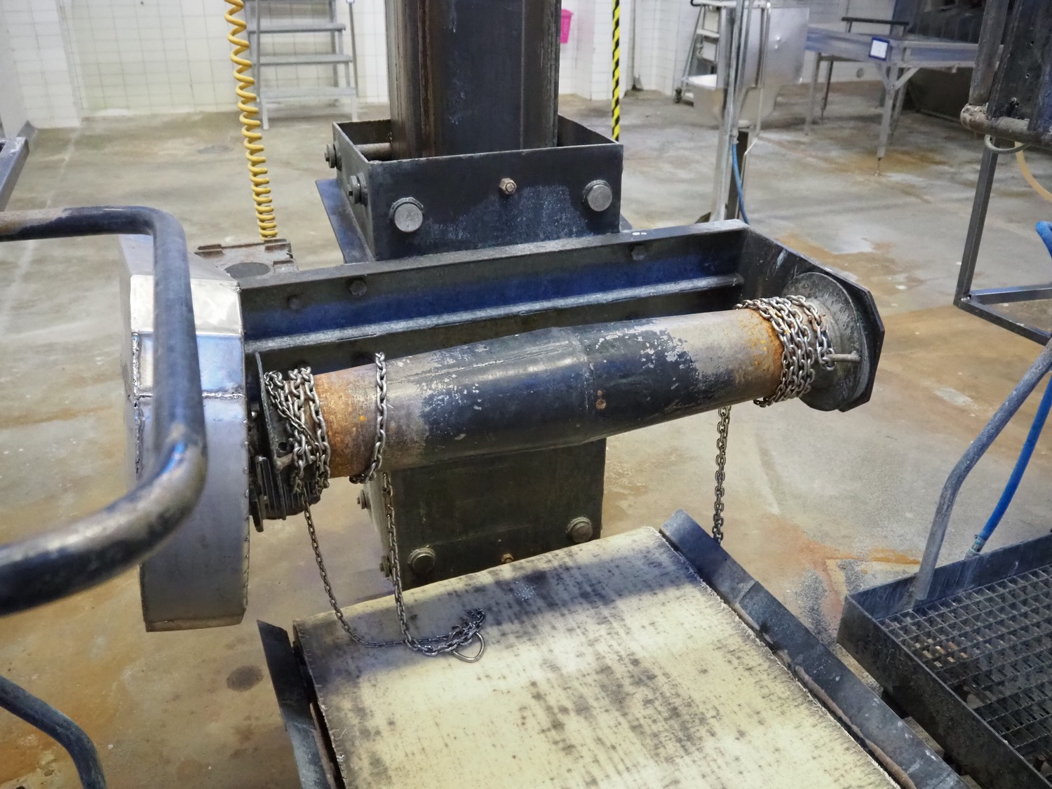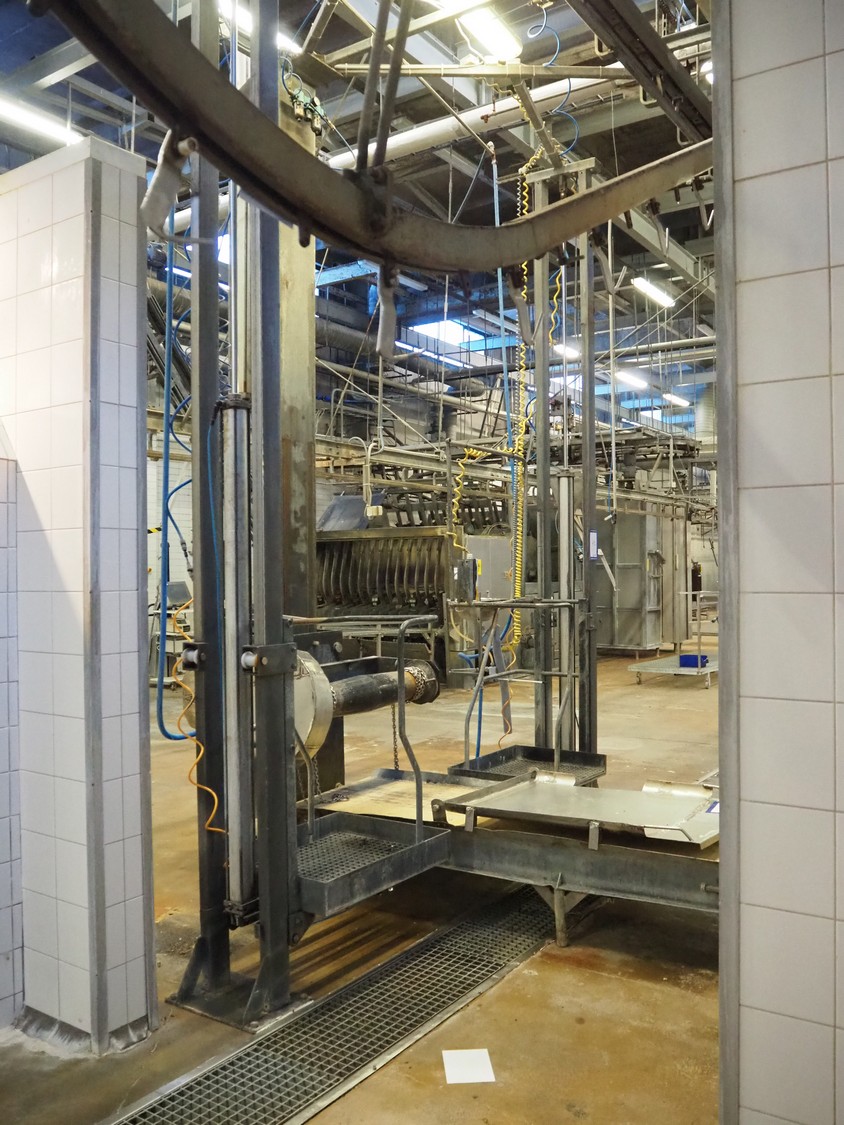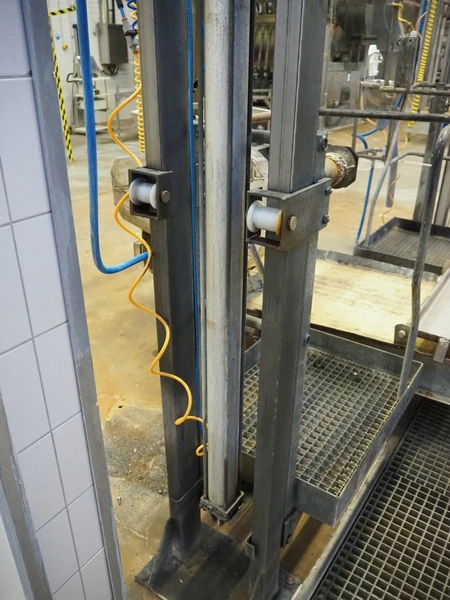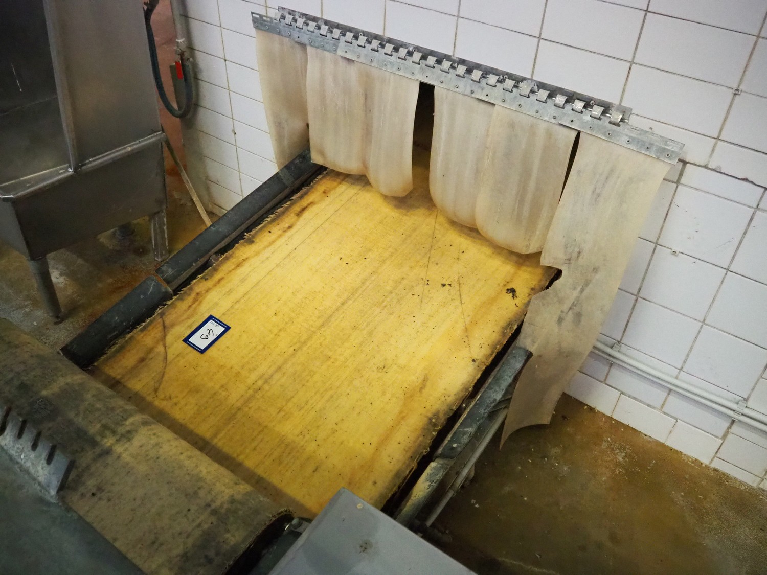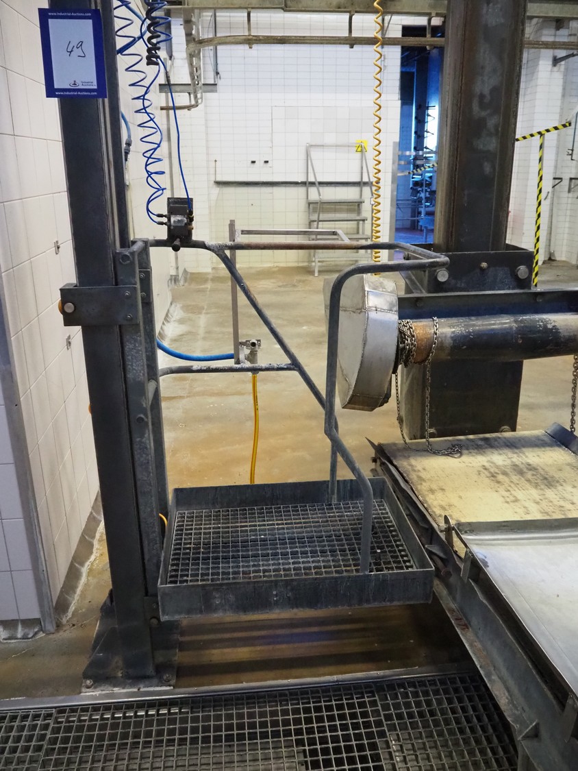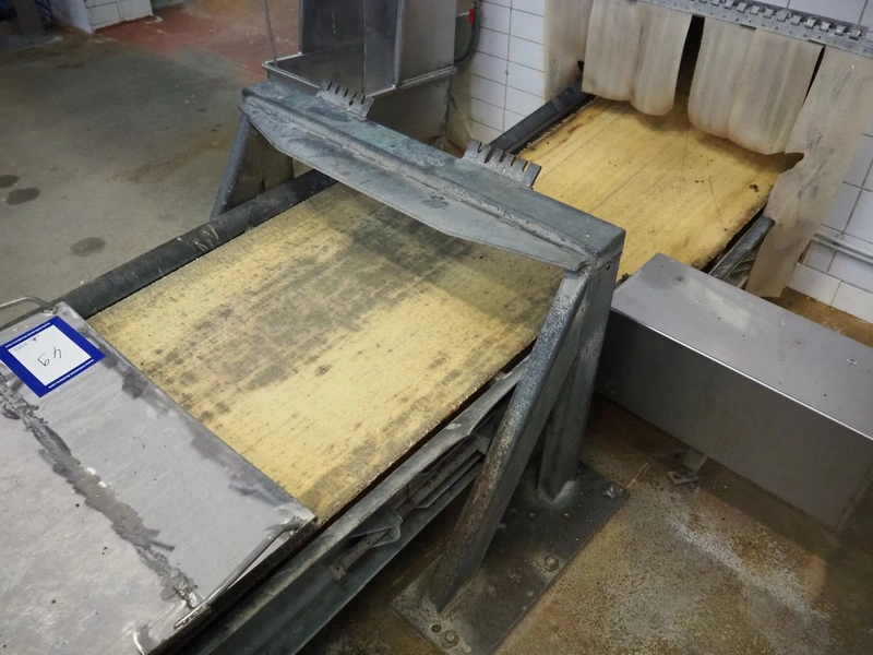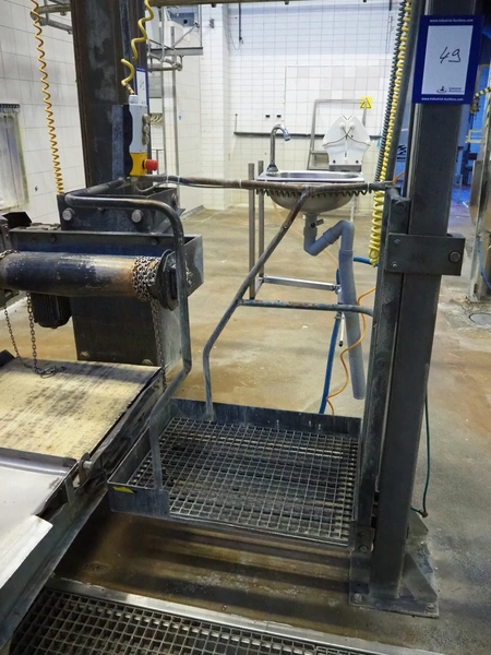 Dehider for cattle, roll width: 970 mm, total dimensions: 1300 mm x 1150 mm x 4700 mm. Including 2 galvanized steel platforms with s/s sinks, dimensions platform: 800 mm x 600 mm, total dimensions platforms: (2x) 1150 mm x 950 mm x 4200 mm, transport belt, steel frame, plastic belt, belt width: 800 mm, total dimensions transport belt: 2350 mm x 1730 mm x 780 mm and elevating belt, steel frame, plastic belt, belt width: 780 mm, elevating height: 1140 mm, total dimensions: 5750 mm x 1050 mm x 1190 mm.
