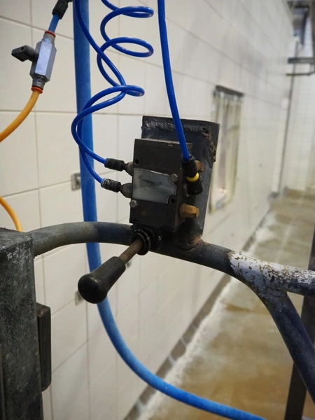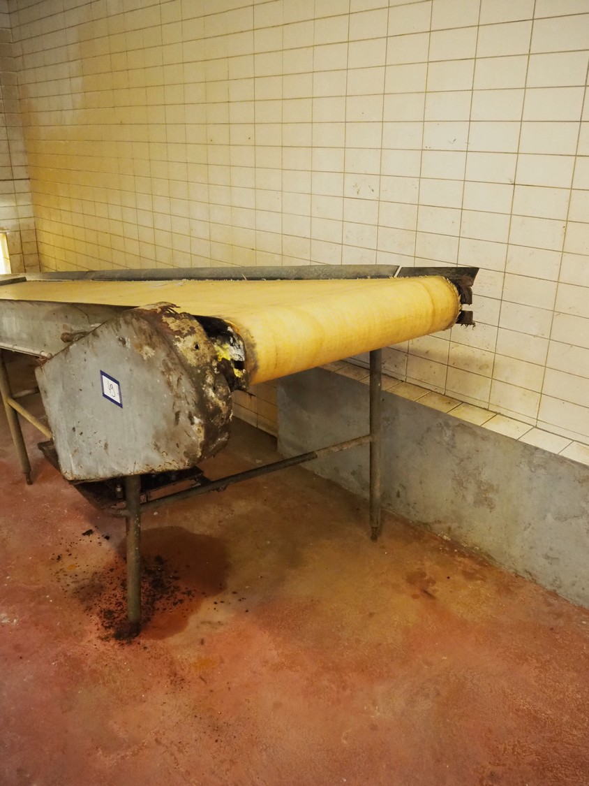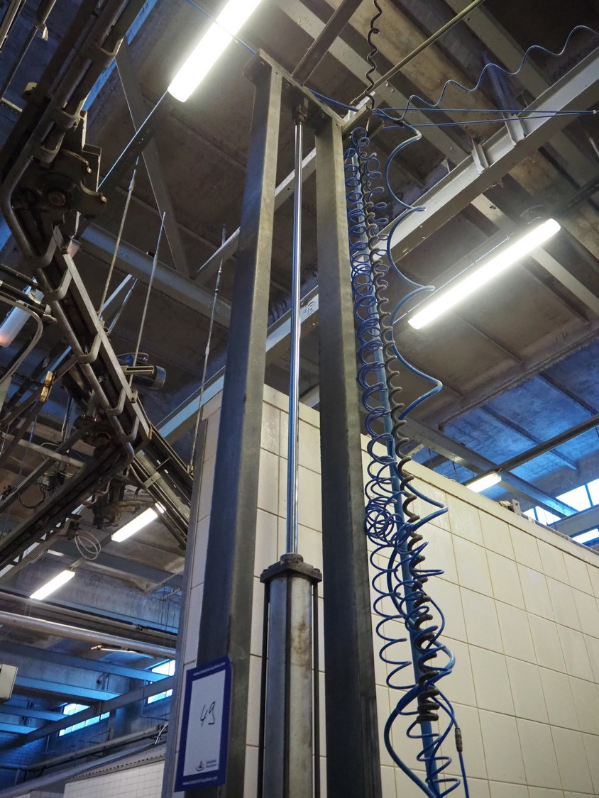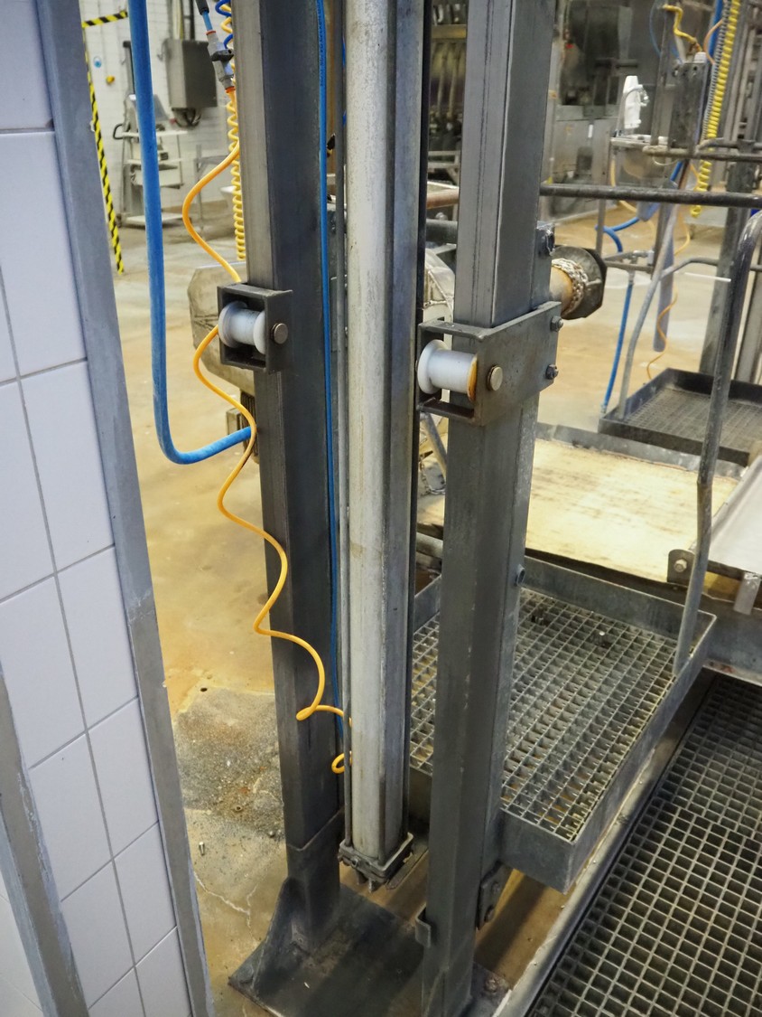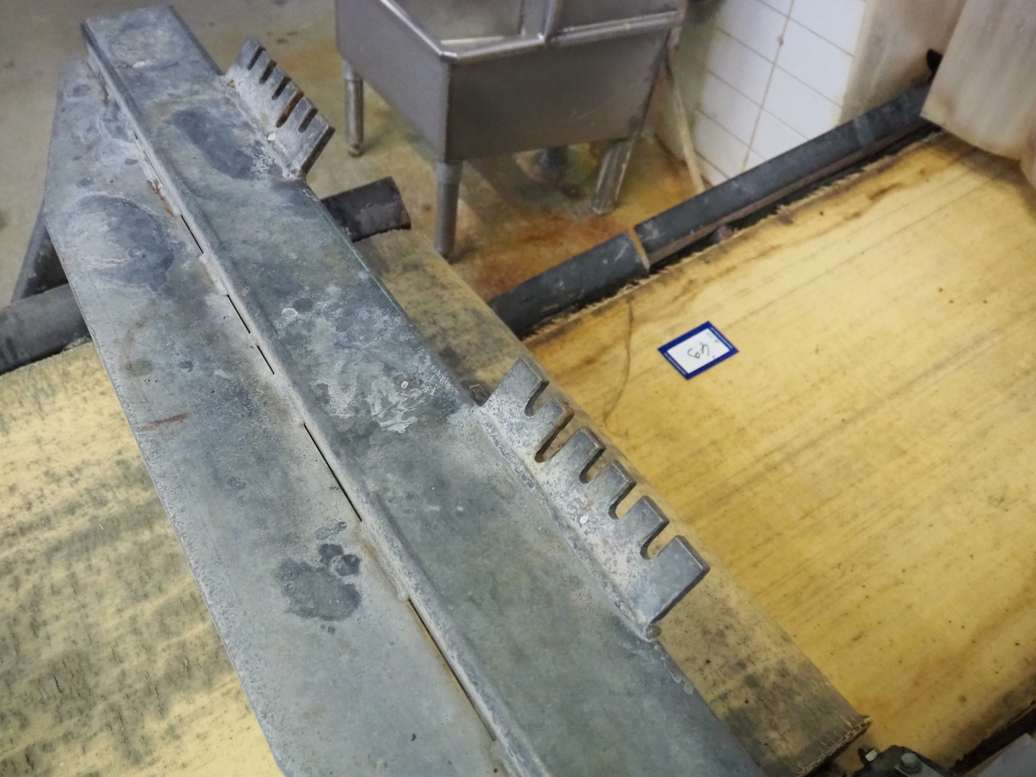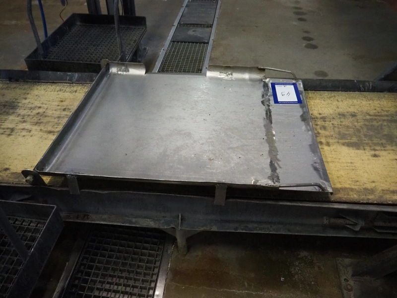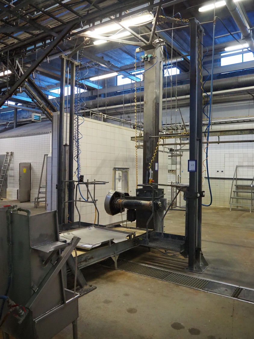 Dehider for cattle, roll width: 970 mm, total dimensions: 1300 mm x 1150 mm x 4700 mm. Including 2 galvanized steel platforms with s/s sinks, dimensions platform: 800 mm x 600 mm, total dimensions platforms: (2x) 1150 mm x 950 mm x 4200 mm, transport belt, steel frame, plastic belt, belt width: 800 mm, total dimensions transport belt: 2350 mm x 1730 mm x 780 mm and elevating belt, steel frame, plastic belt, belt width: 780 mm, elevating height: 1140 mm, total dimensions: 5750 mm x 1050 mm x 1190 mm.