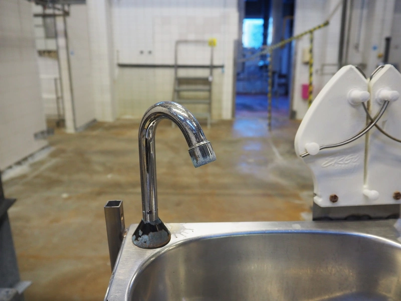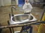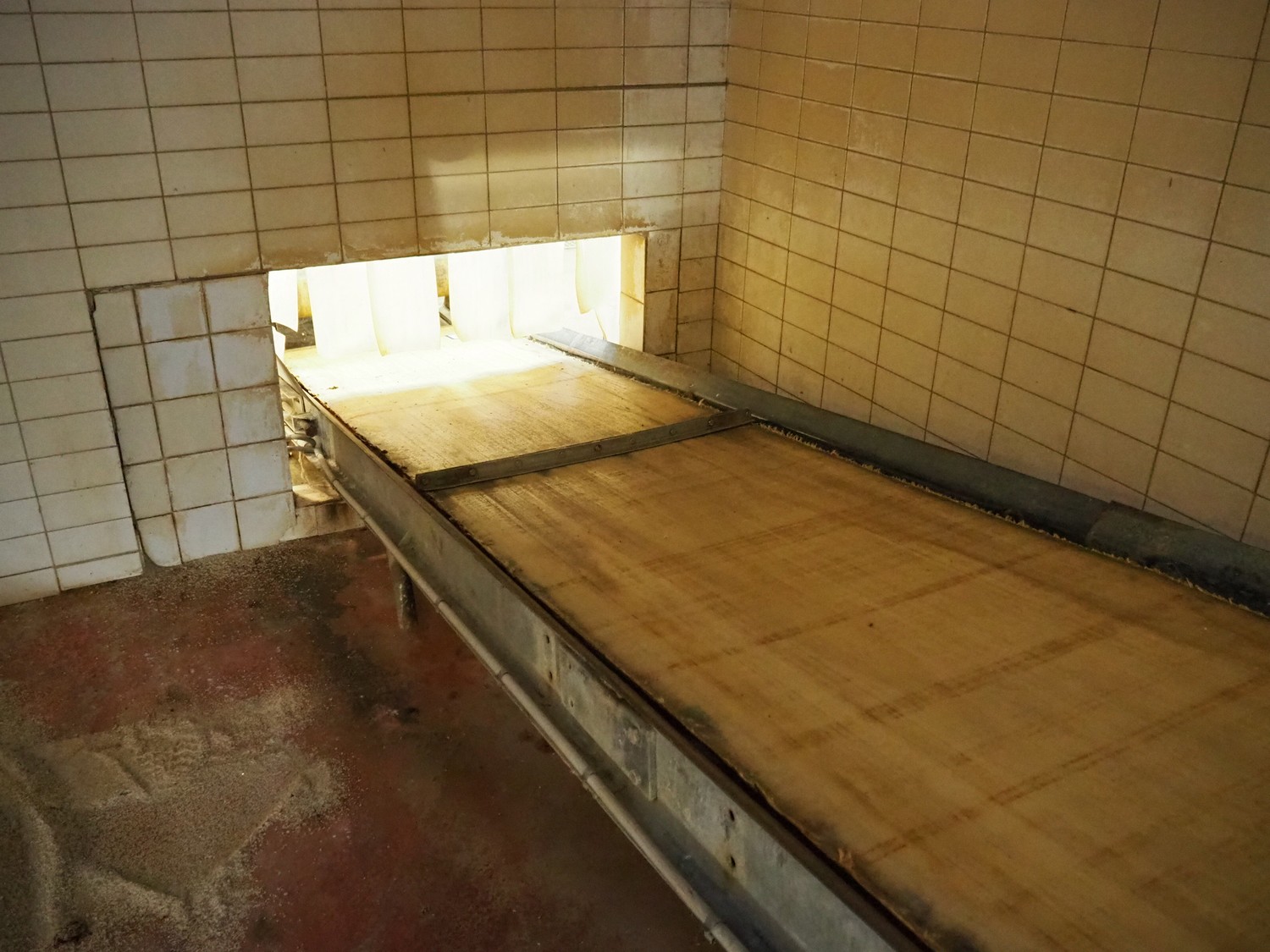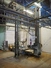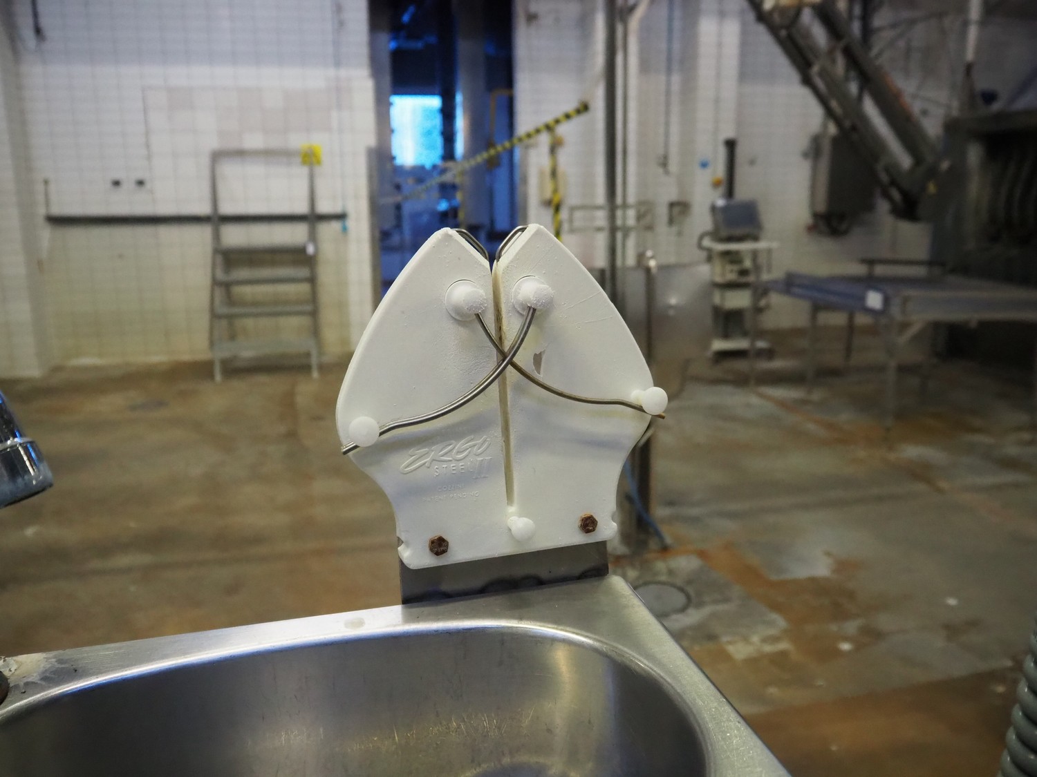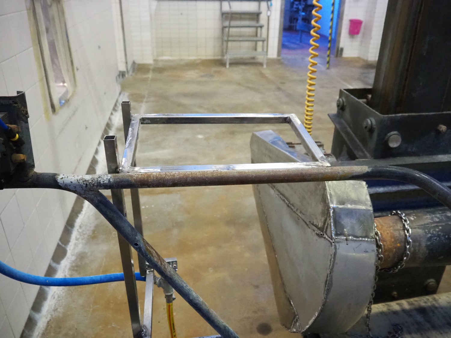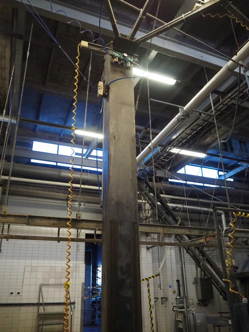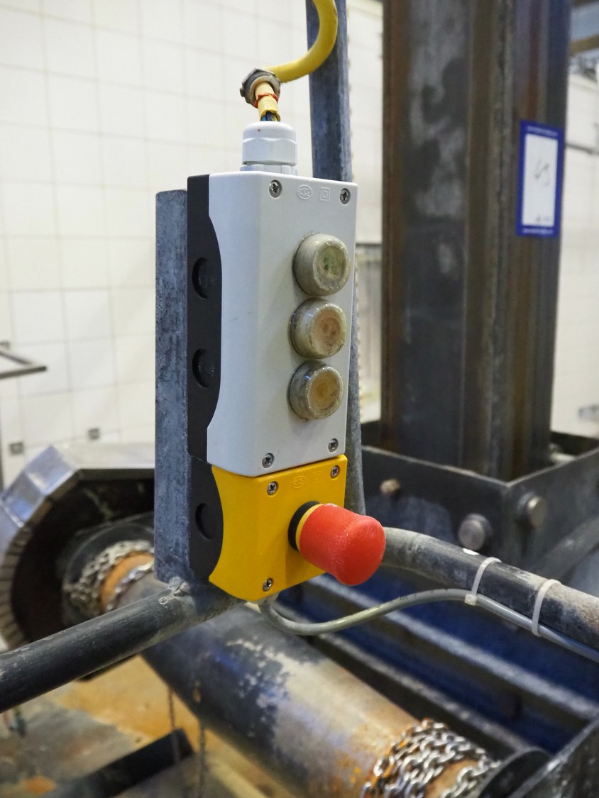 Dehider for cattle, roll width: 970 mm, total dimensions: 1300 mm x 1150 mm x 4700 mm. Including 2 galvanized steel platforms with s/s sinks, dimensions platform: 800 mm x 600 mm, total dimensions platforms: (2x) 1150 mm x 950 mm x 4200 mm, transport belt, steel frame, plastic belt, belt width: 800 mm, total dimensions transport belt: 2350 mm x 1730 mm x 780 mm and elevating belt, steel frame, plastic belt, belt width: 780 mm, elevating height: 1140 mm, total dimensions: 5750 mm x 1050 mm x 1190 mm.