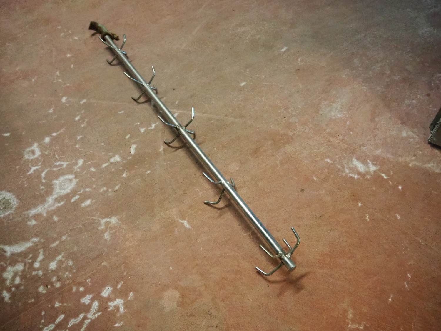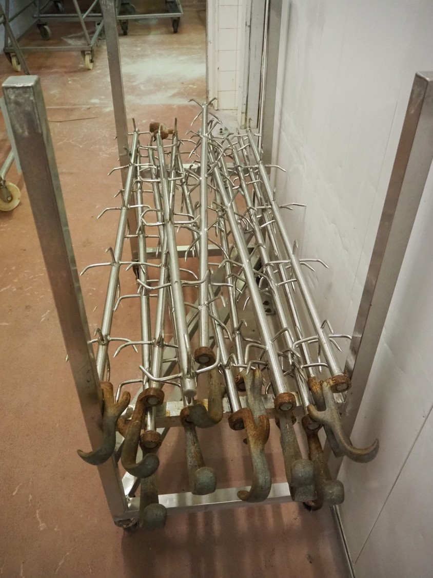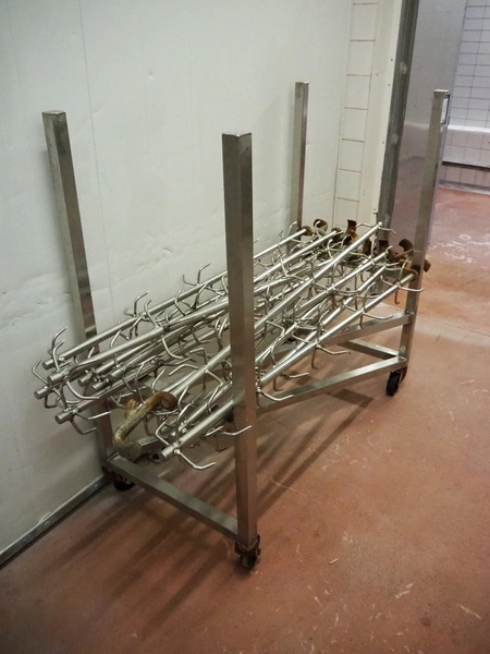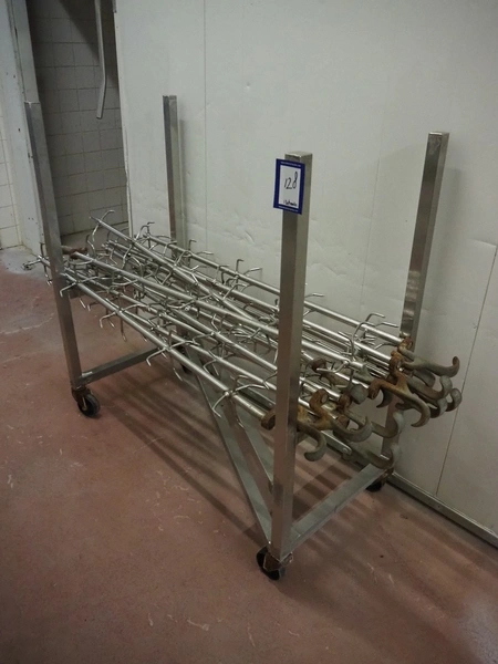 S/s trolley with 13 s/s organ hooks, dimensions trolley: 1220 mm x 590 mm x 1240 mm.
