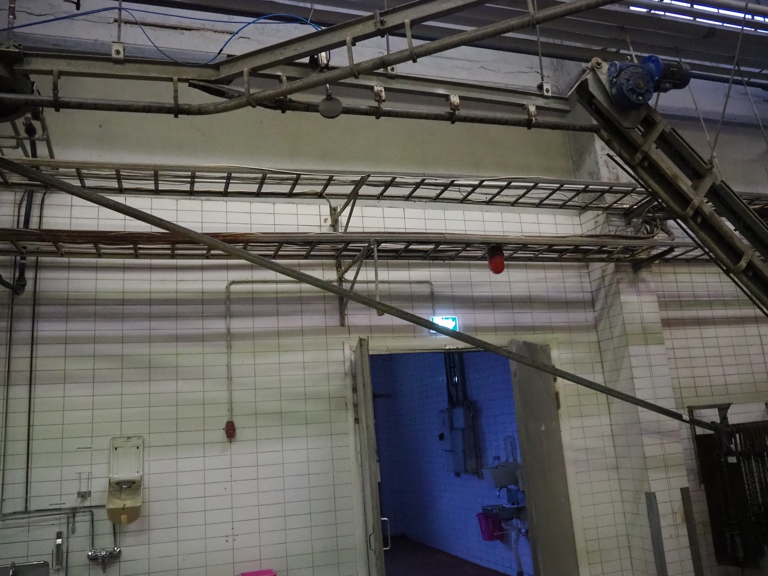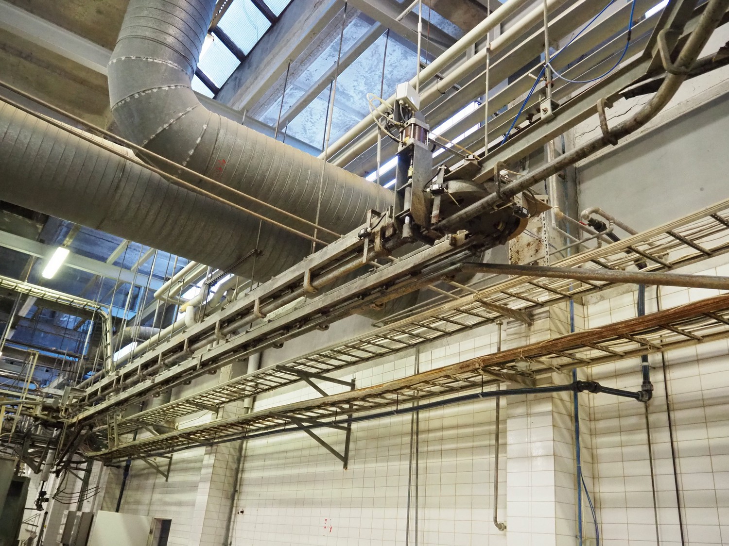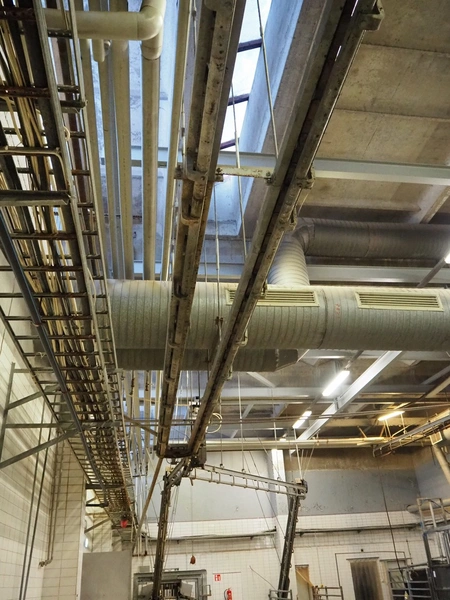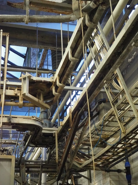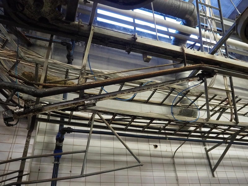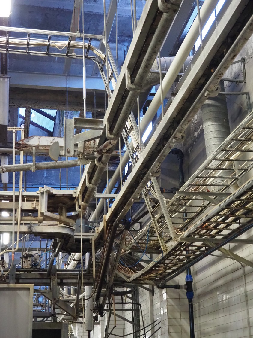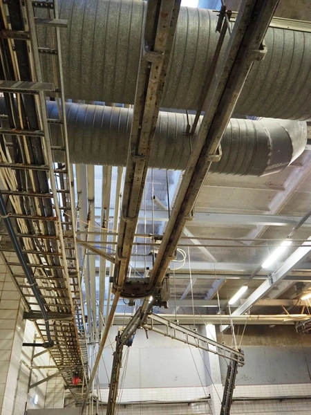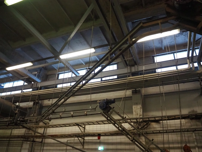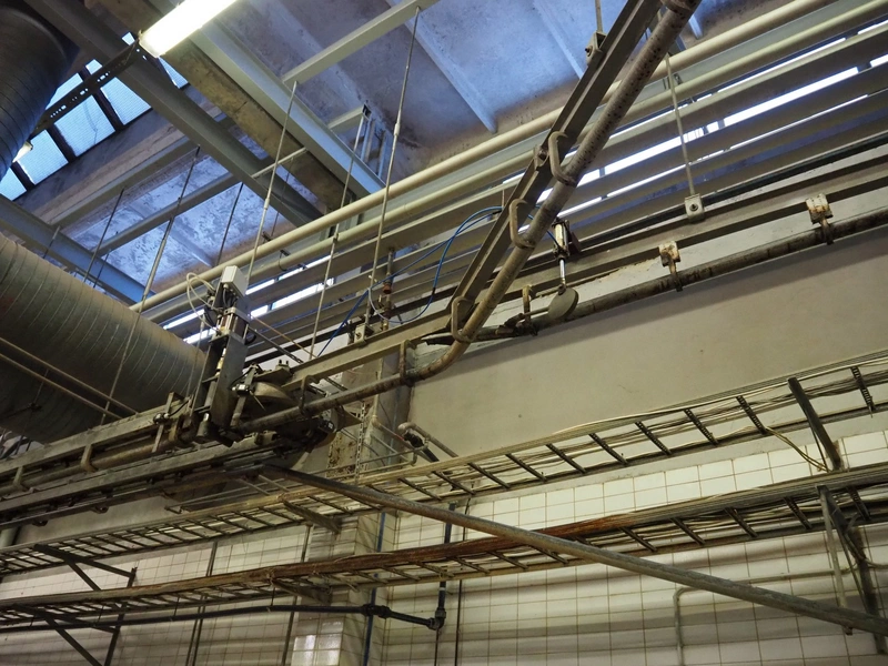 Nakkilan Konepaja OY overhead tube rail conveyor for pig slaughtering line, diameter tube: 60 mm, total length: approximately: 50 meter.
