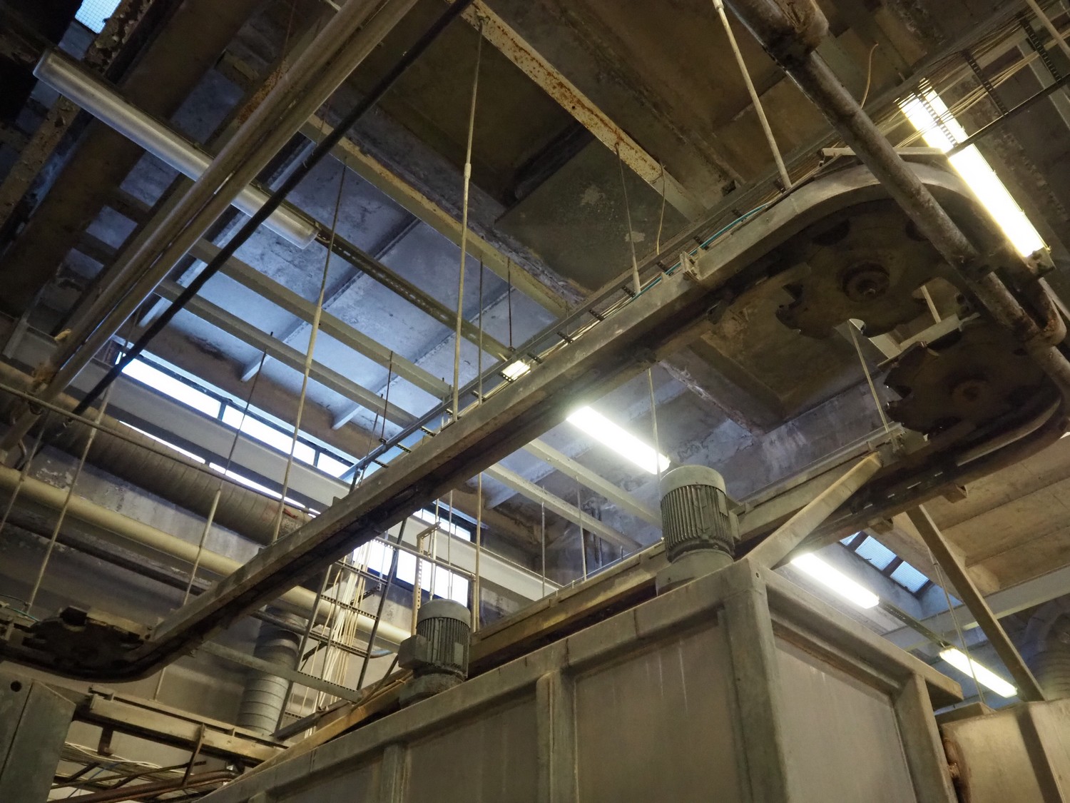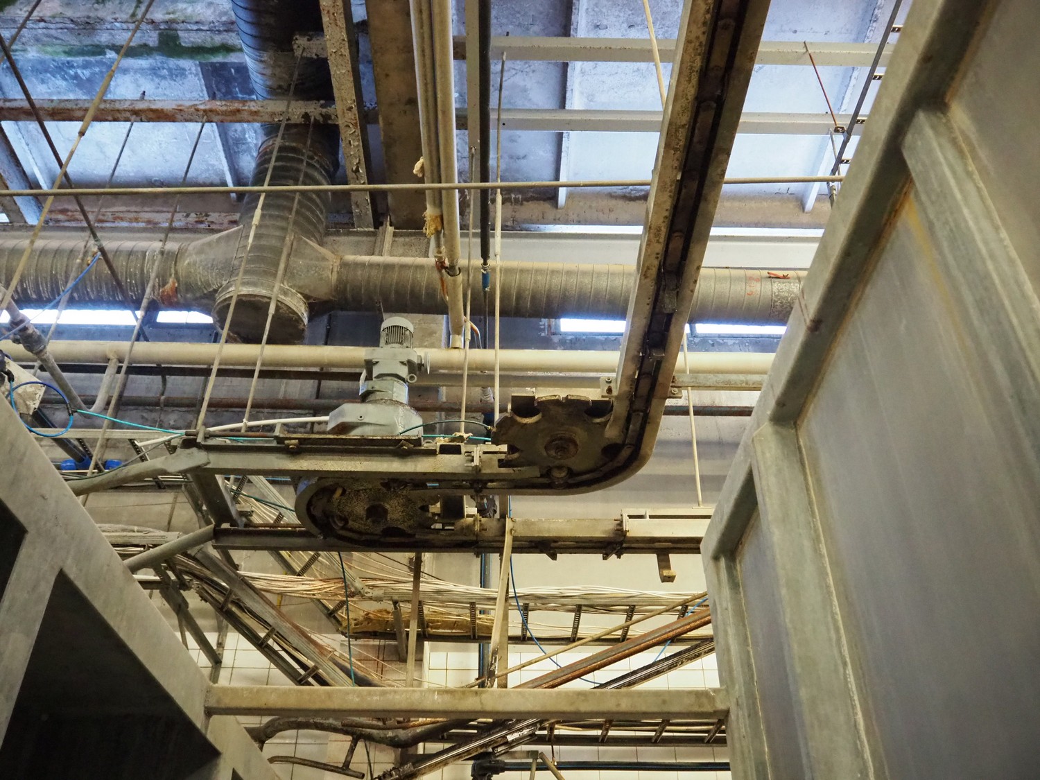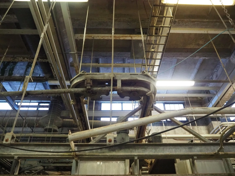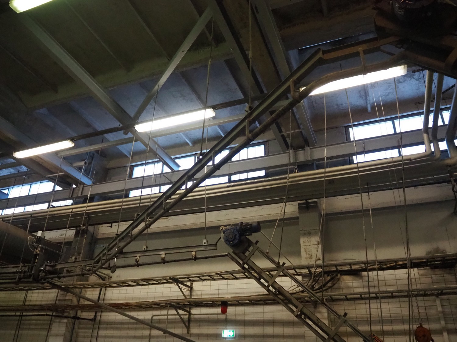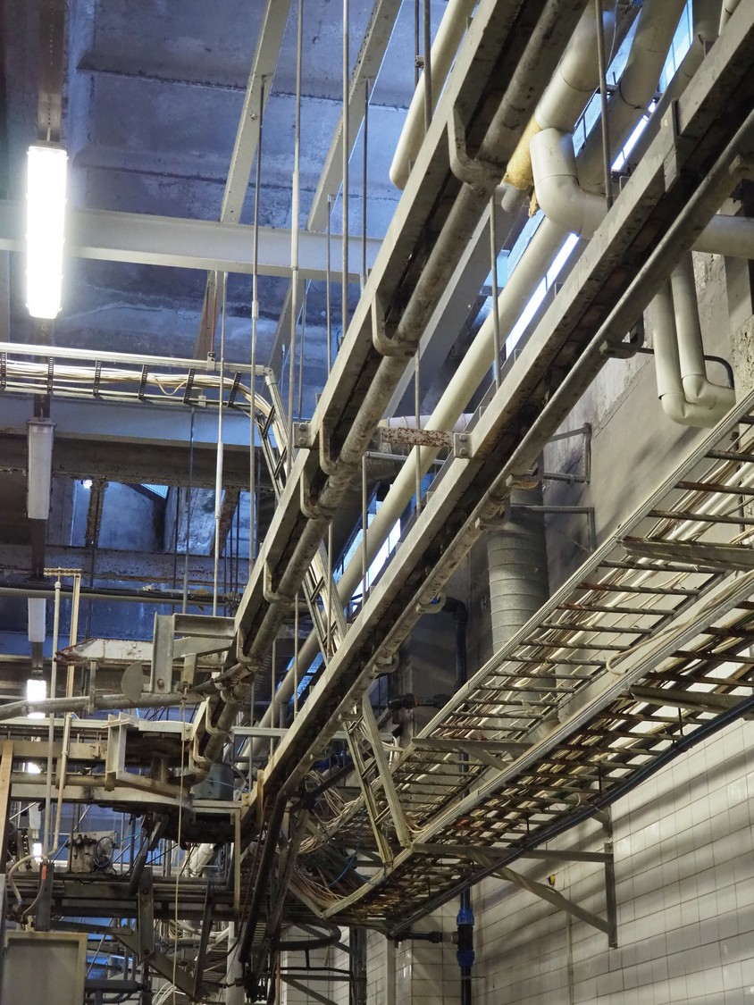 Nakkilan Konepaja OY overhead tube rail conveyor for pig slaughtering line, diameter tube: 60 mm, total length: approximately: 50 meter.