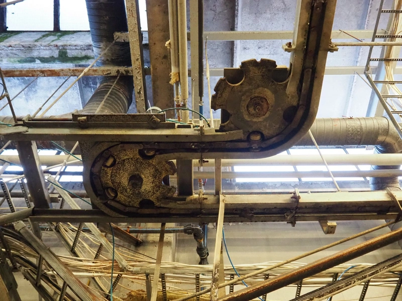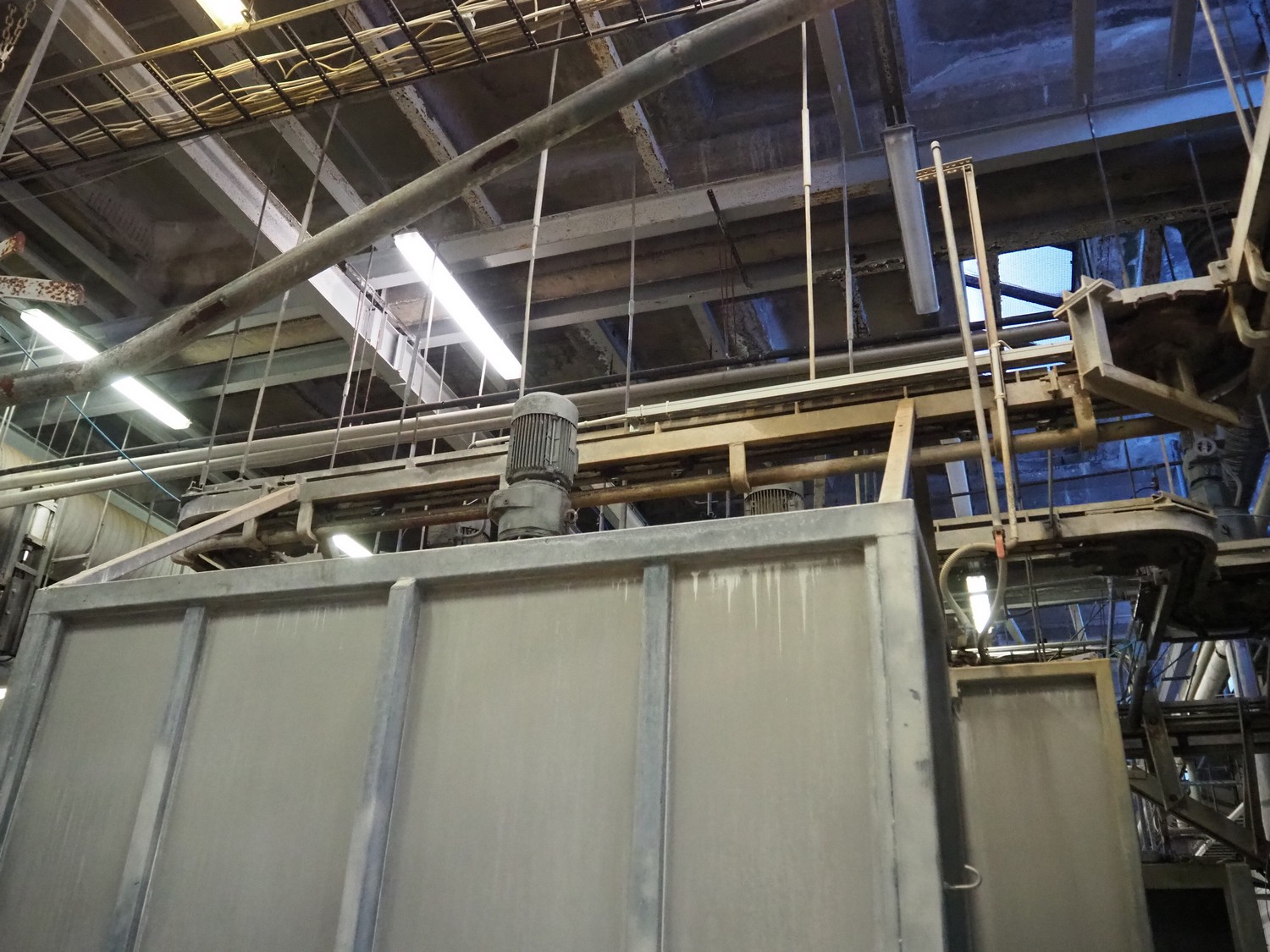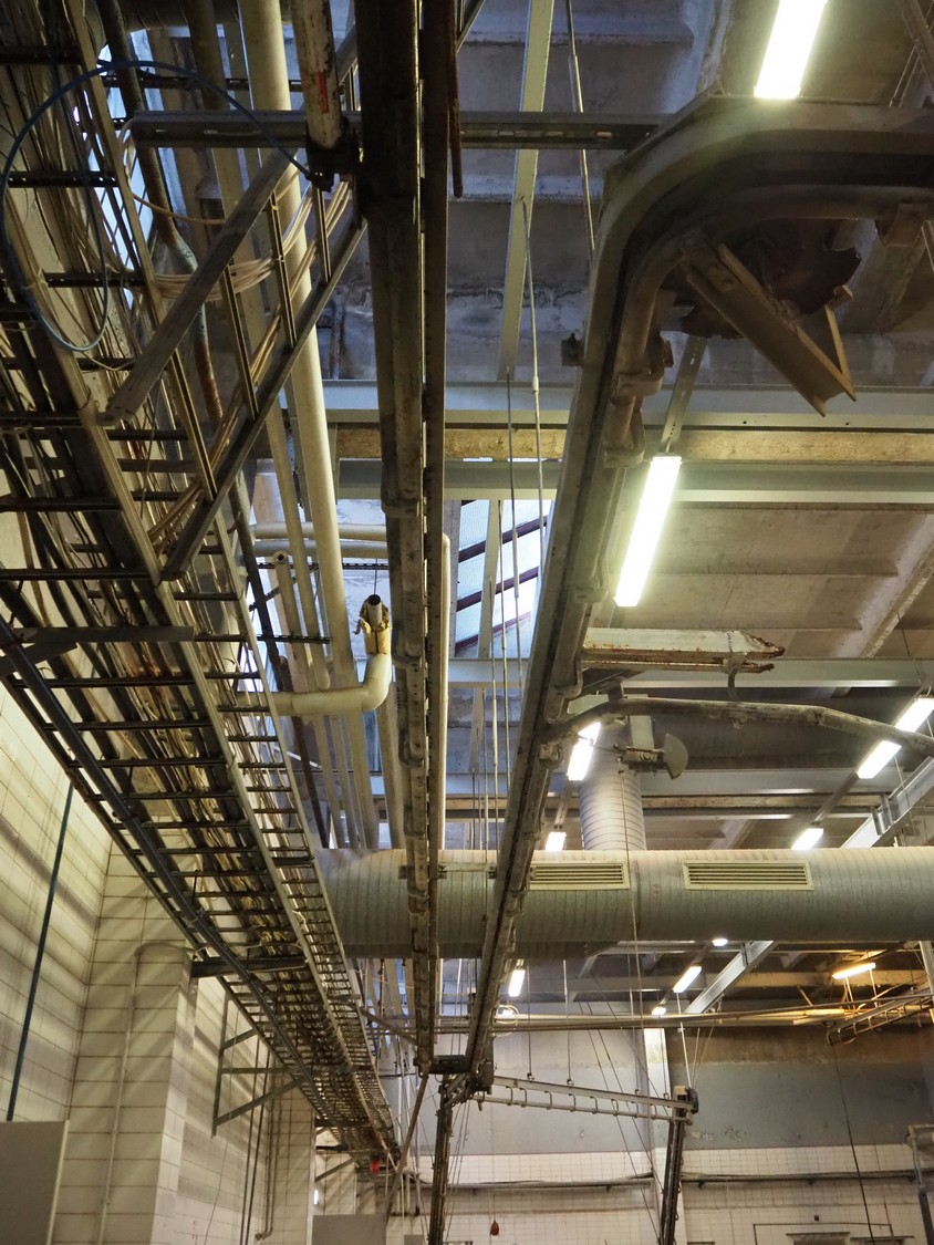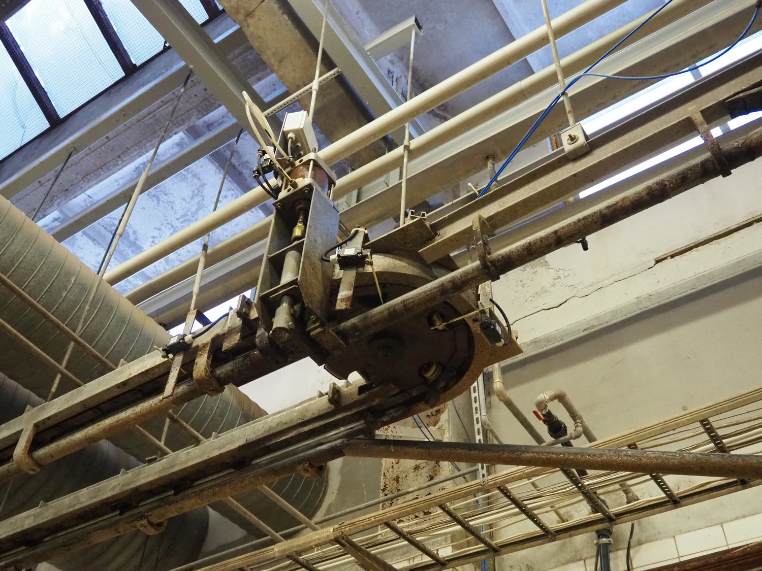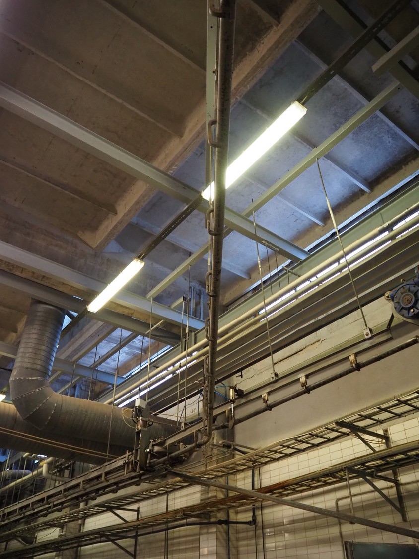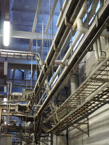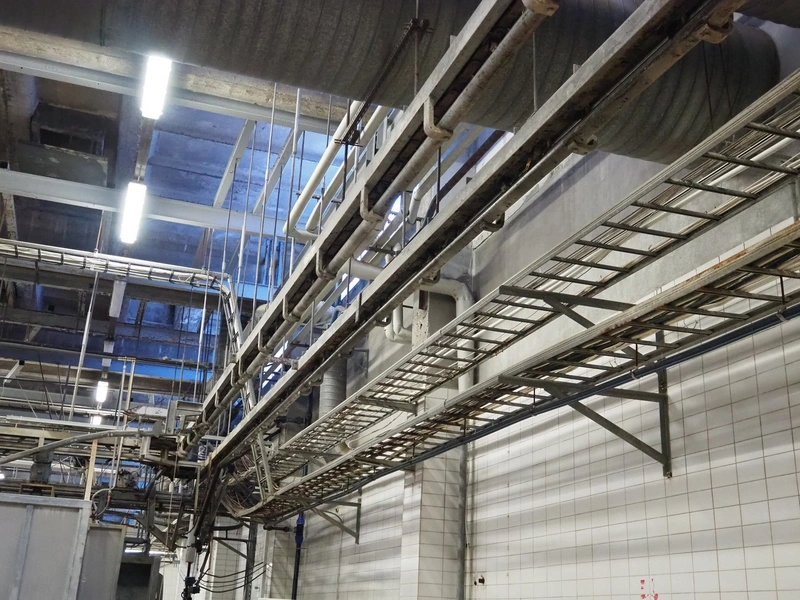 Nakkilan Konepaja OY overhead tube rail conveyor for pig slaughtering line, diameter tube: 60 mm, total length: approximately: 50 meter.