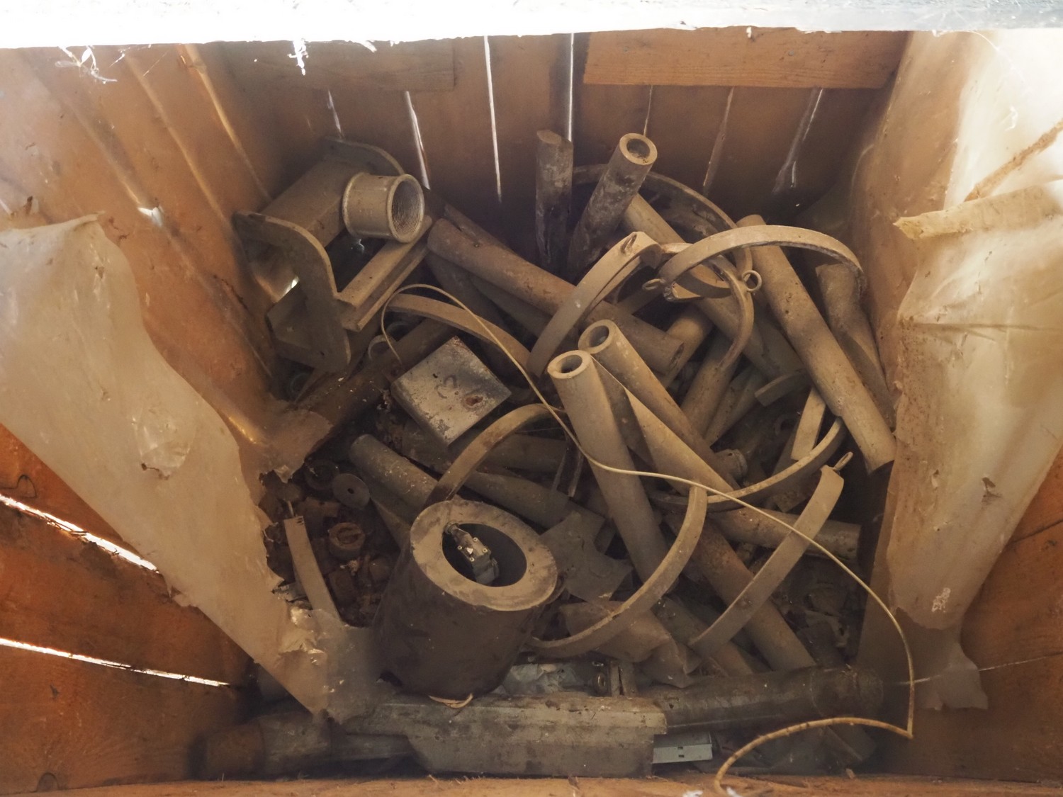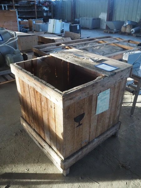 Wooden crate with various steel tube rails, dimensions crate: 900 mm x 900 mm x 950 mm.