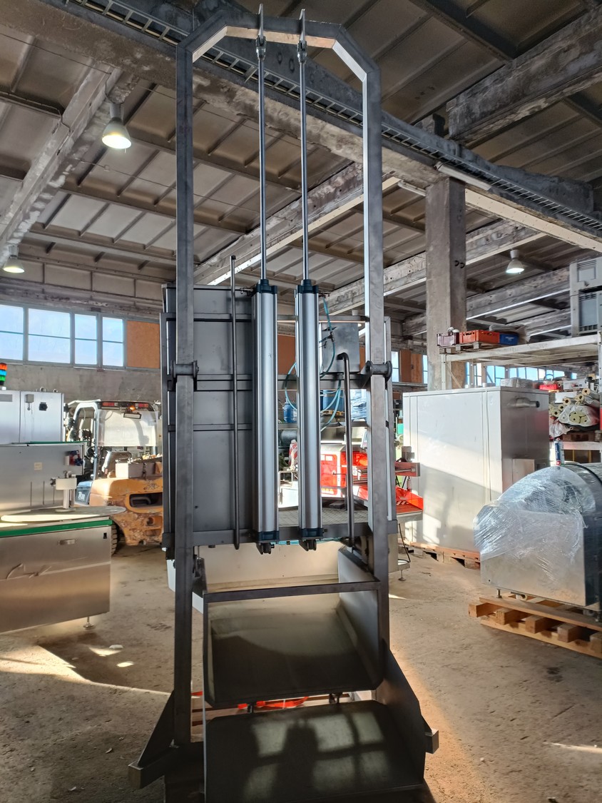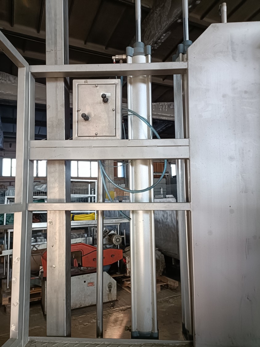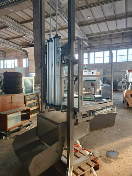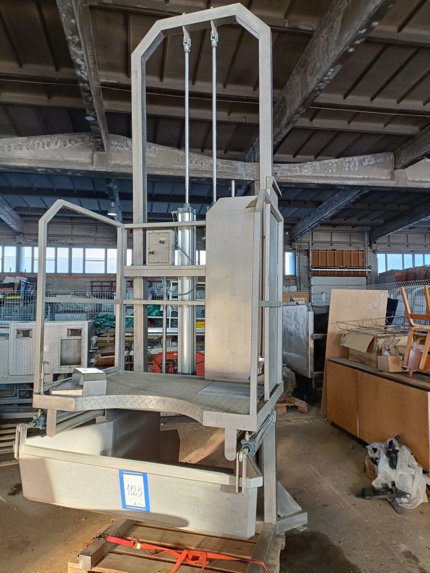 S/s pneumatic instestines platform, adjustable in height, dimensions: 2000 mm x 1500 mm x 3650 mm. Never used.