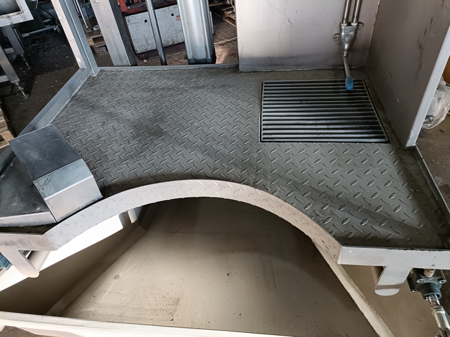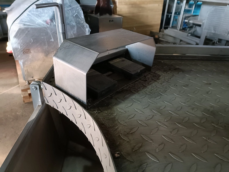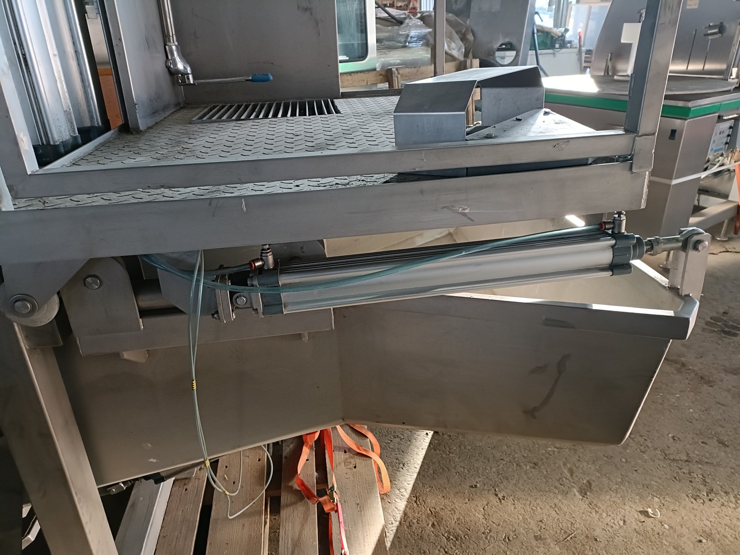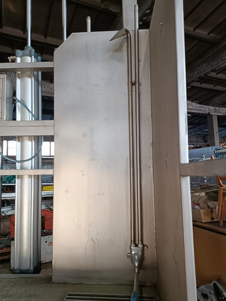 S/s pneumatic instestines platform, adjustable in height, dimensions: 2000 mm x 1500 mm x 3650 mm. Never used.