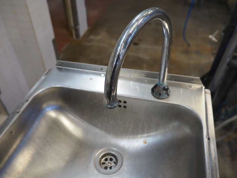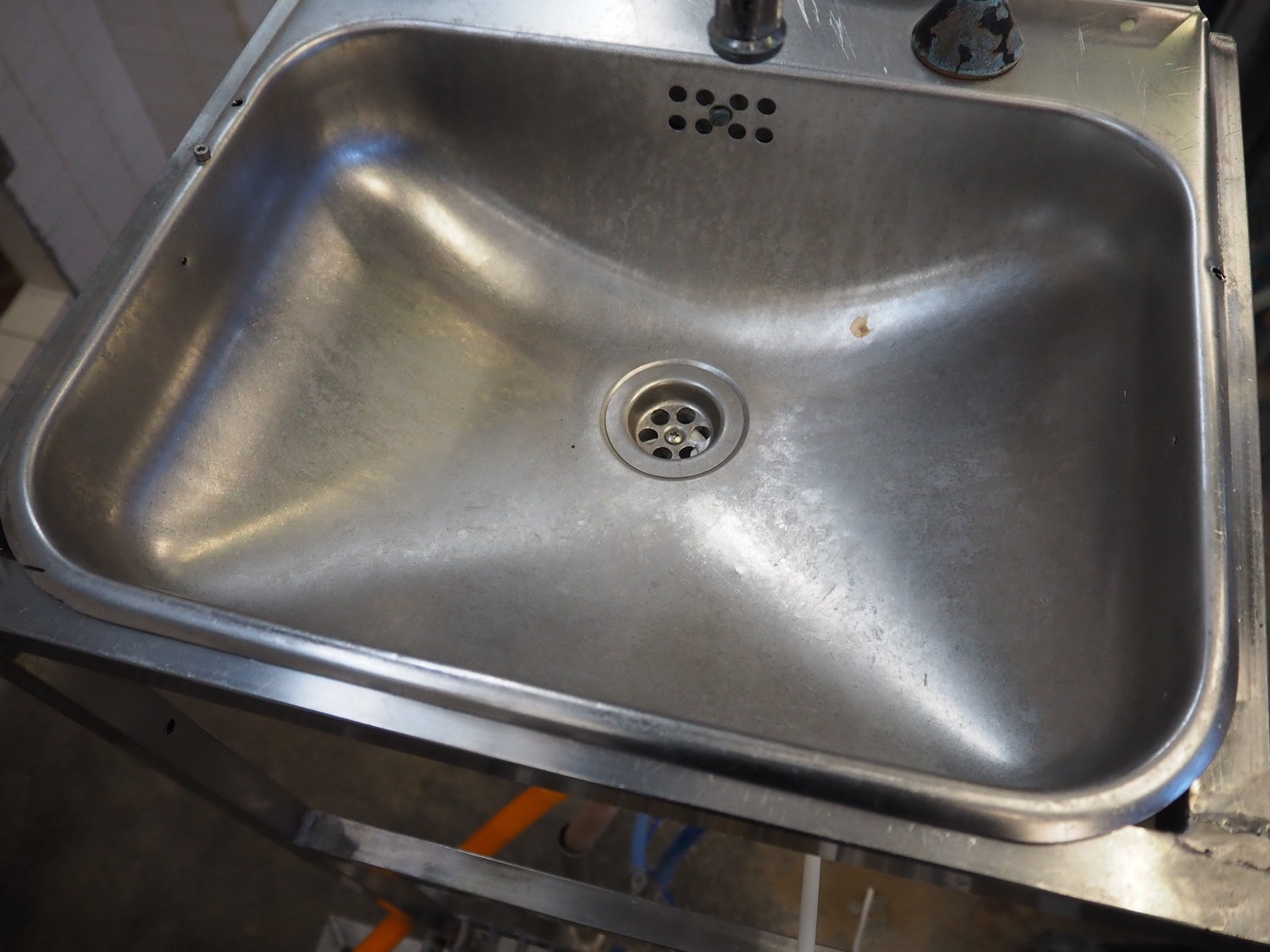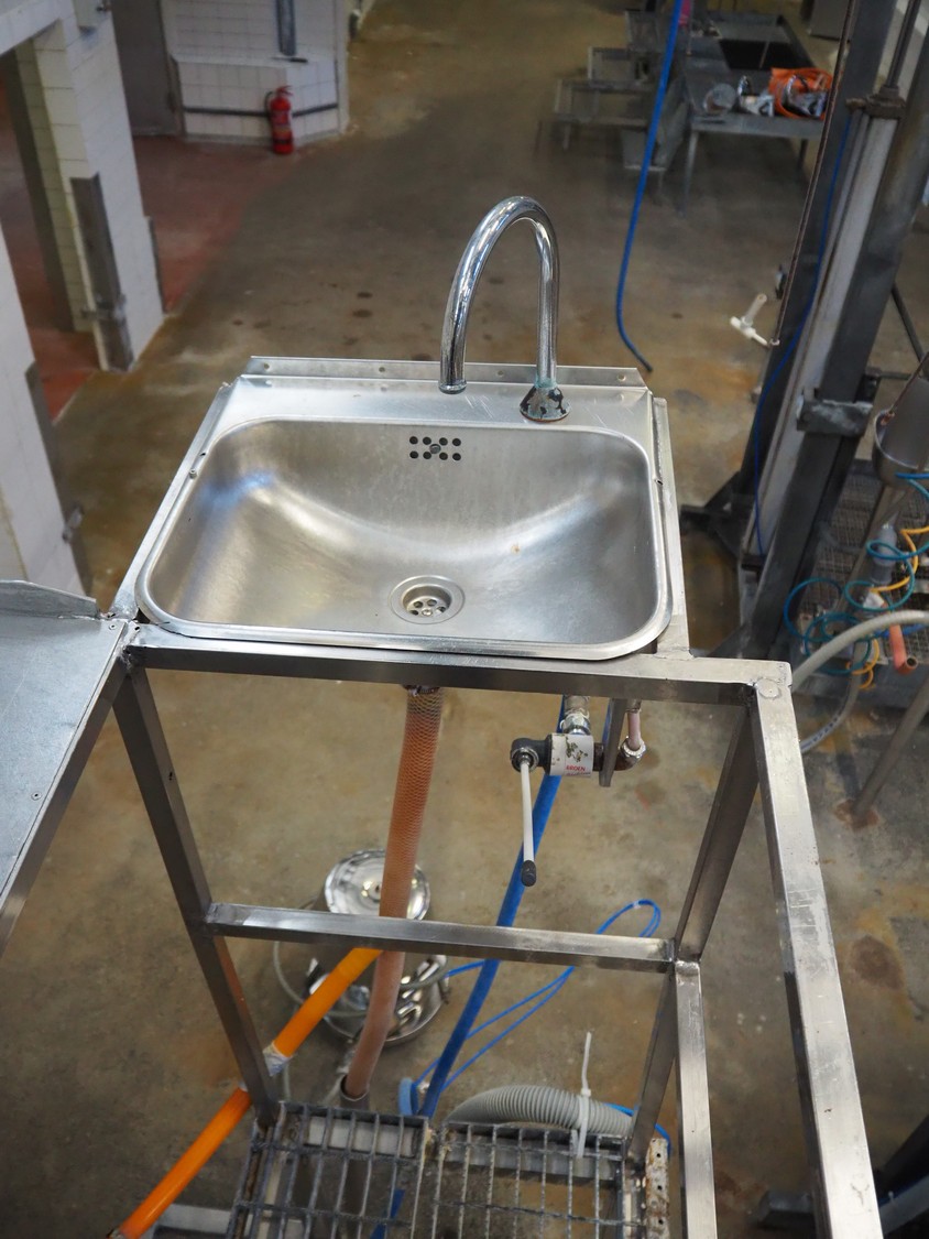 Galvanized steel platform with s/s sink, knee control, working height: 1300 mm, total dimensions: 2350 mm x 950 mm x 2770 mm.