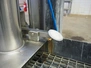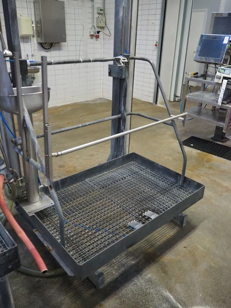 Steel working platform with s/s sink, foot control, height adjustable, dimensions platform: 1200 mm x 800 mm, total dimensions: 1300 mm x 1200 mm x 3550 mm.