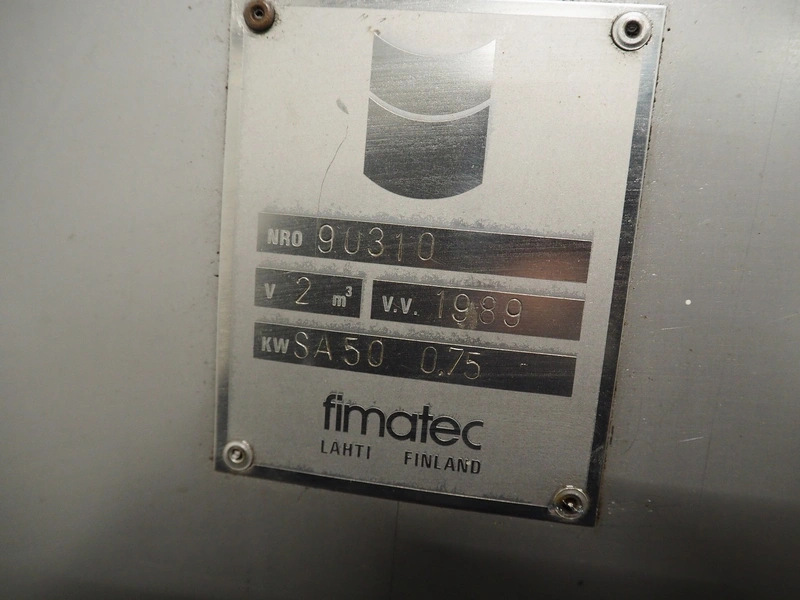 Fimatec double jacketed s/s tank, number: 90310, year of construction: 1989, 0.75 kW, volume: 2000 litre, dimensions: 1950 mm x 1600 mm x 2000 mm.