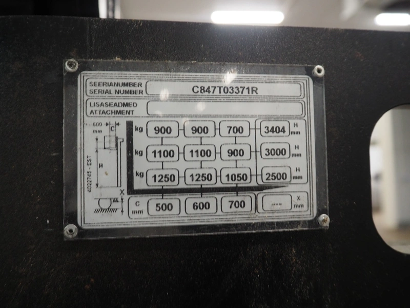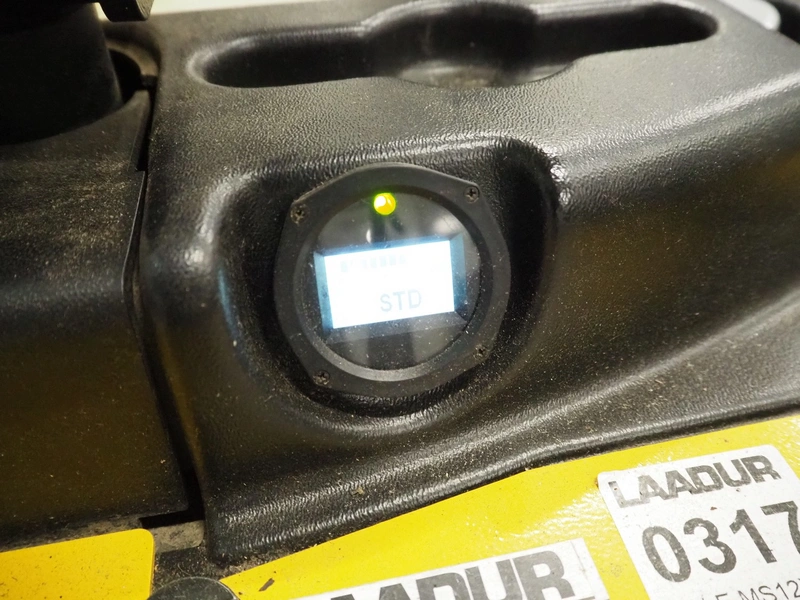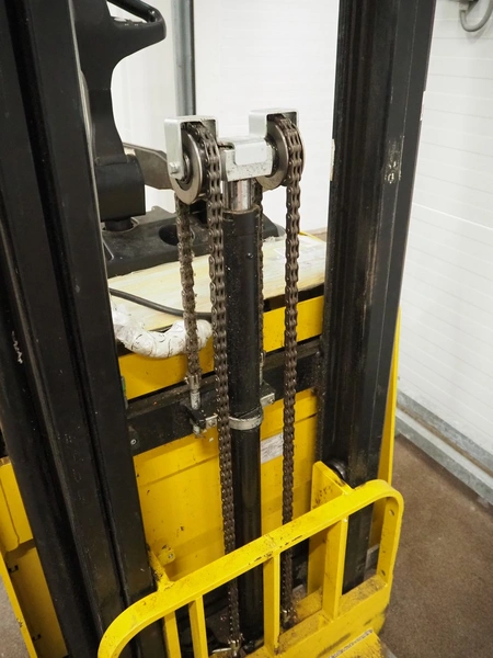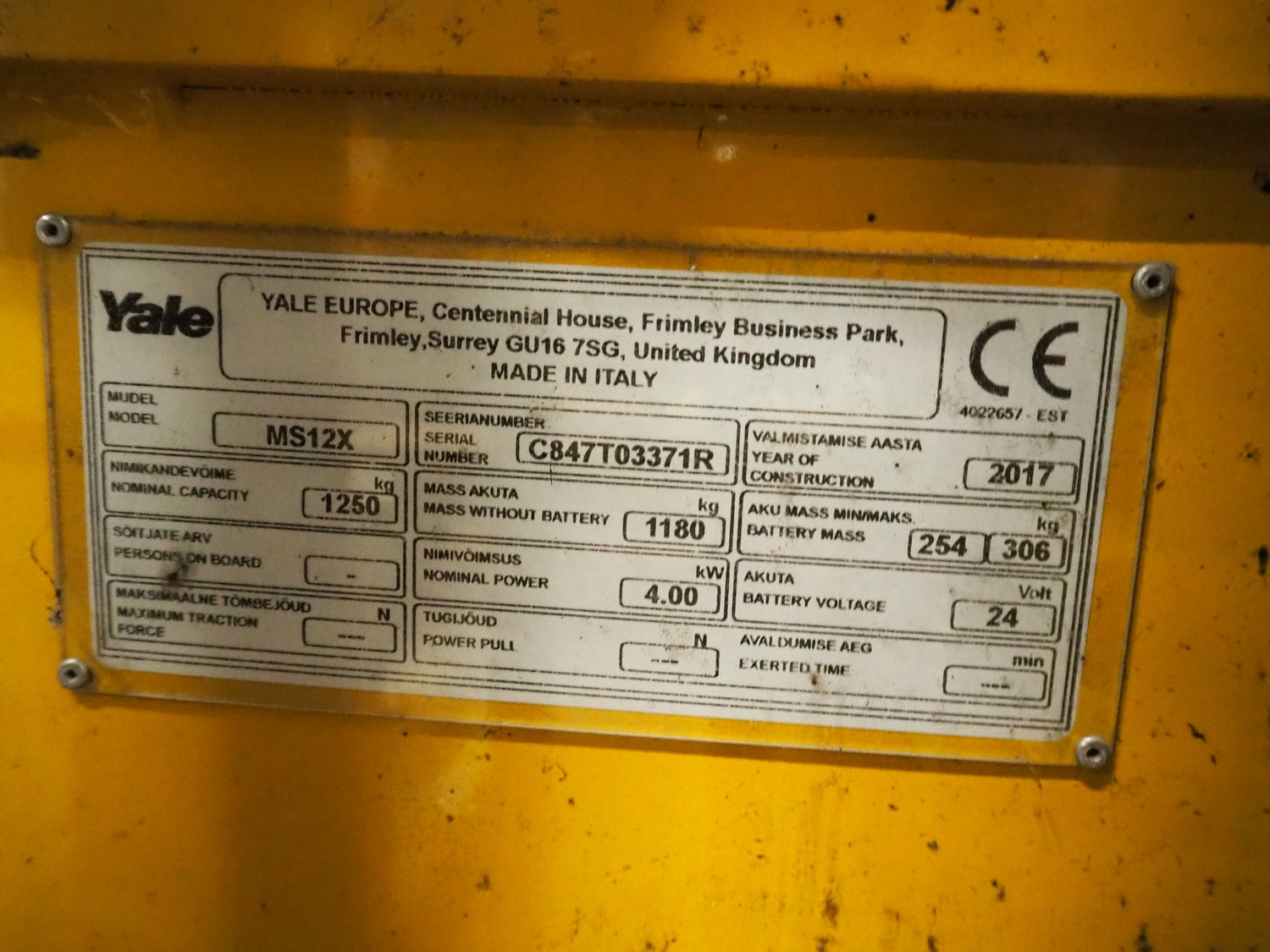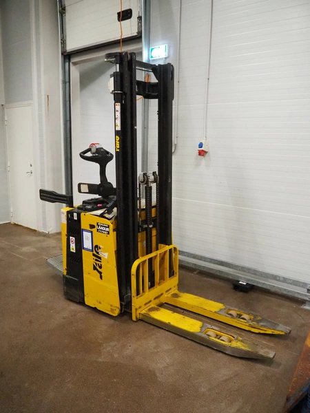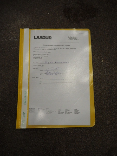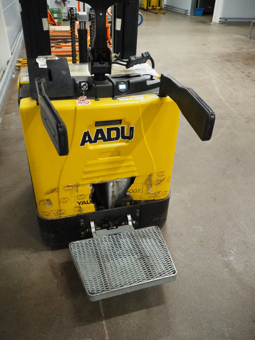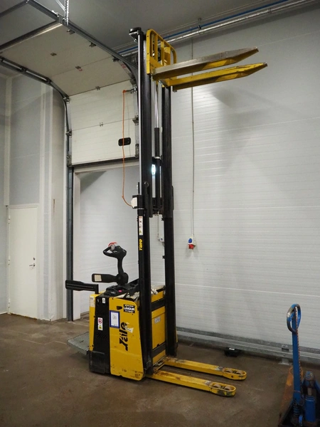 Yale Europe electrical pallet lifter, model: MS12X, serial number: C847T03371R, year of construction: 2017, nominal capacity: 1200 kg, weight without battery: 1180 kg, battery weight: 254/306 kg, nominal power: 4.00 kW, battery voltage: 24 V, working hours: 2633 h, fork length: 1150 mm, maximum lifting height: 3400 mm, total dimensions: 2550 mm x 900 mm x 2250 mm. Including Micropower AB battery charger.