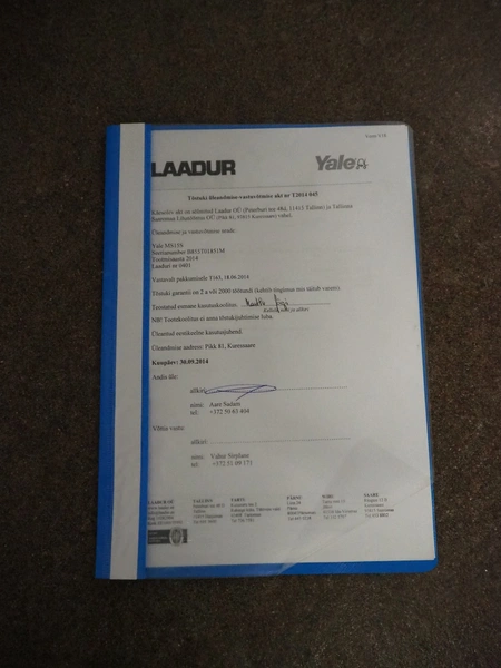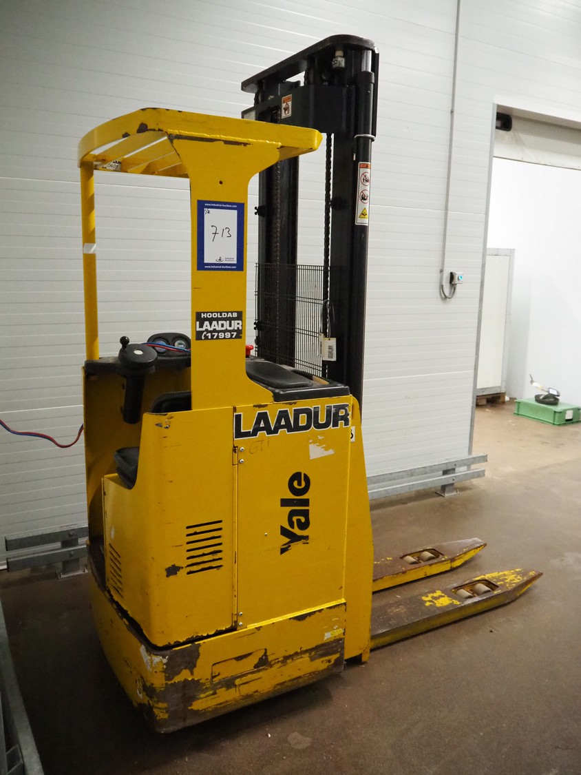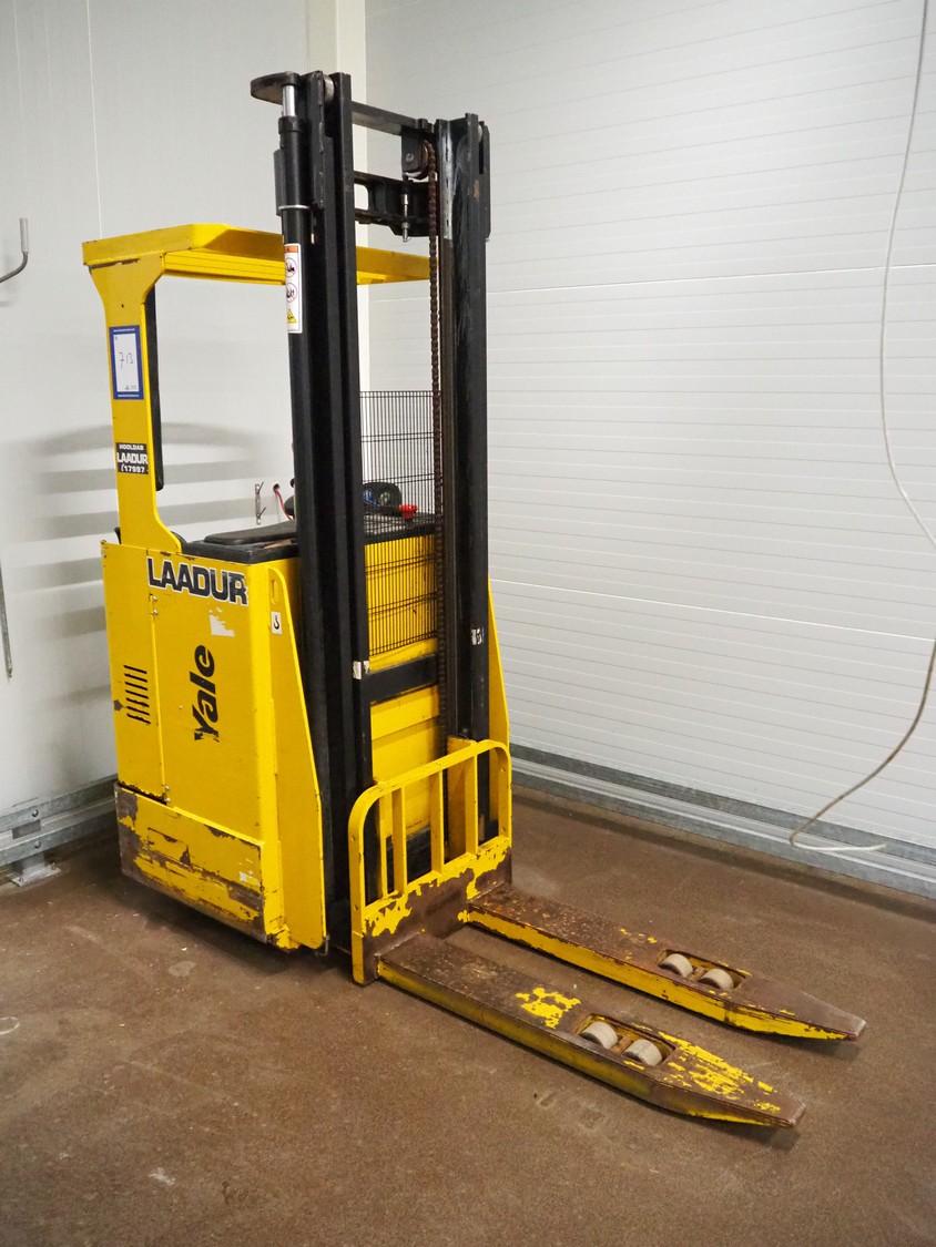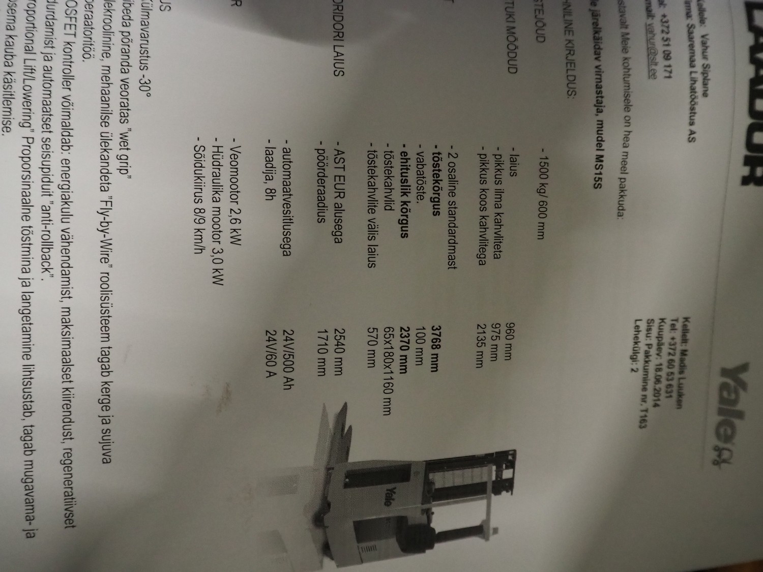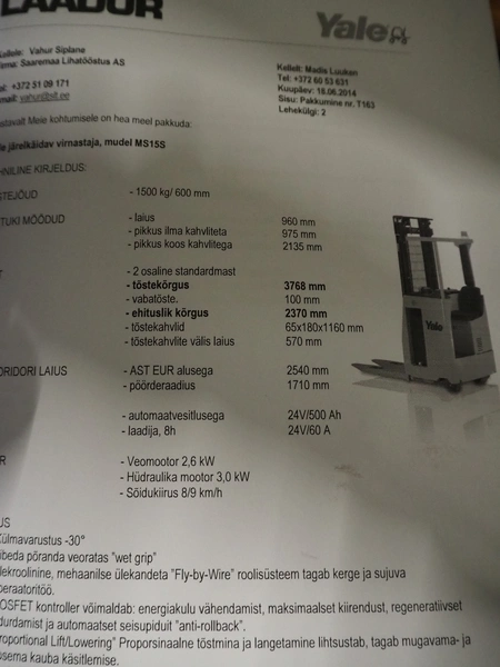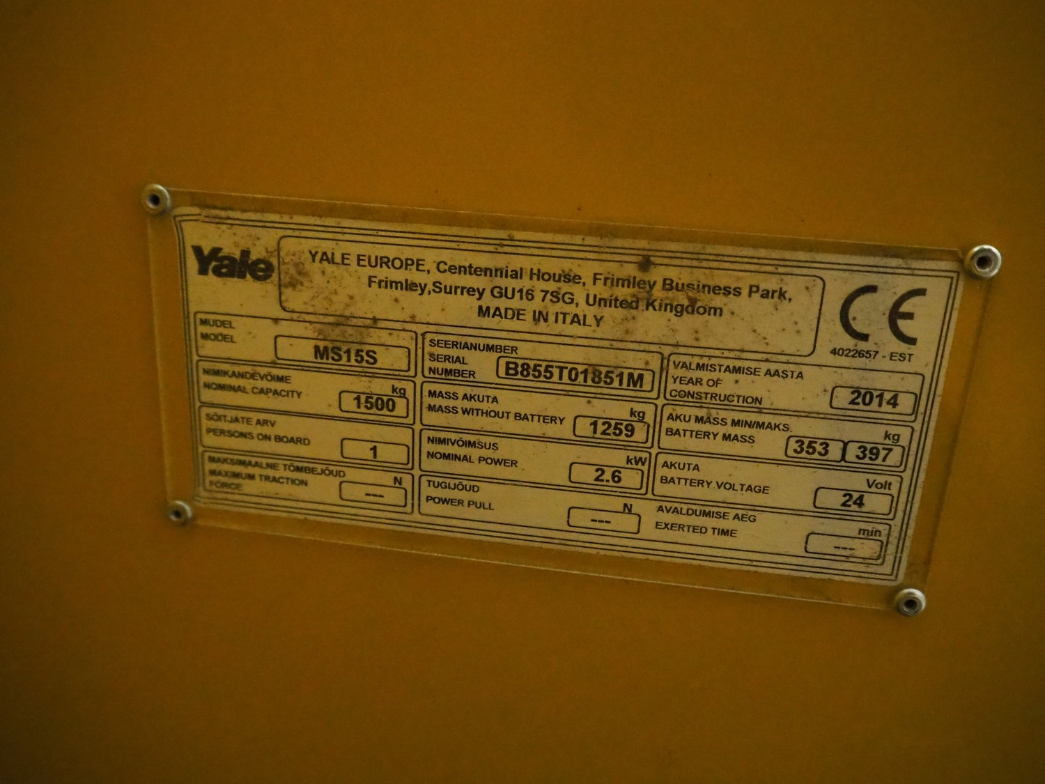 Yale Europe electrical pallet lifter, model: MS15S, serial number: B855T01851M, year of construction: 2014, nominal capacity: 1500 kg, weight without battery: 1259 kg, battery weight: 353/397 kg, nominal power: 2.6 kW, battery voltage: 24 V, fork length: 1160 mm, maximum lifting height: 3800 mm, total dimensions: 2300 mm x 950 mm x 2350 mm. Including Micropower AB battery charger. Technical condition unknown.