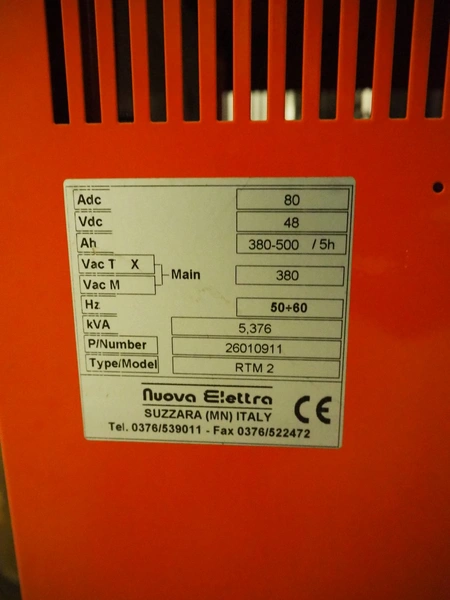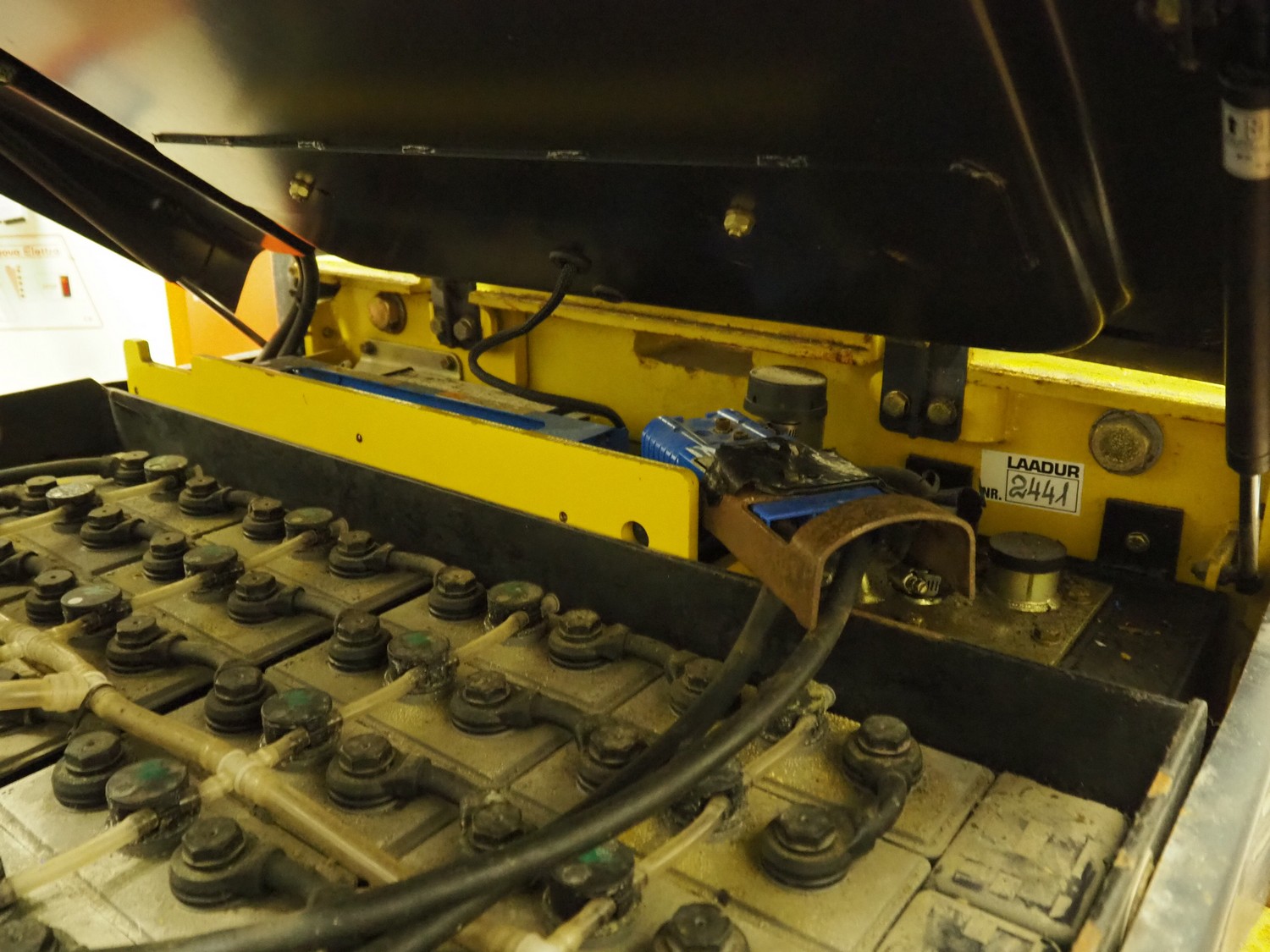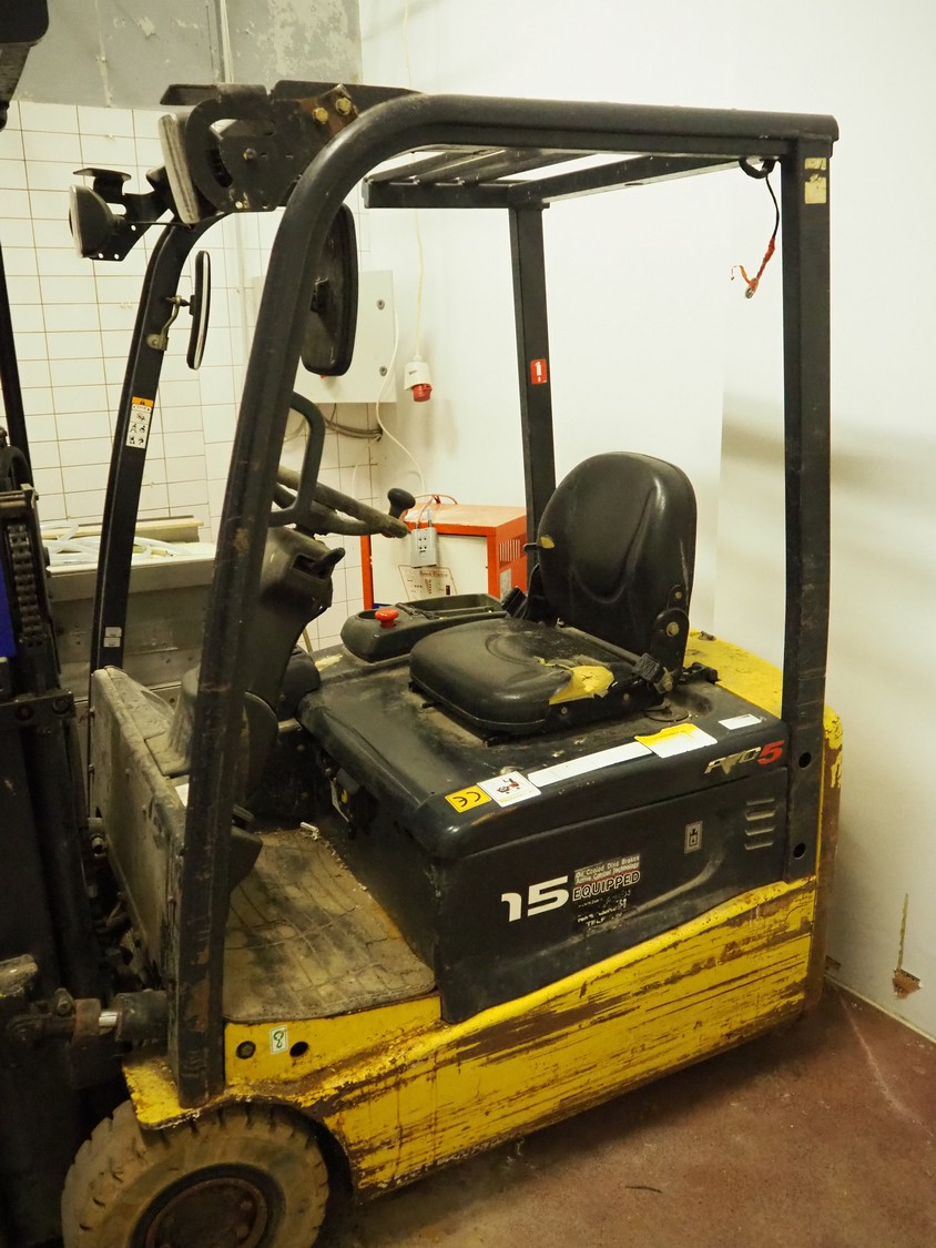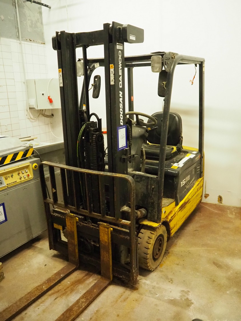Daewoo electrical forklift, capacity: 1500 kg, fork length: 1200, total dimensions: 3200 mm x 1100 mm x 2120 mm. Including Nuova Elettra battery charger, model: RTM 2, number: 26010911, dimensions battery charger: 500 mm x 400 mm x 1040 mm. Technical condition unknown.