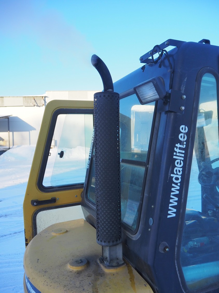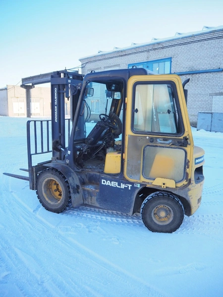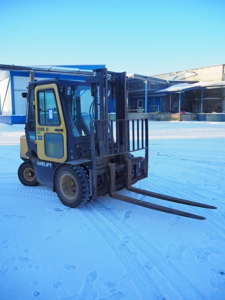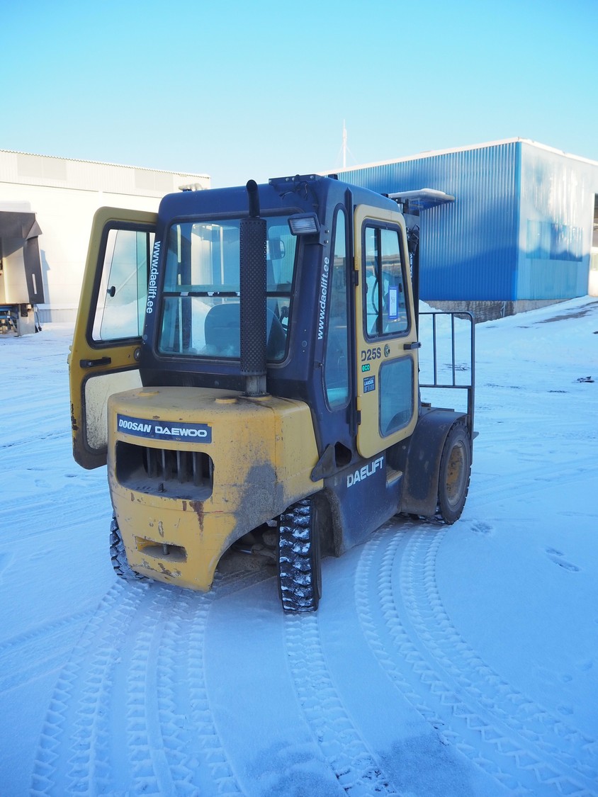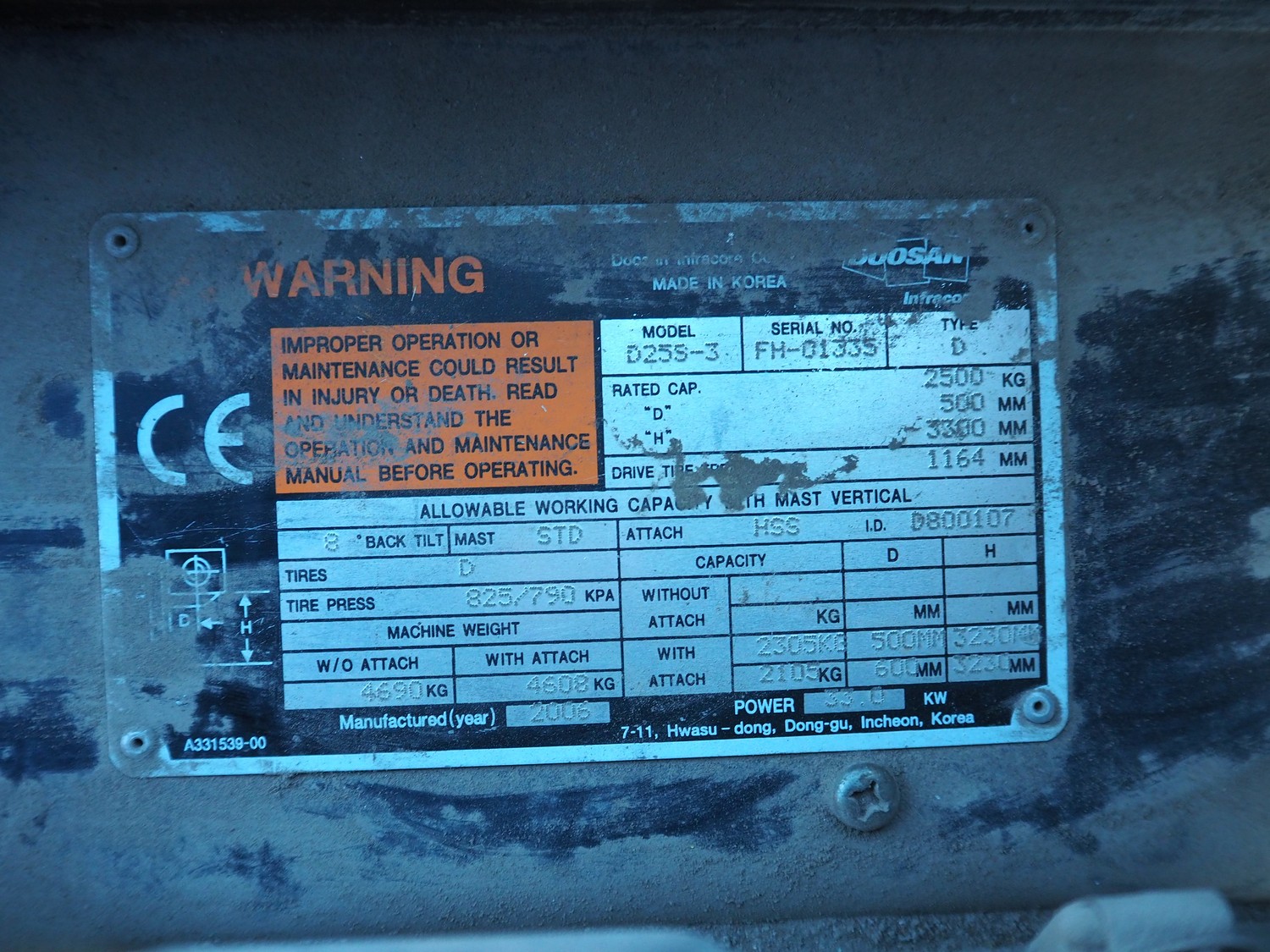 Doosan forklift truck, model: D25S-3, serial number: FH-01335, year of construction: 2006, rated capacity: 2500 kg, maximum lifting height: 3300 mm, fork length: 1500 mm, fuel: diesel, total dimensions: 4200 mm x 1600 mm x 2300 mm. Technical condition unknown.