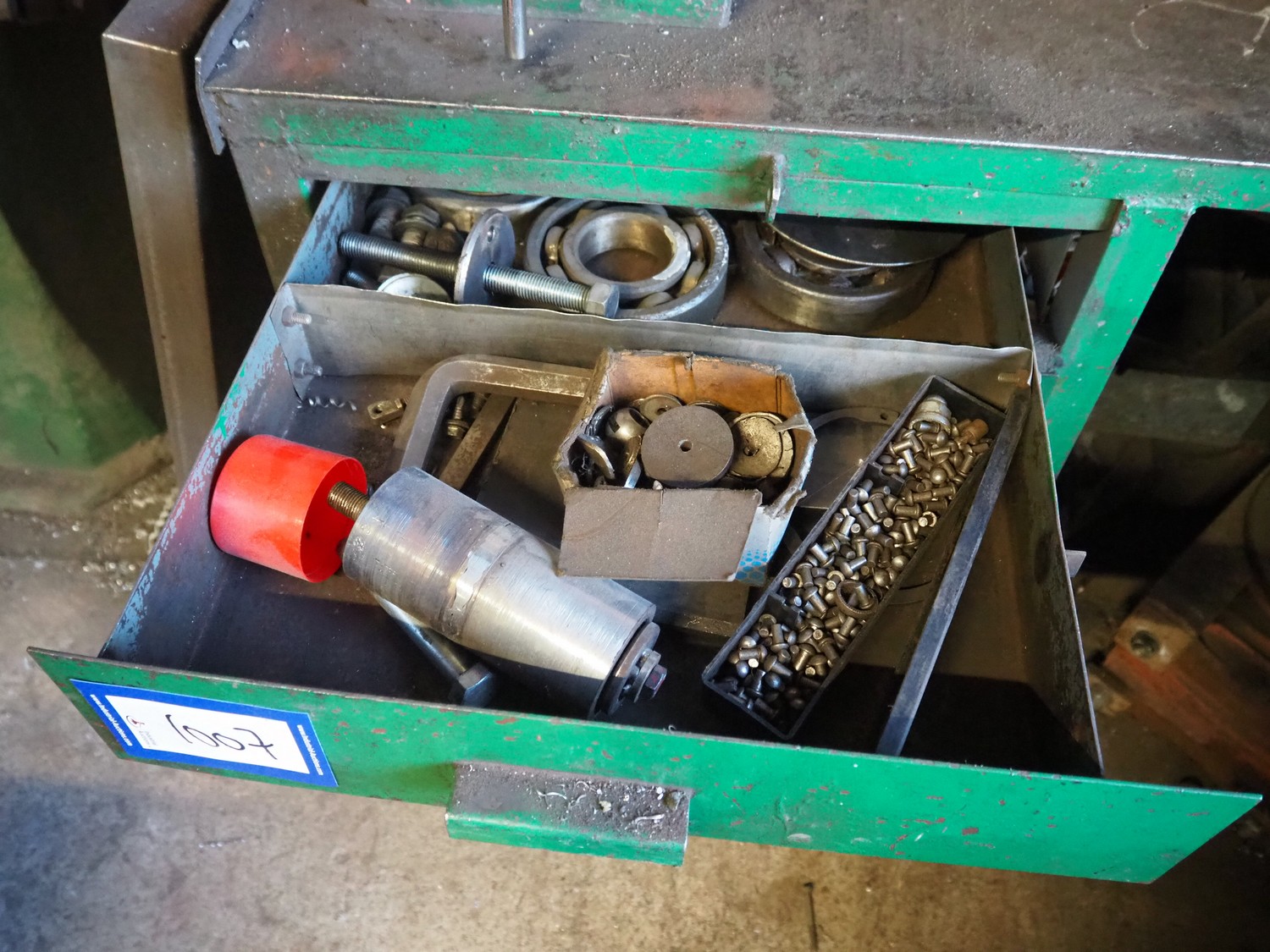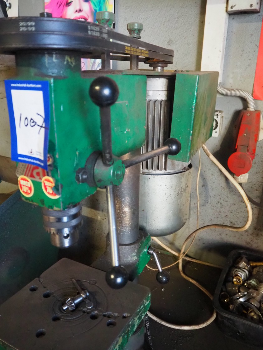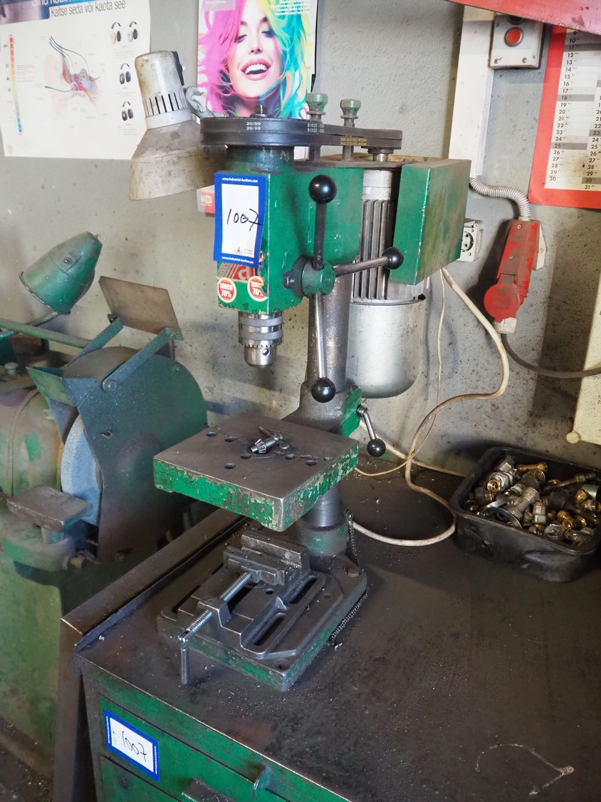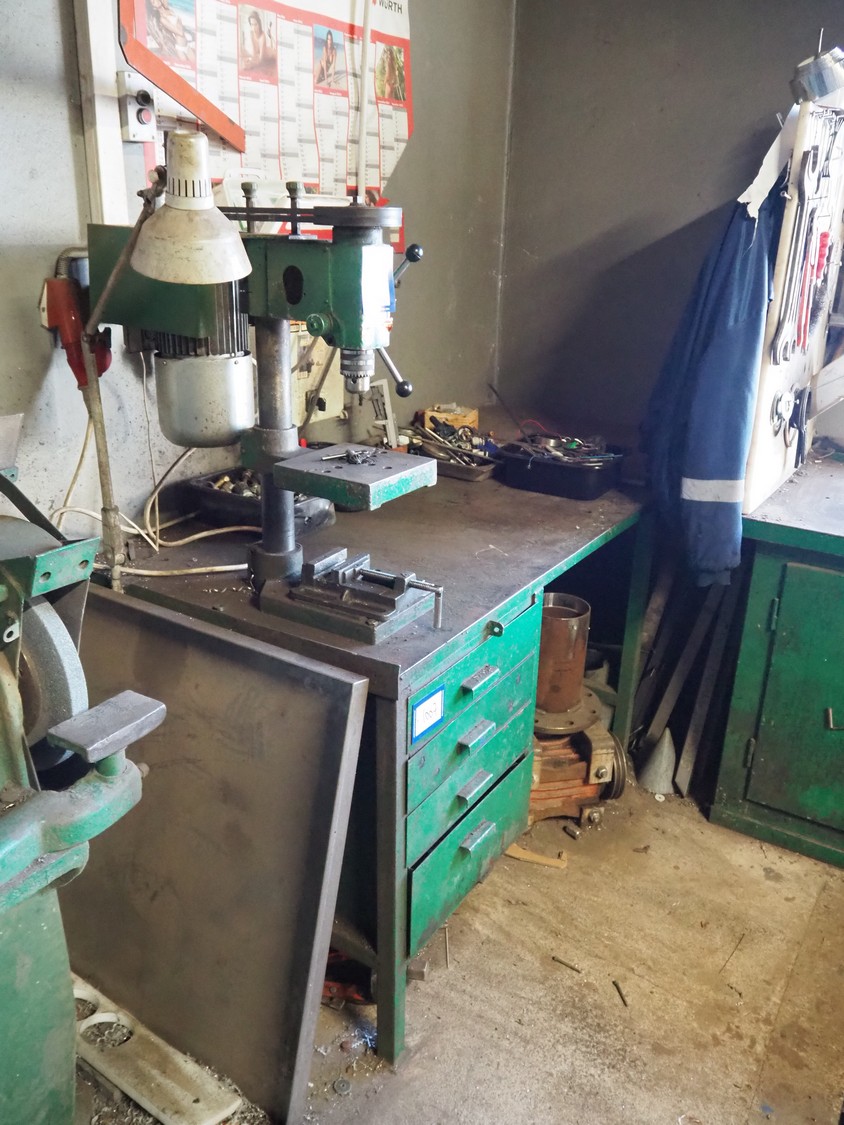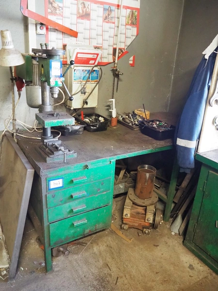 Steel workbench with drilling machine, dimensions: 1900 mm x 800 mm x 1650 mm.