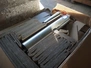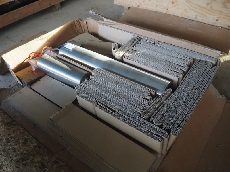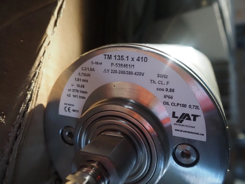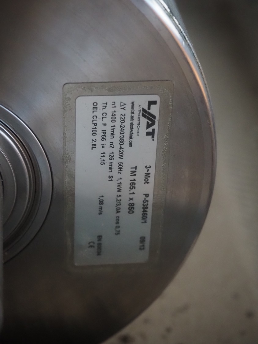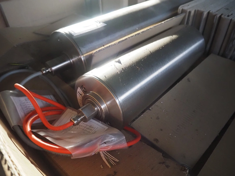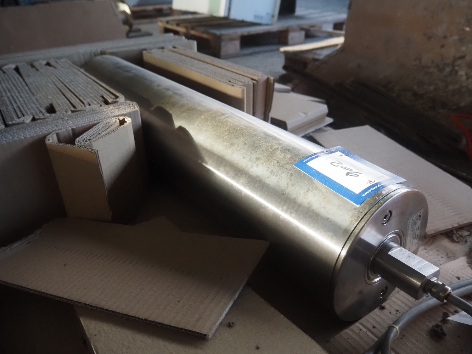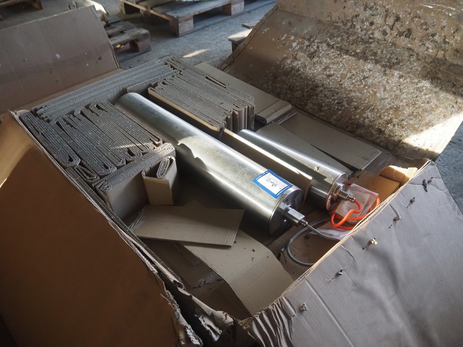 Pallet with 2 LAT Antriebtechnik s/s drum motors, dimensions: Ø 150 mm 850 mm and Ø 130 mm 410 mm.