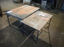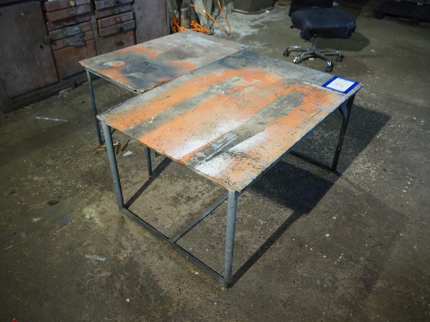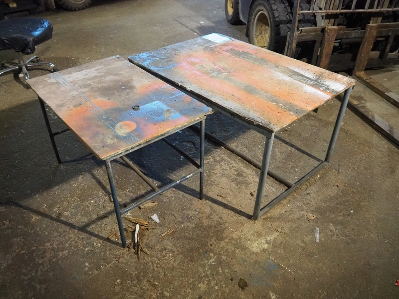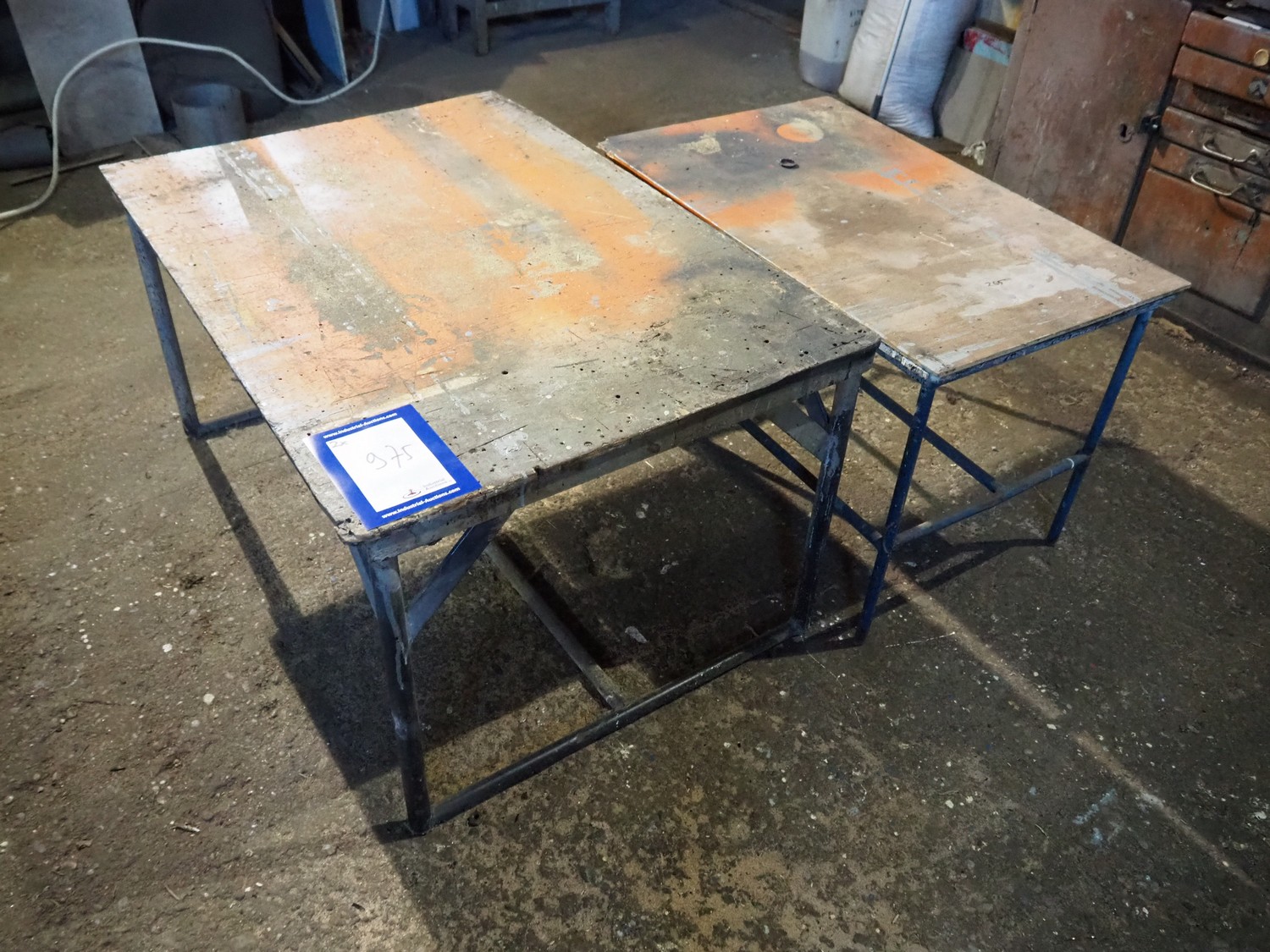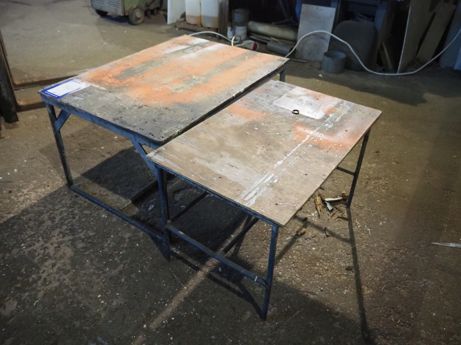 2 steel tables with wooden worktop, dimensions: 1170 mm x 830 mm x 620 mm and 950 mm x 600 mm.
