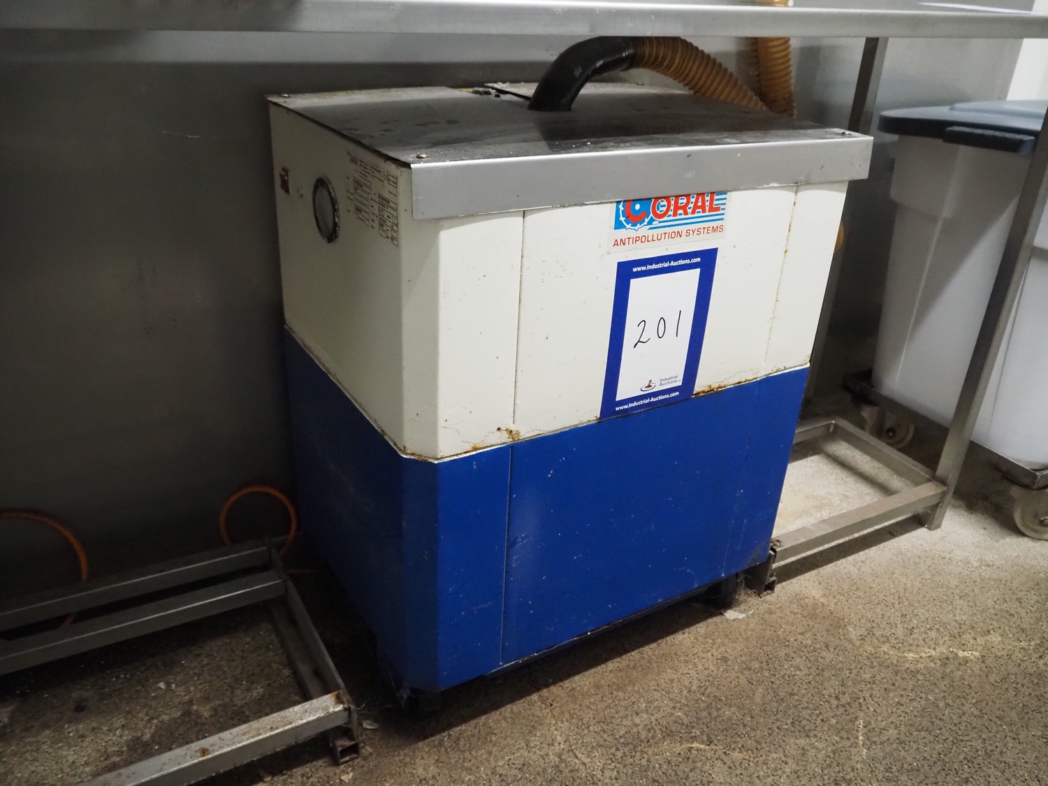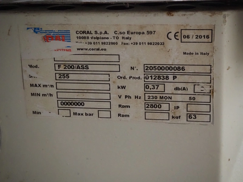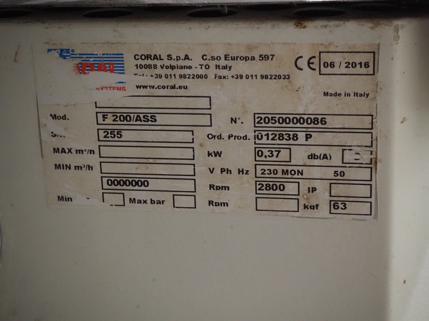 Coral S.p.A. air filtration system, model: F 200/ASS, number: 2050000086, year of construction: 06/2016, 230 V, 50 Hz, 0.37 kW, dimensions: 600 mm x 450 mm x 750 mm.