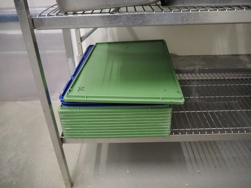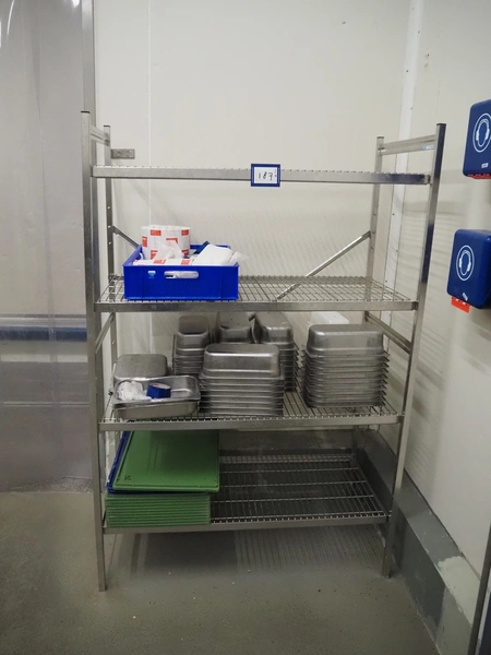 S/s rack with various s/s bins, plastic lids and hygiene material, dimensions rack: 1200 mm x 750 mm x 1800 mm.