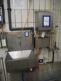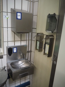 S/s sink with 1 faucet, knee control, dimensions sink: 410 mm x 360 mm x 500 mm, 2 s/s soap dispensers and s/s paper dispenser, dim…€ 75,000 bids03/03/2026 14:50 -