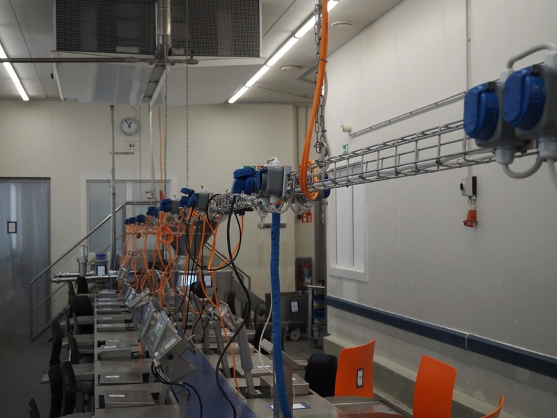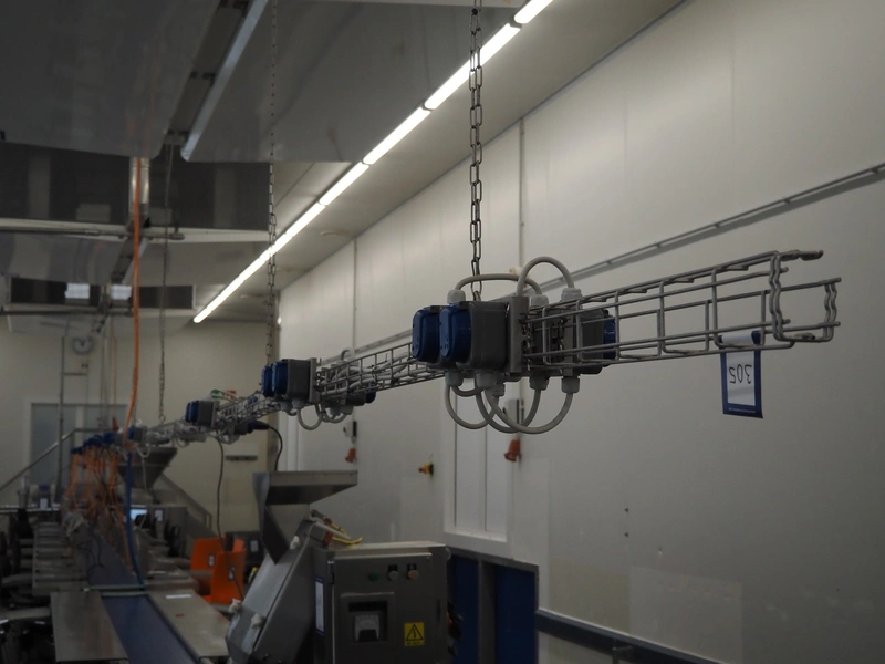 S/s gutter with 45 electric sockets, length: 17000 mm.