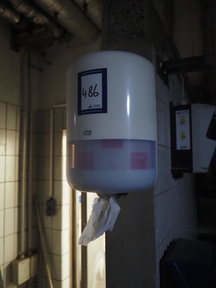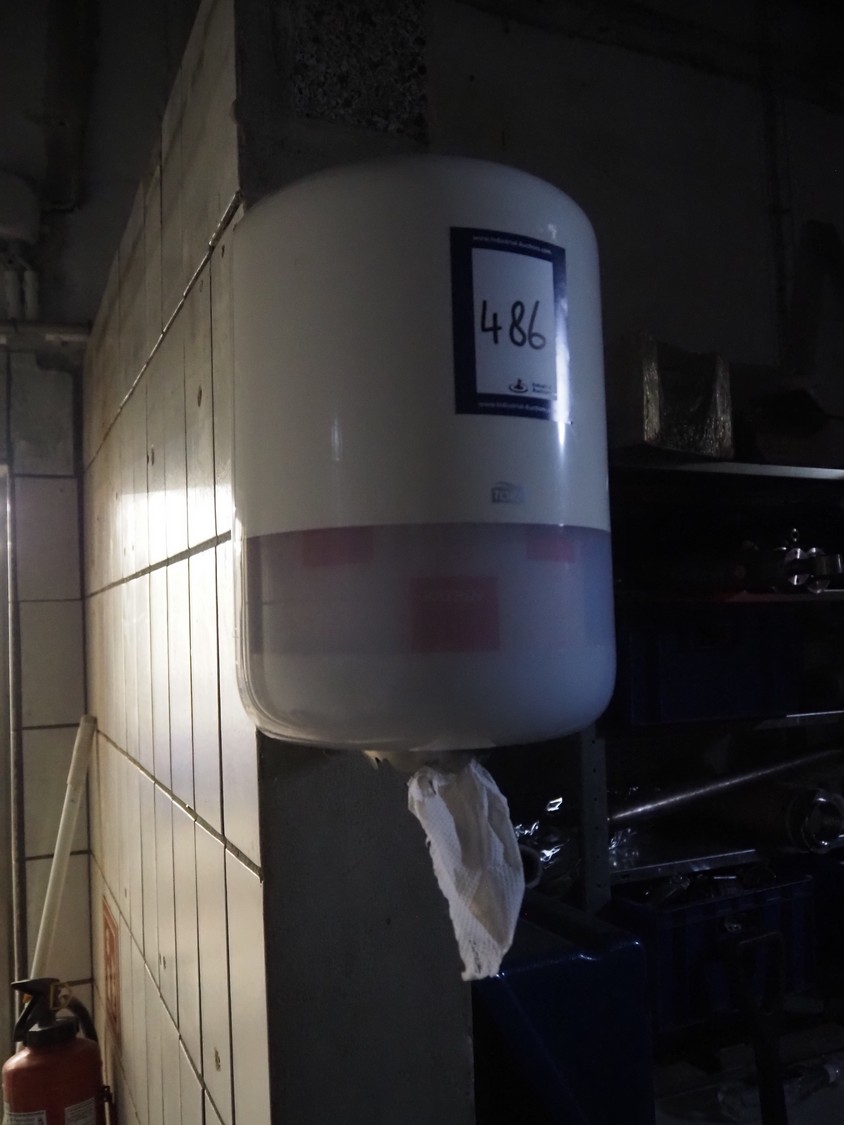 Plastic paper dispenser, dimensions: 250 mm x 240 mm x 350 mm.