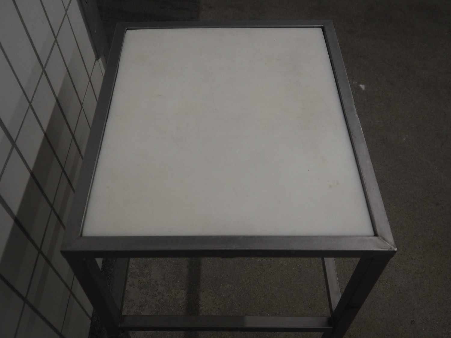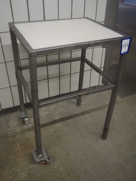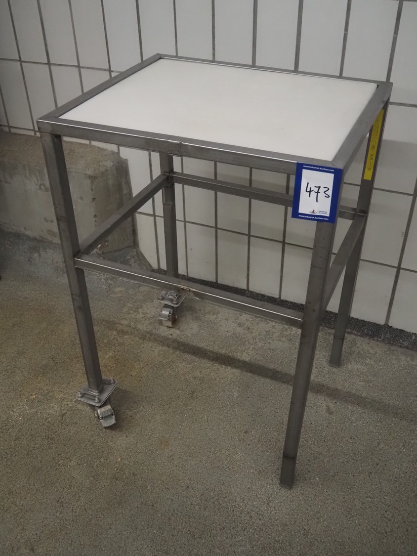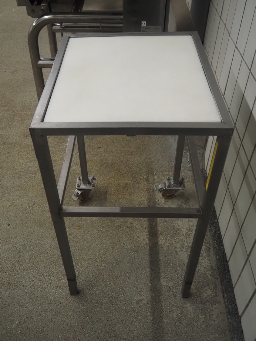 Mobile s/s table with plastic worktop, dimensions: 500 mm x 600 mm x 880 mm.