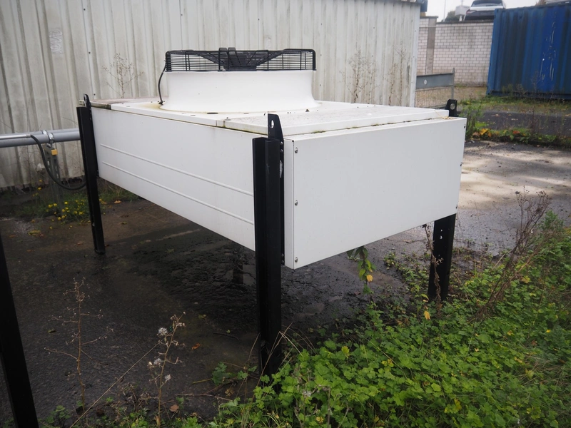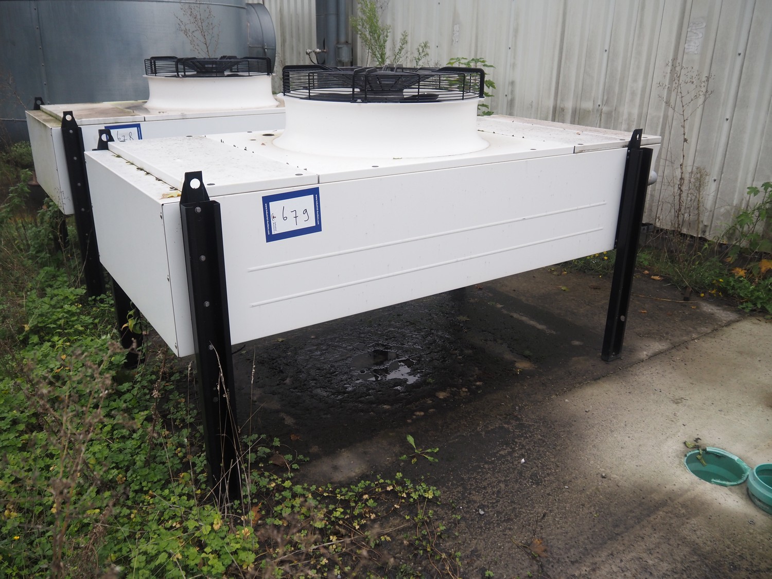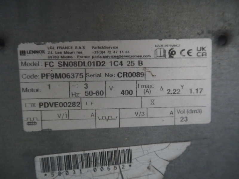 Lennox roof condenser, model: FC SN08DL01D2 1C4 25 B, serial number: CR0089, 400 V, 3 Ph, 50/60 Hz, 1 fan, dimensions: 2320 mm x 1230 mm x 1170 mm.